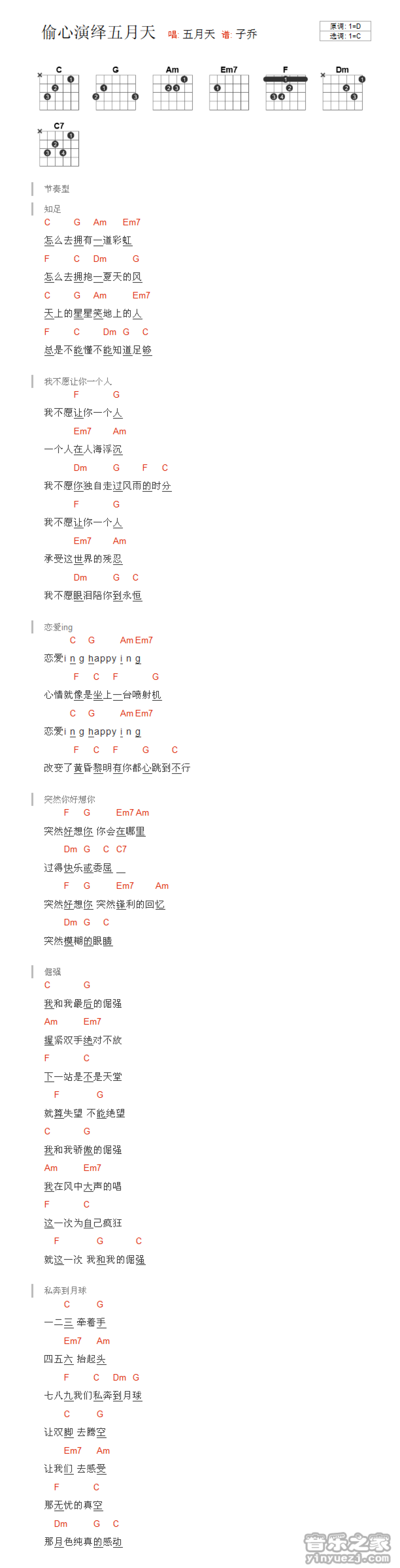 曲谱介绍: C调版五月天《偷心演绎五月天》吉他和弦弹唱谱