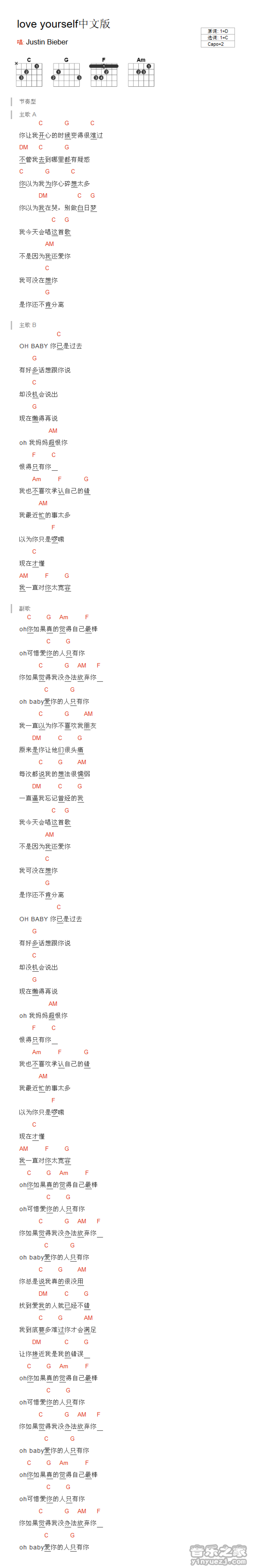 曲谱介绍: C调版JustinBieber《loveyourself中文版》吉他和弦弹唱谱
