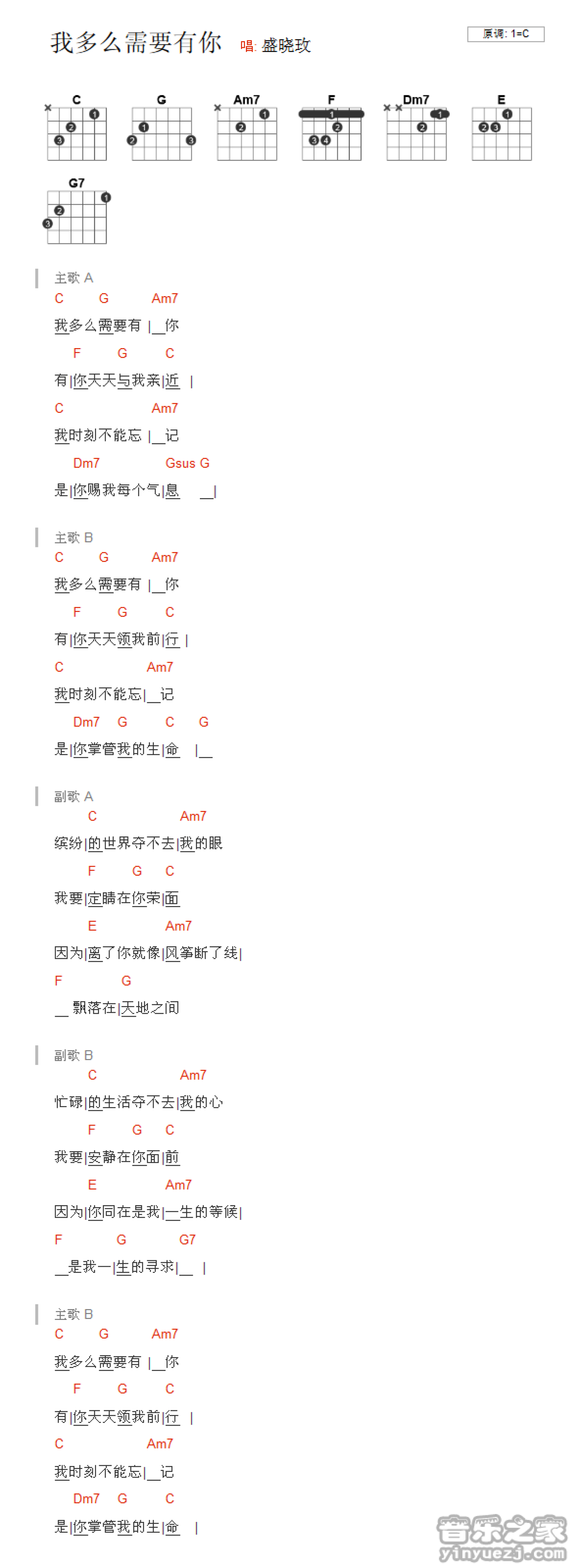 曲谱介绍: C调版盛晓玫《我多么需要你》吉他和弦弹唱谱