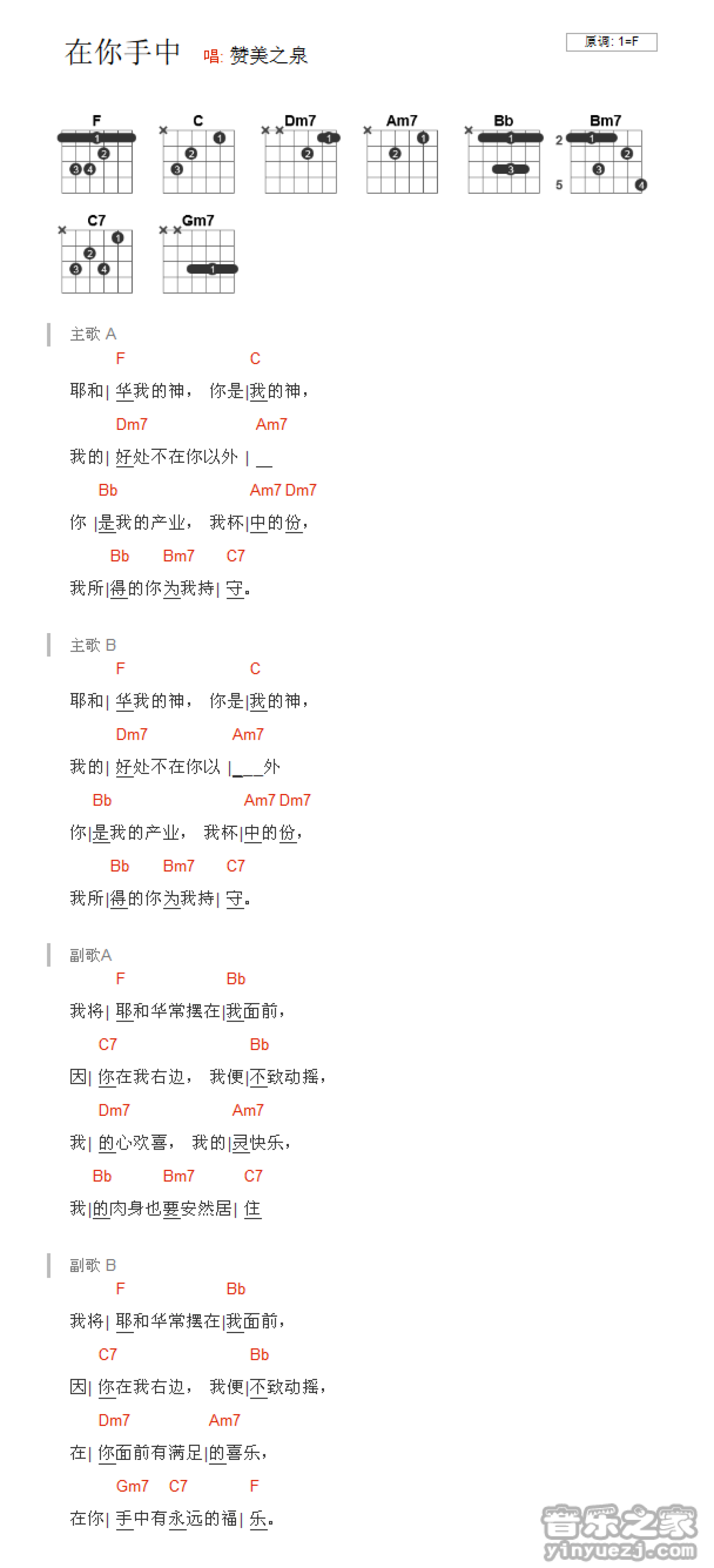 曲谱介绍: F调版赞美之泉《在你手中》吉他和弦弹唱谱