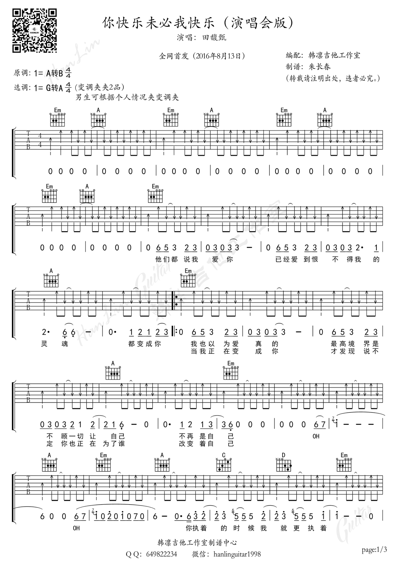 曲谱介绍: G调简单版田馥甄《你快乐未必我快乐》吉他弹唱谱