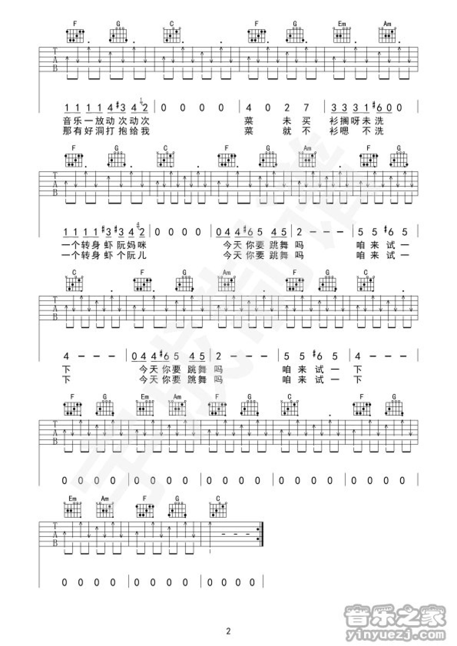 曲谱介绍: C调简单版《今天你要跳舞吗》吉他弹唱六线谱
