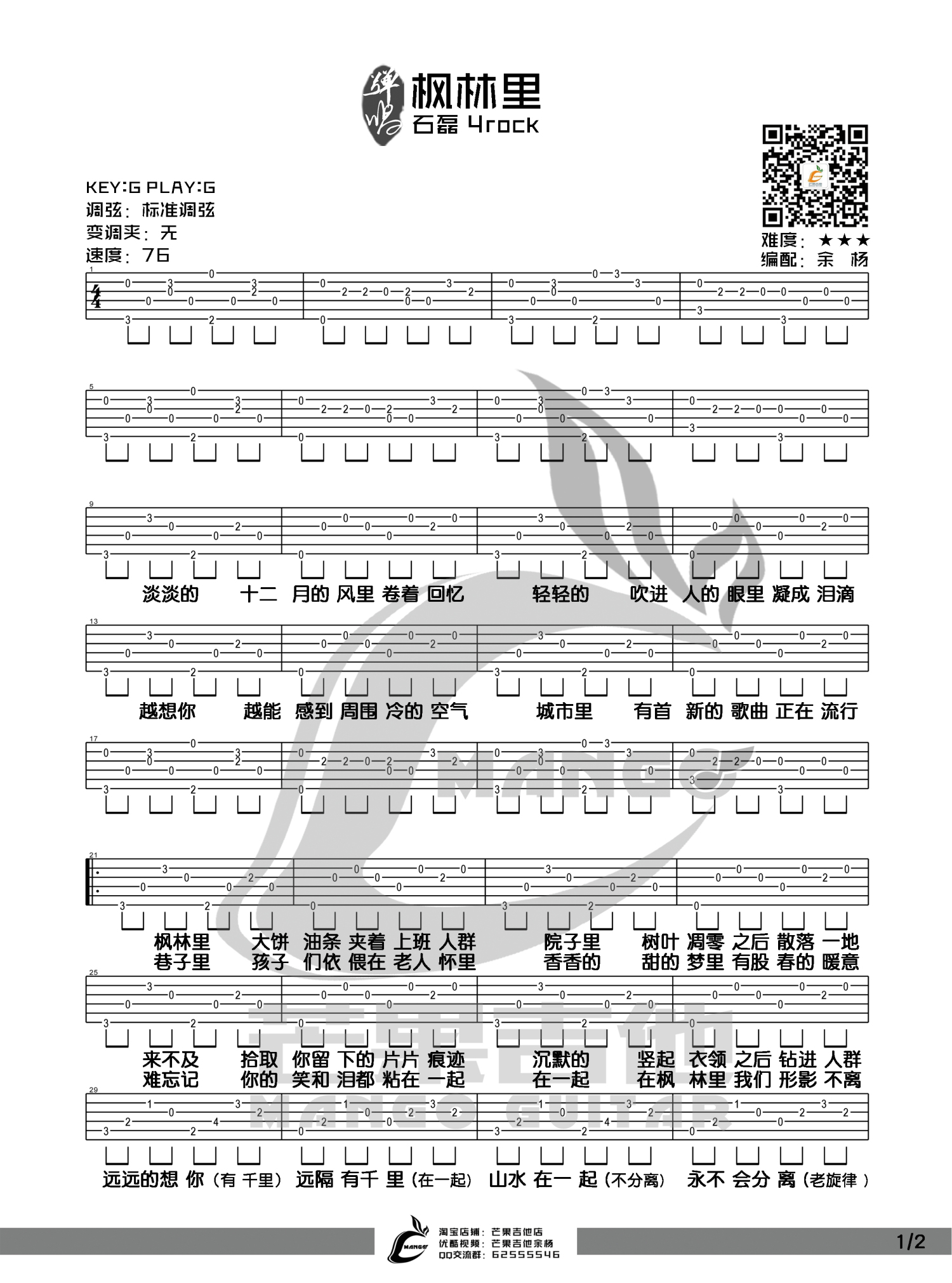 曲谱介绍: G调版4ROCK《枫林里》吉他弹唱六线谱