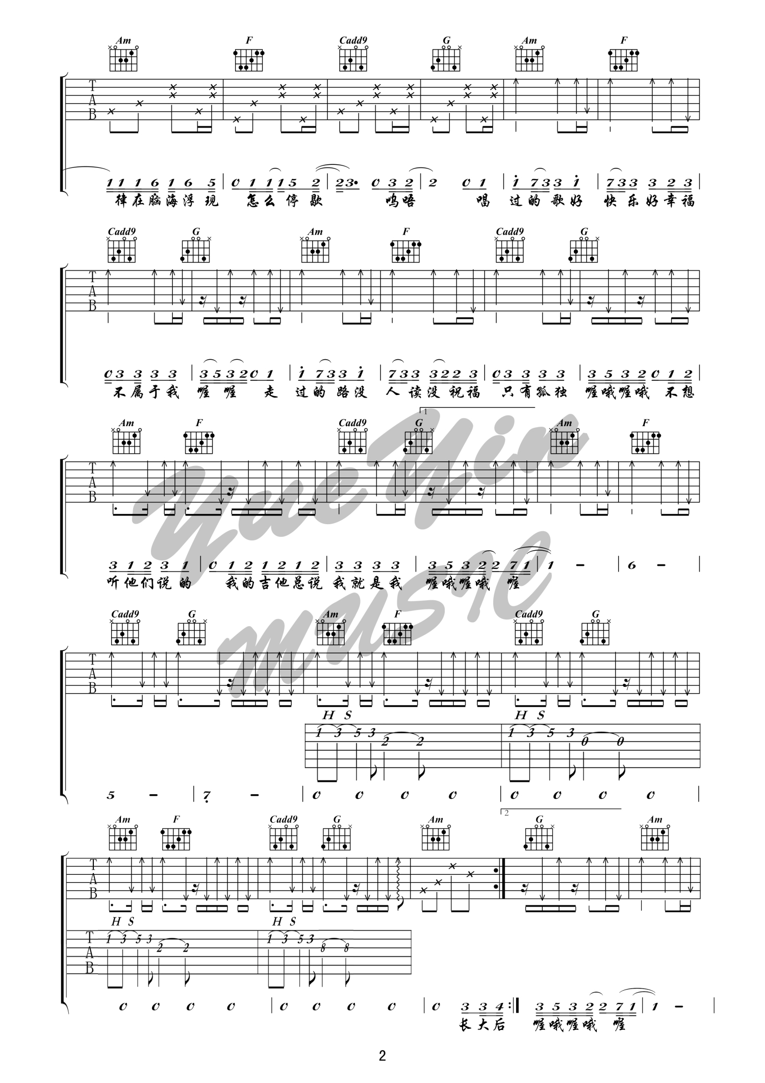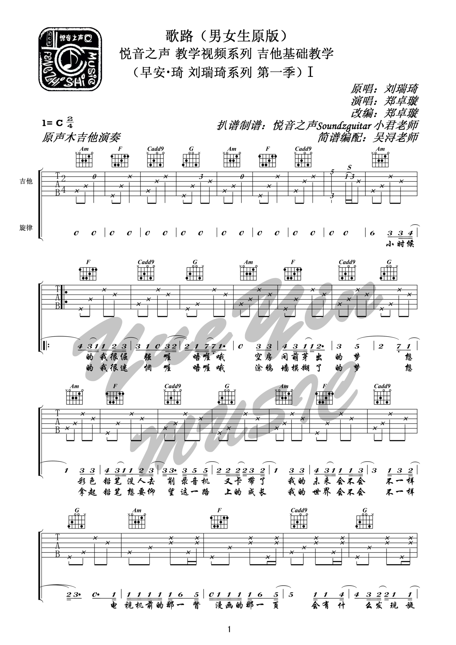 曲谱介绍: C调版《歌路》吉他弹唱六线谱