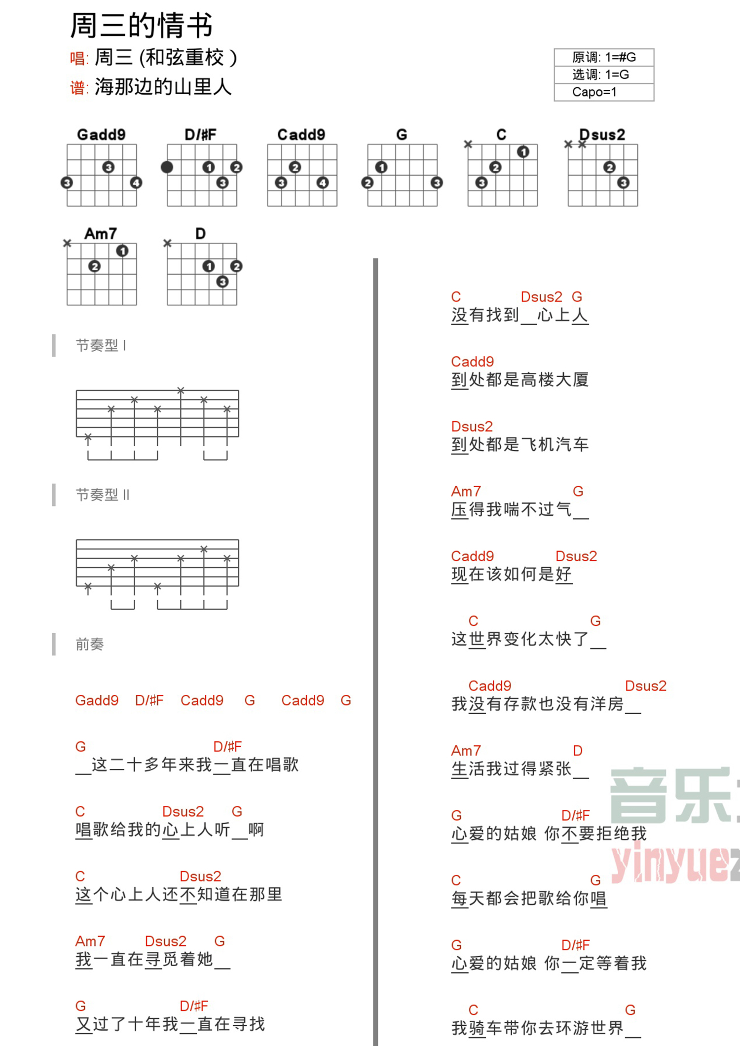 周三的情书吉他谱 - G调吉他弹唱谱 - 和弦谱