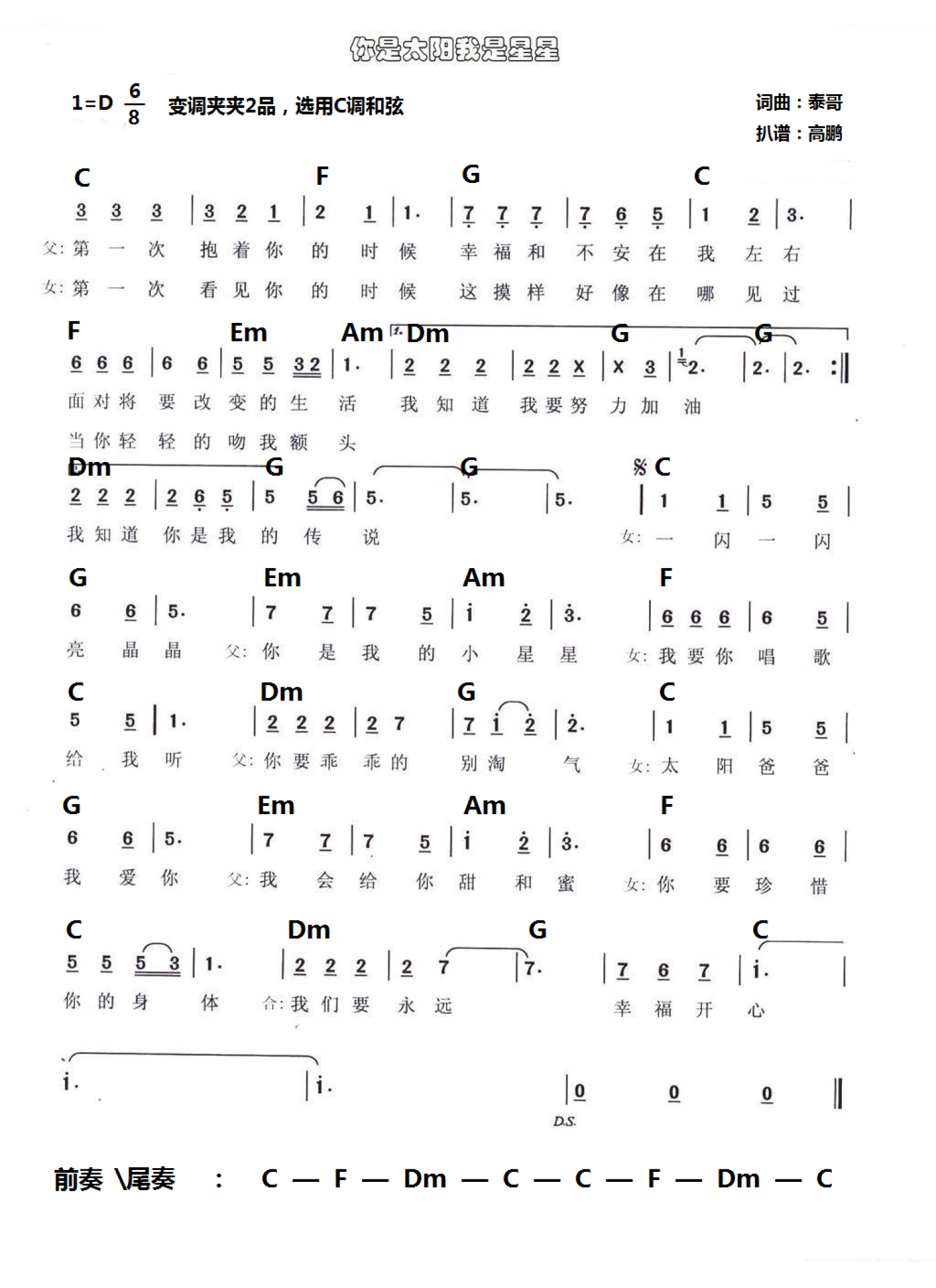 曲谱介绍: 《你是太阳我是星星》吉他和弦弹唱谱