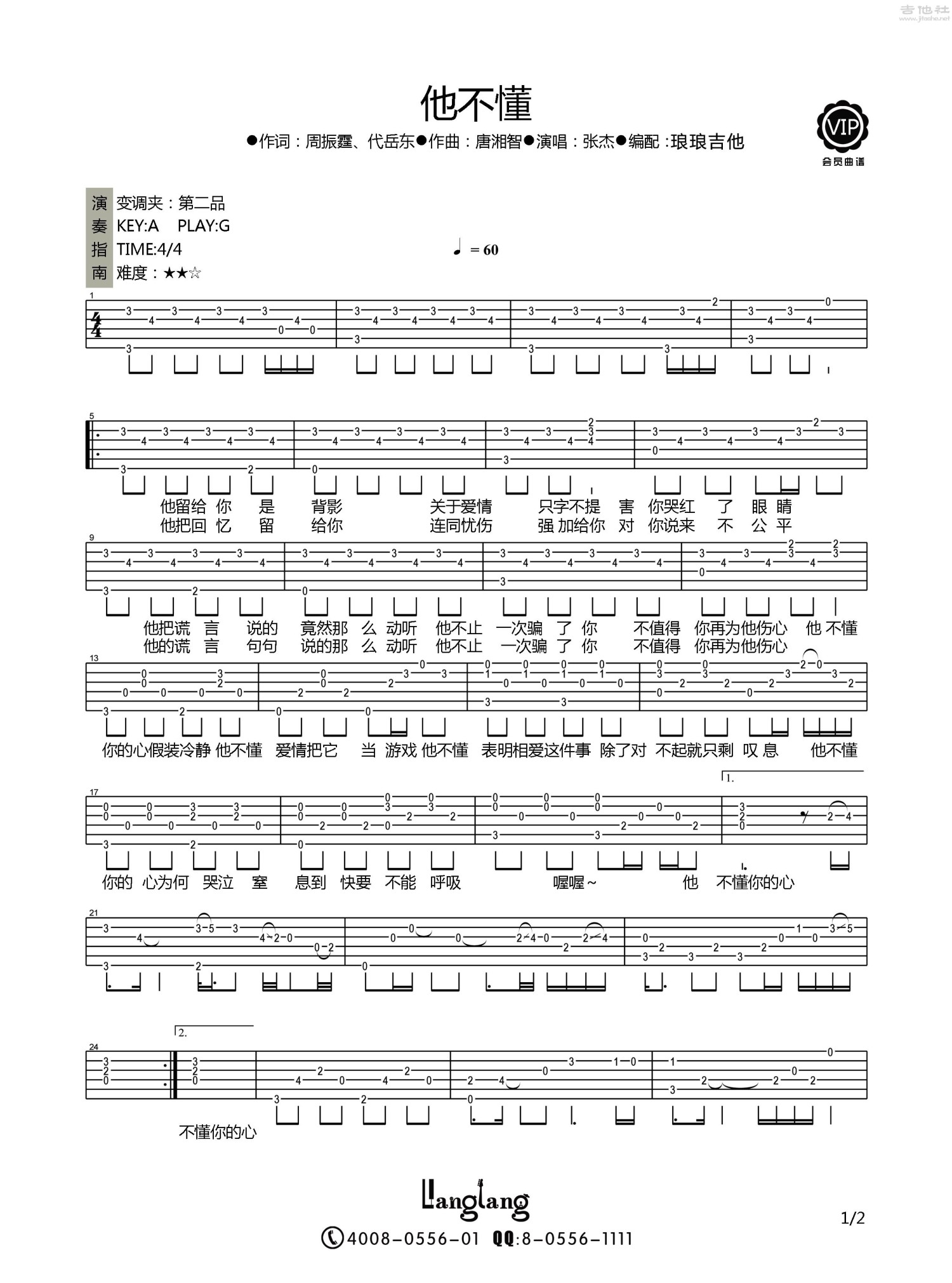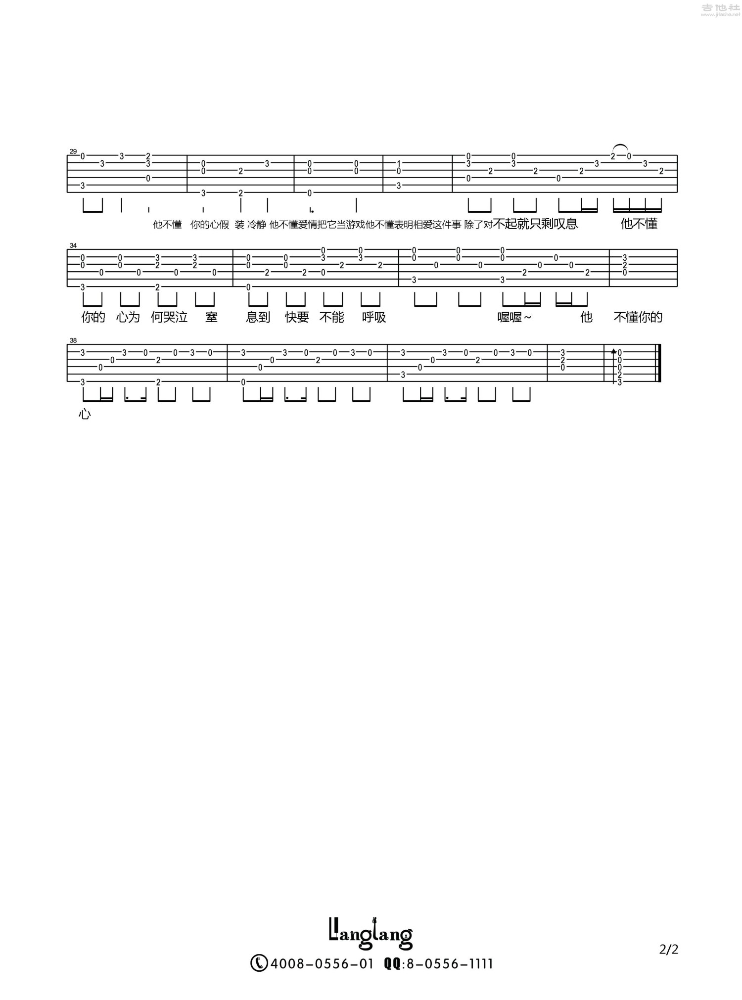 曲谱介绍: G调简单版《不懂》吉他弹唱六线谱