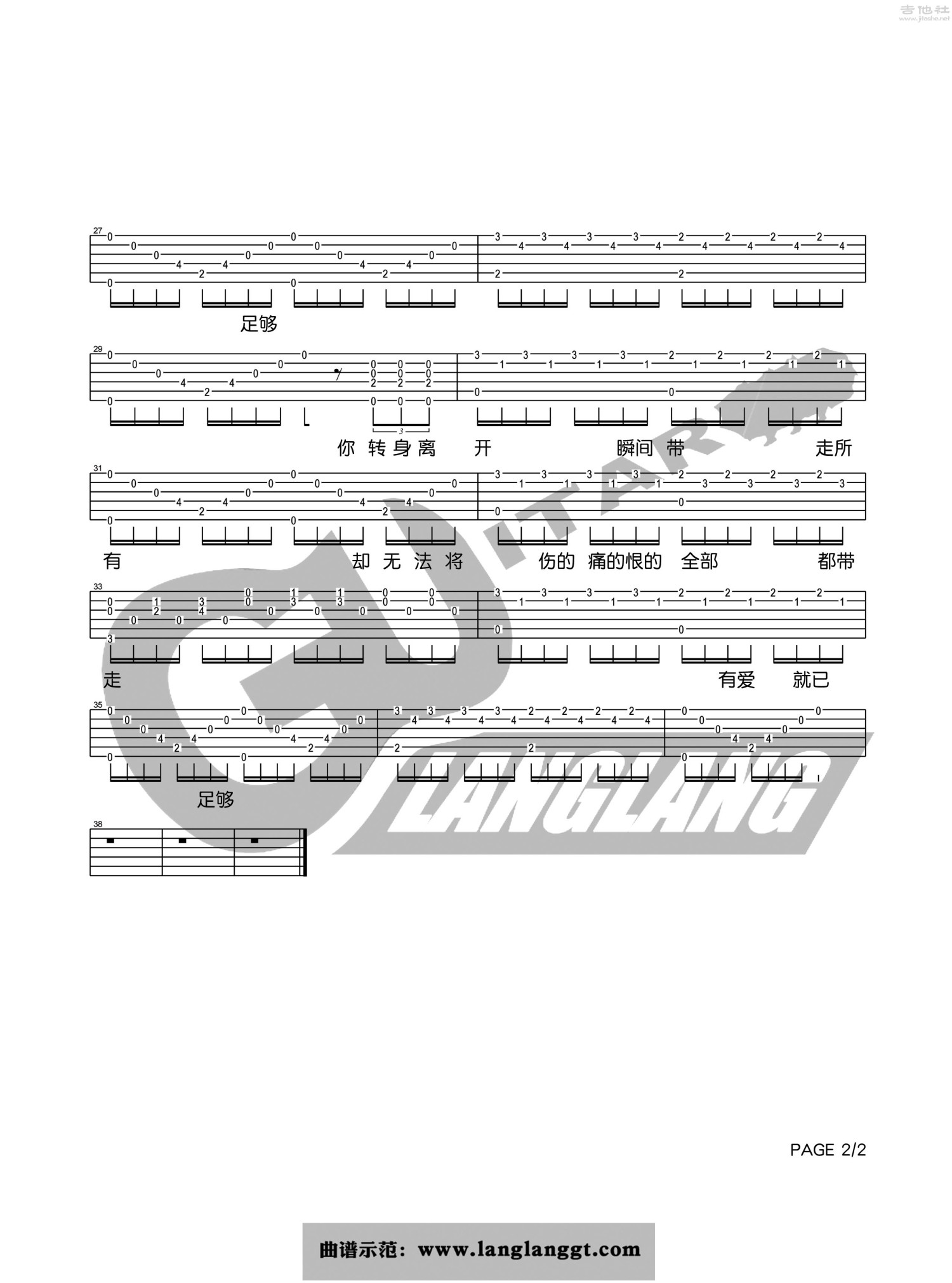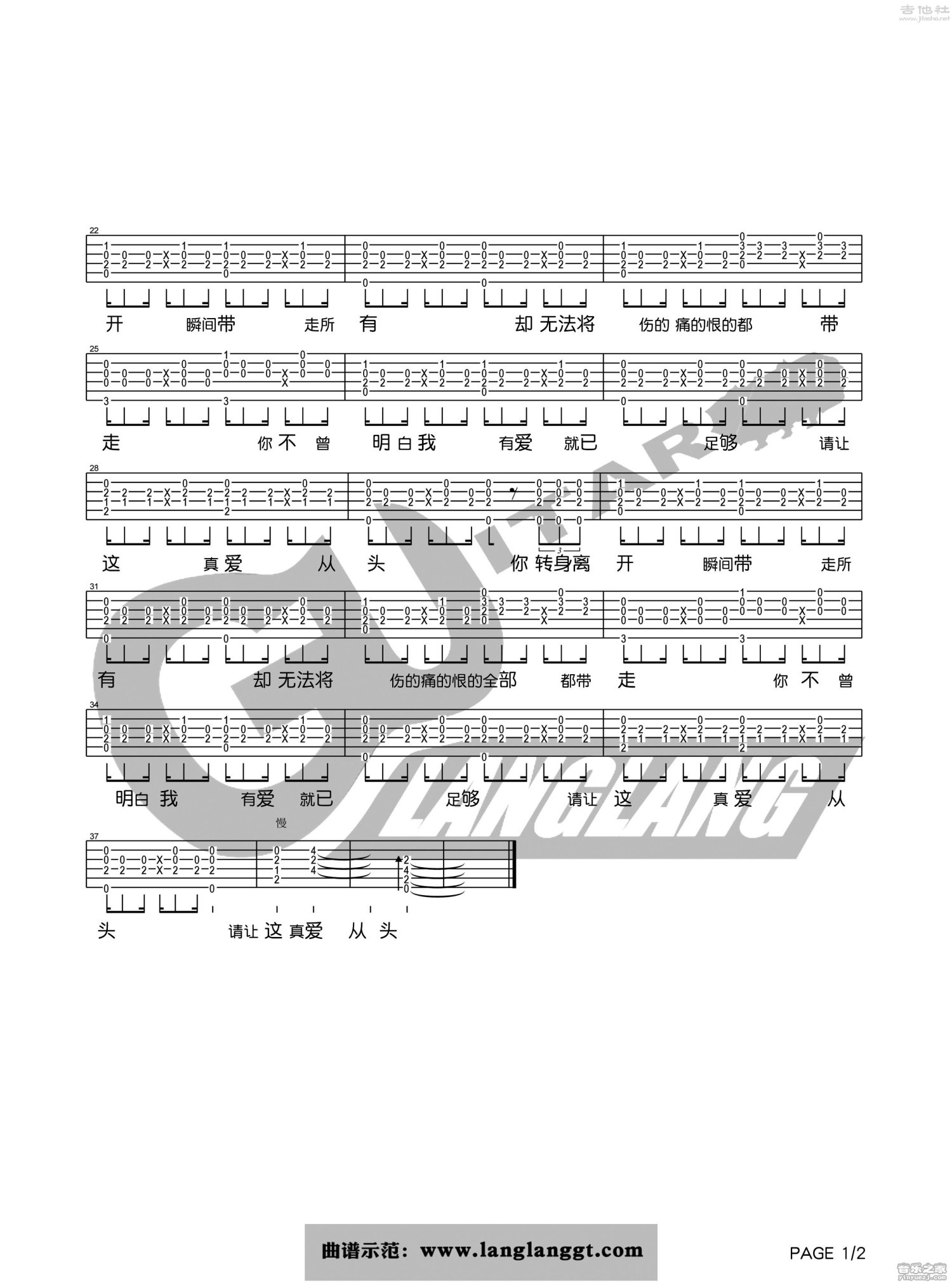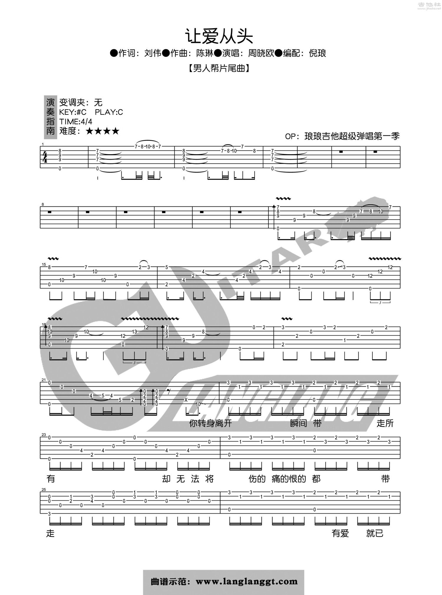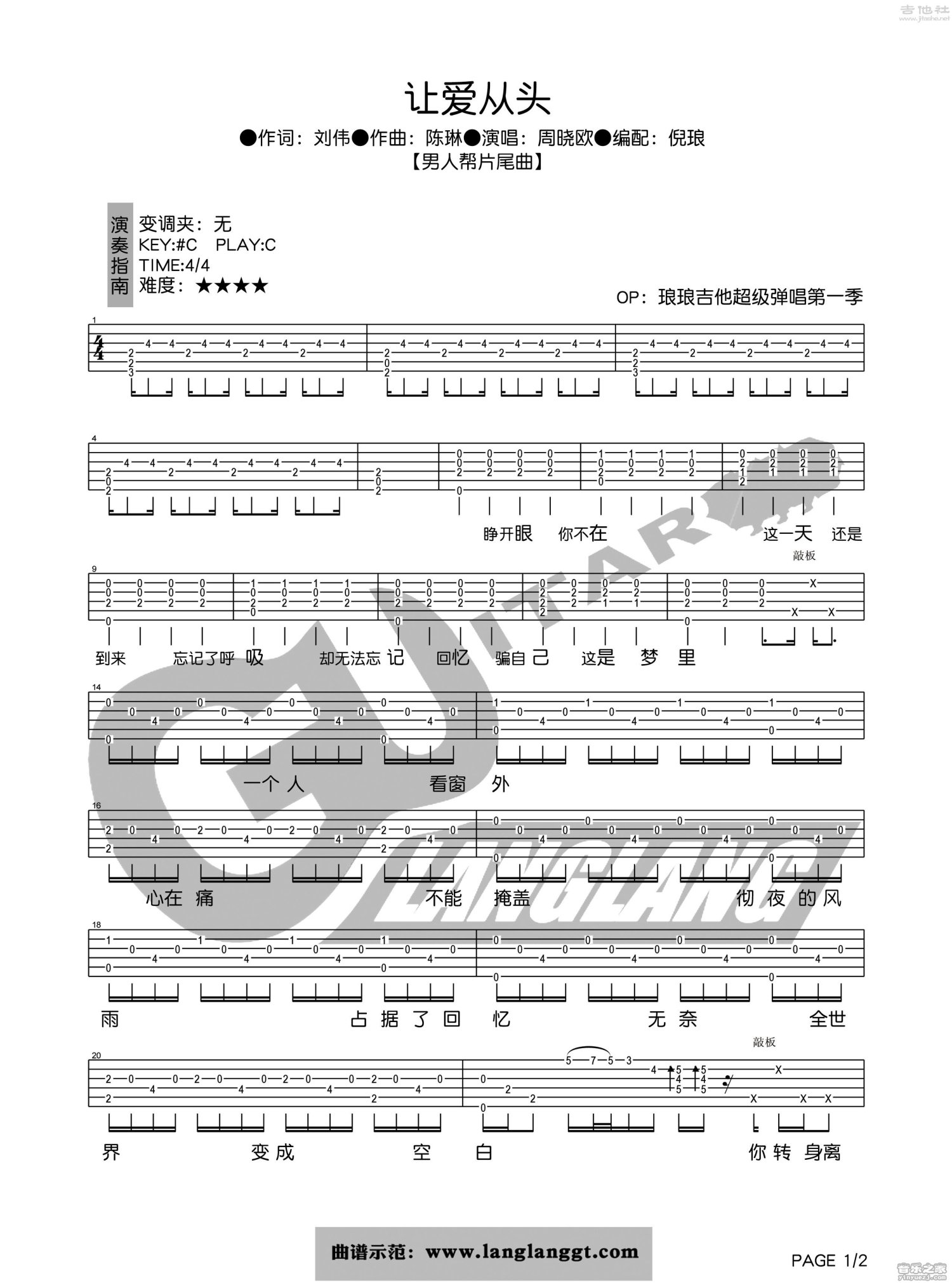 曲谱介绍: C调版《让爱从头》吉他弹唱六线谱