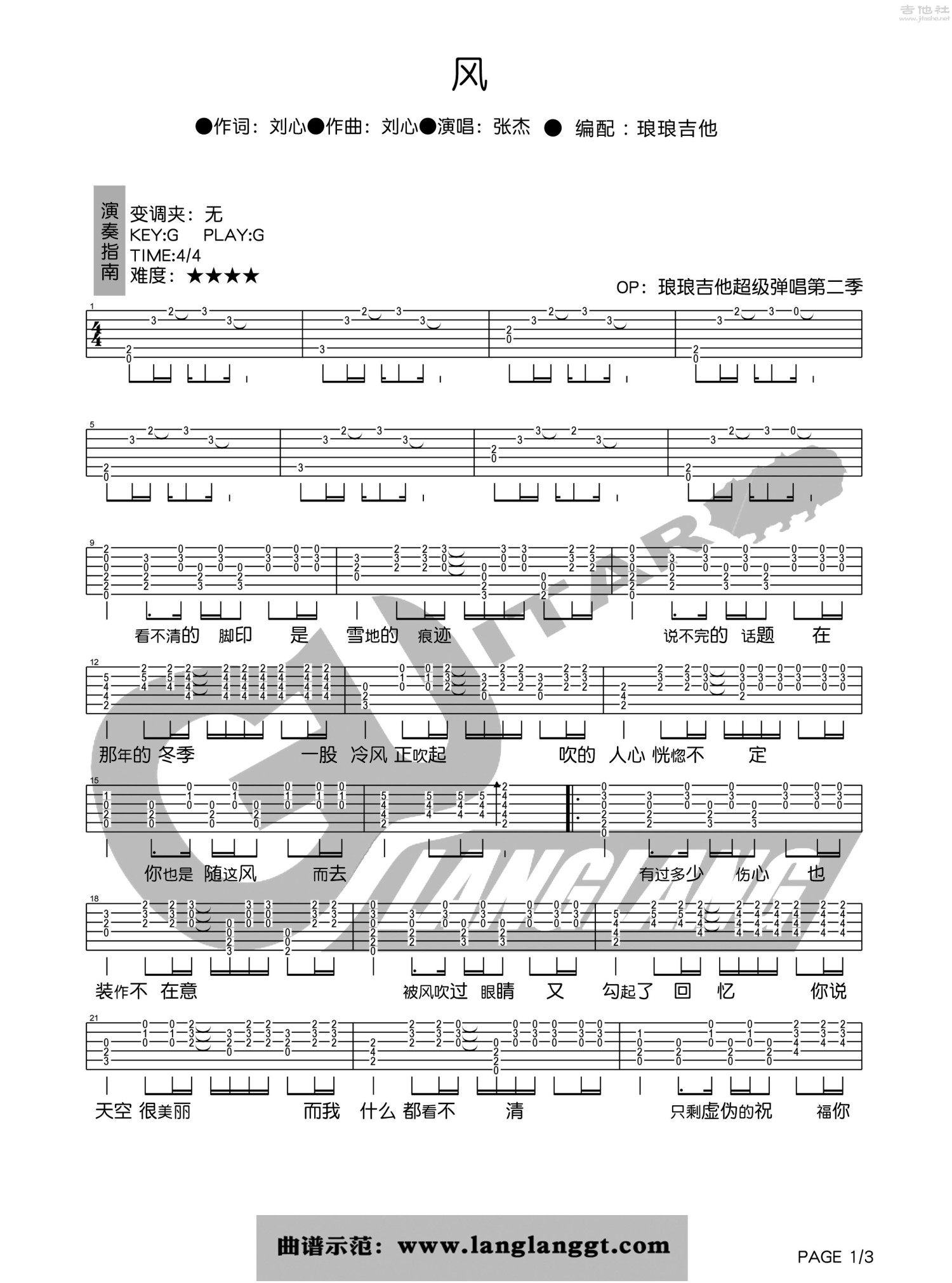 风吉他谱 - 张杰 - G调吉他弹唱谱