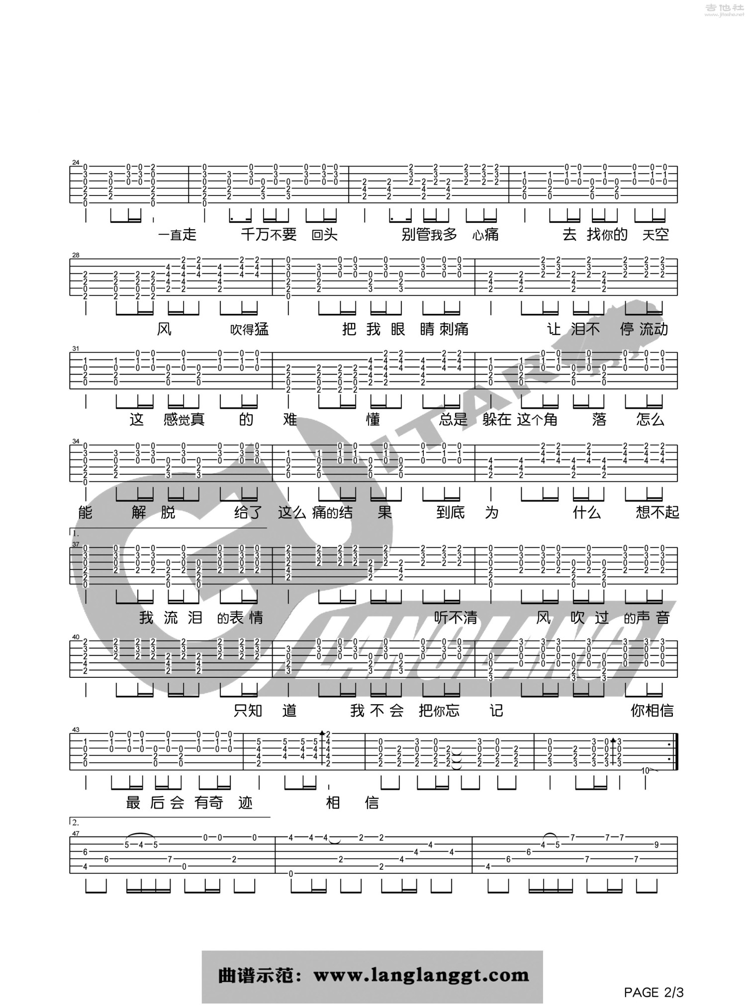 曲谱介绍: G调版《风》吉他弹唱六线谱
