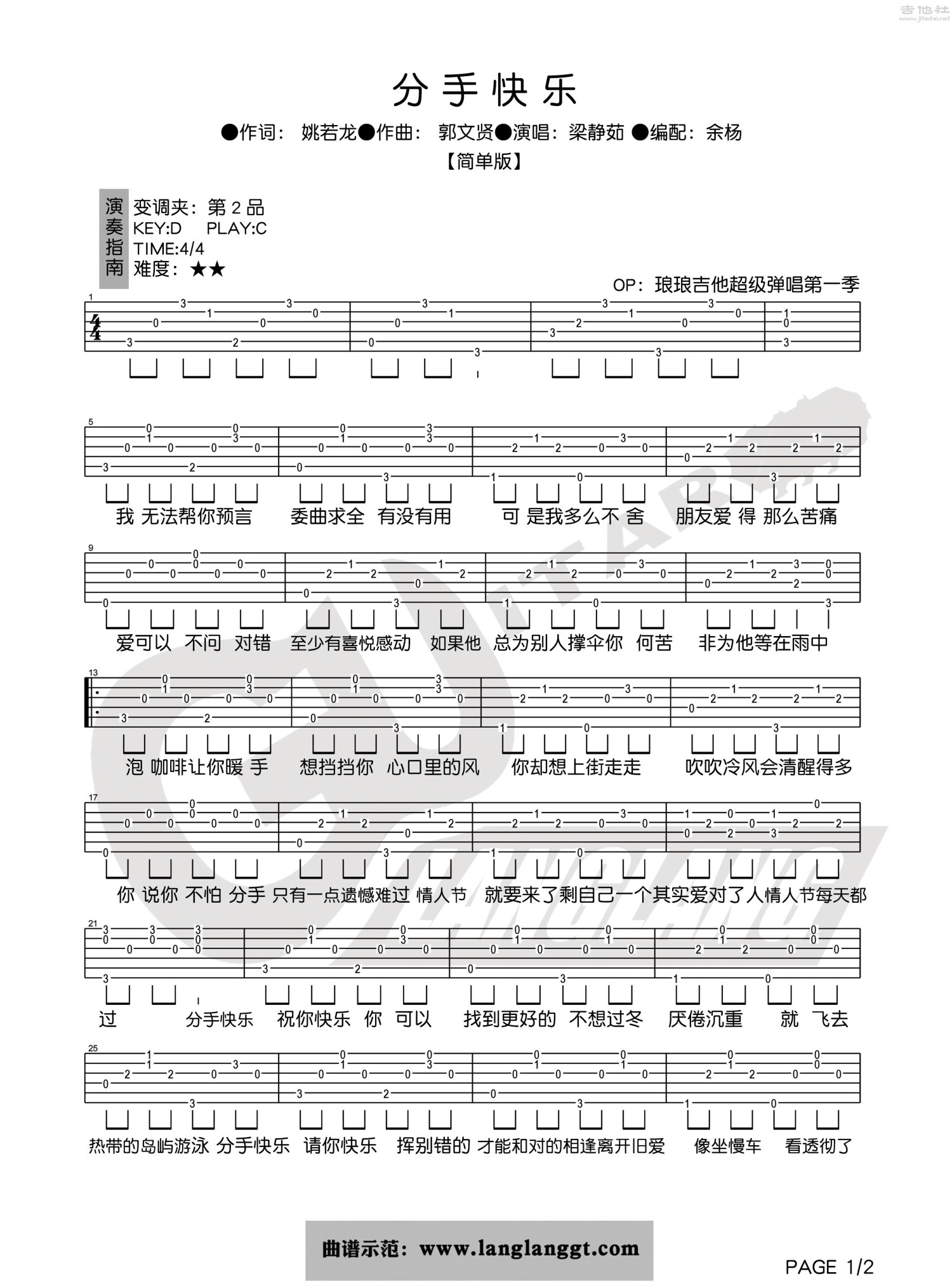 琴谱网为您精心推荐 分手快乐 高清图谱