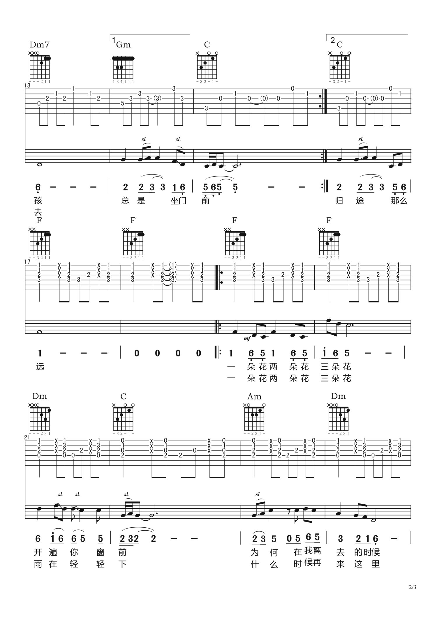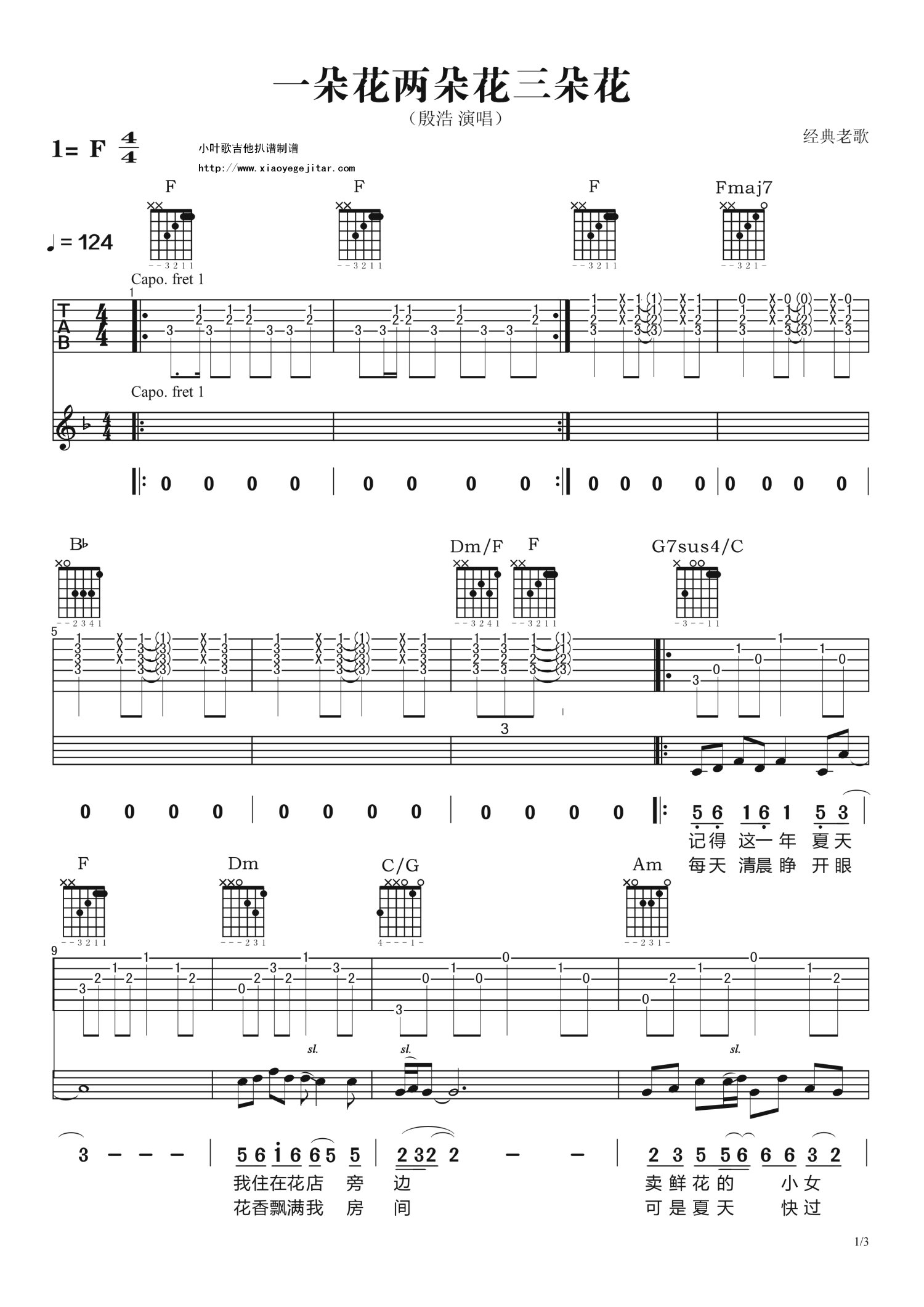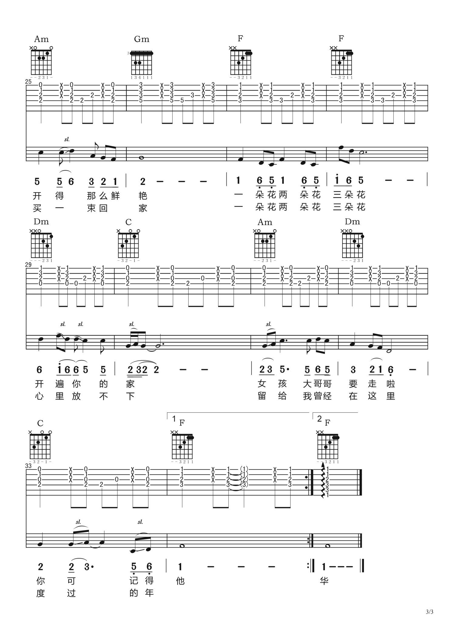 曲谱介绍: F调版《一朵花两朵花三朵花》吉他弹唱六线谱