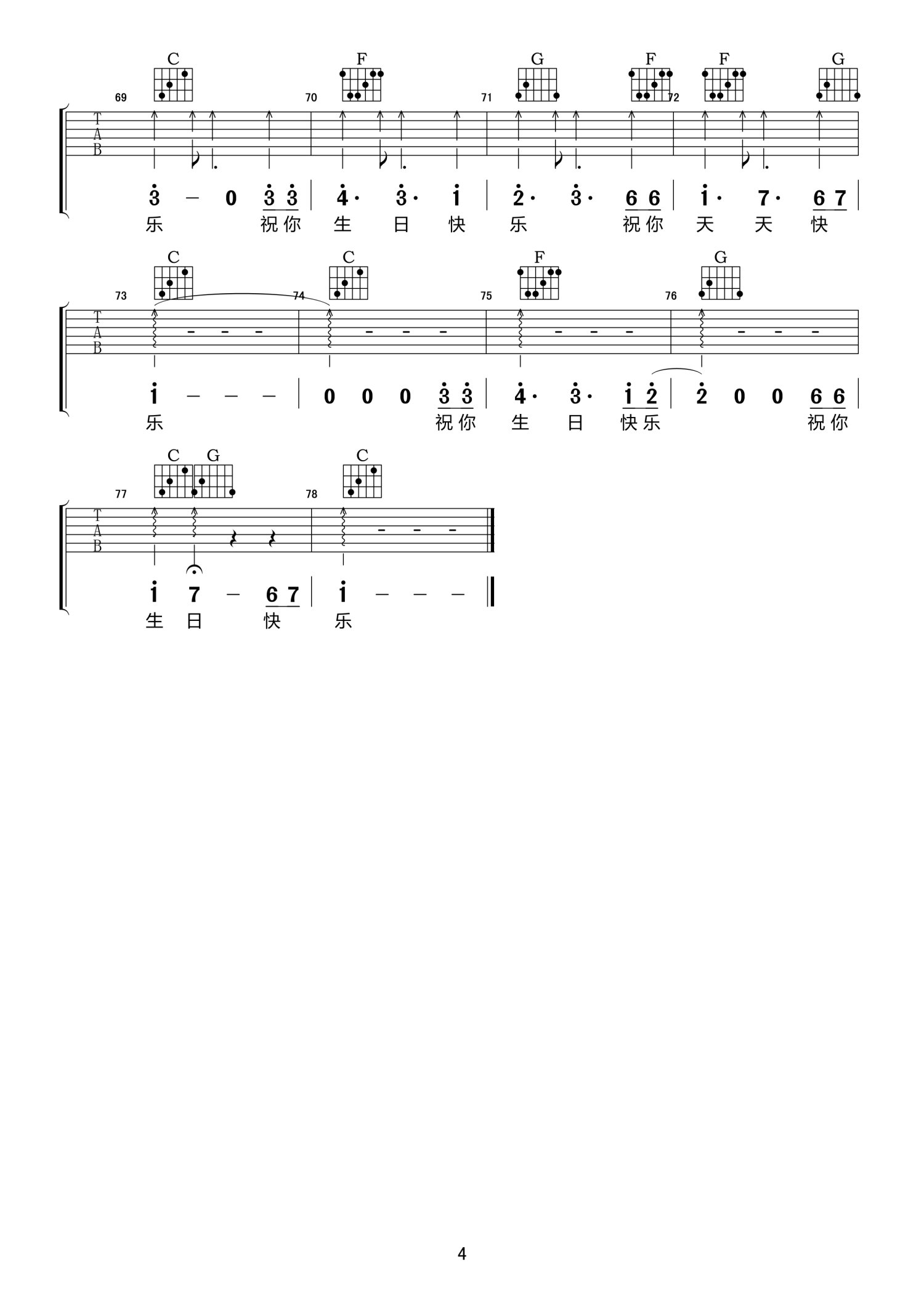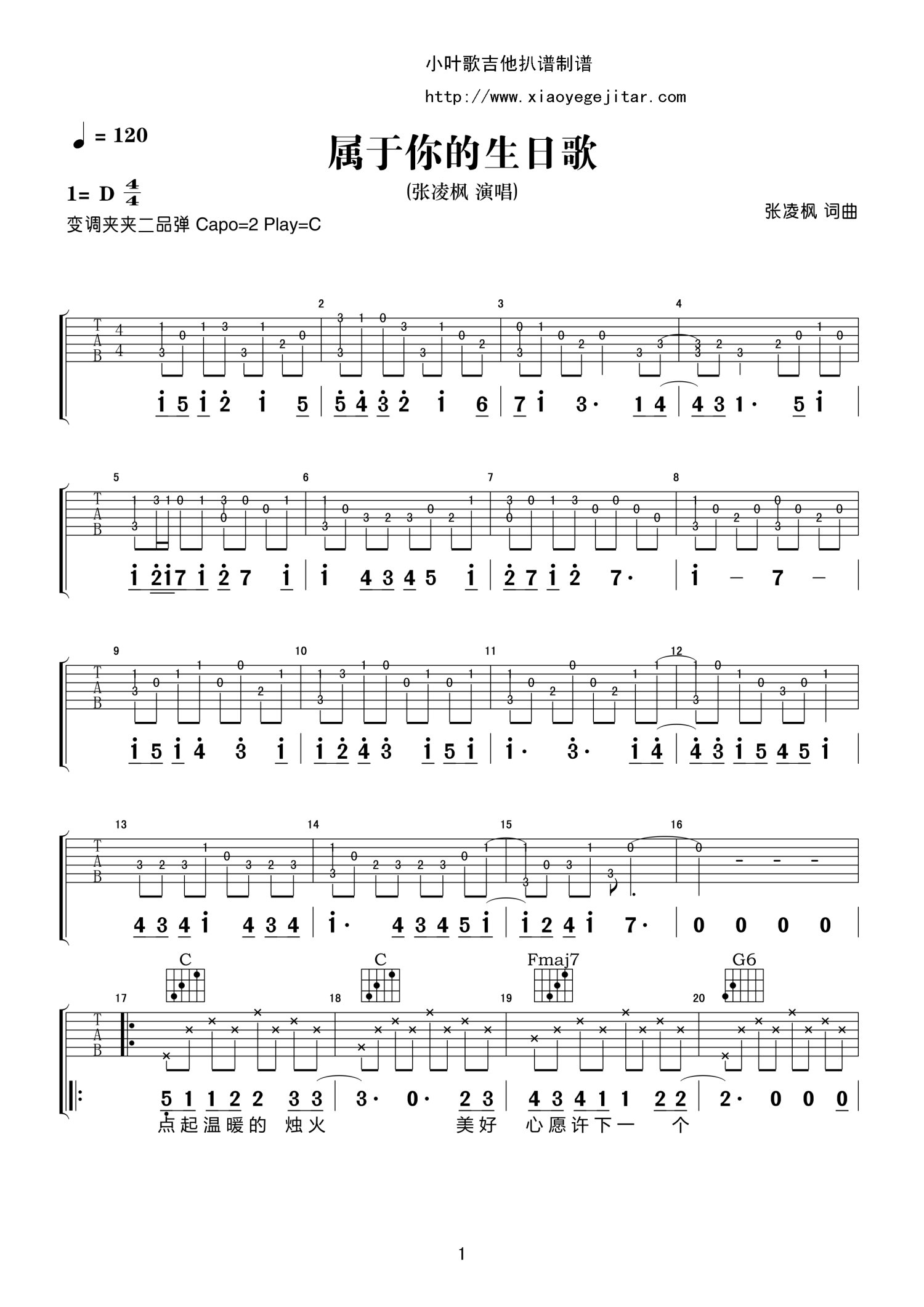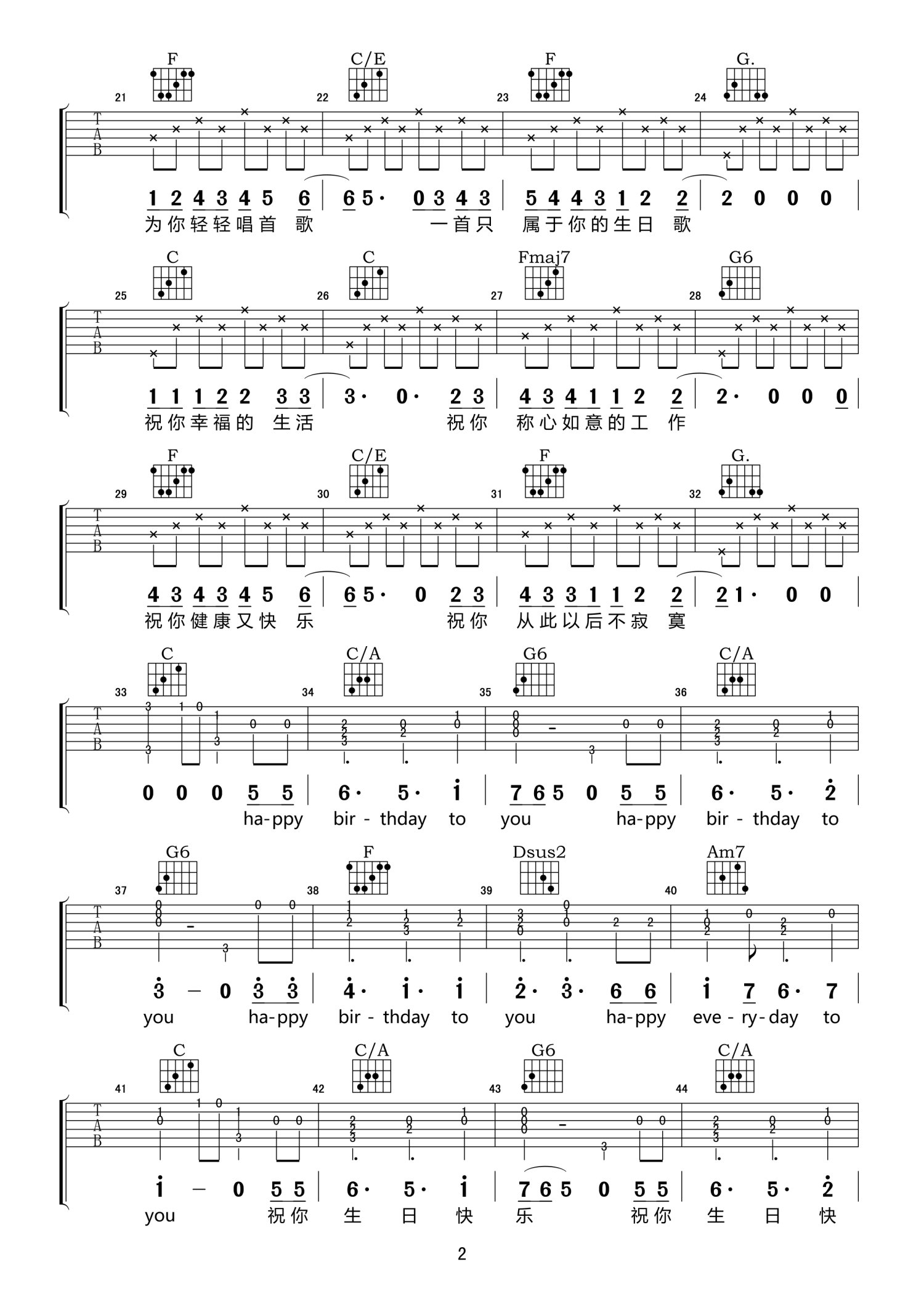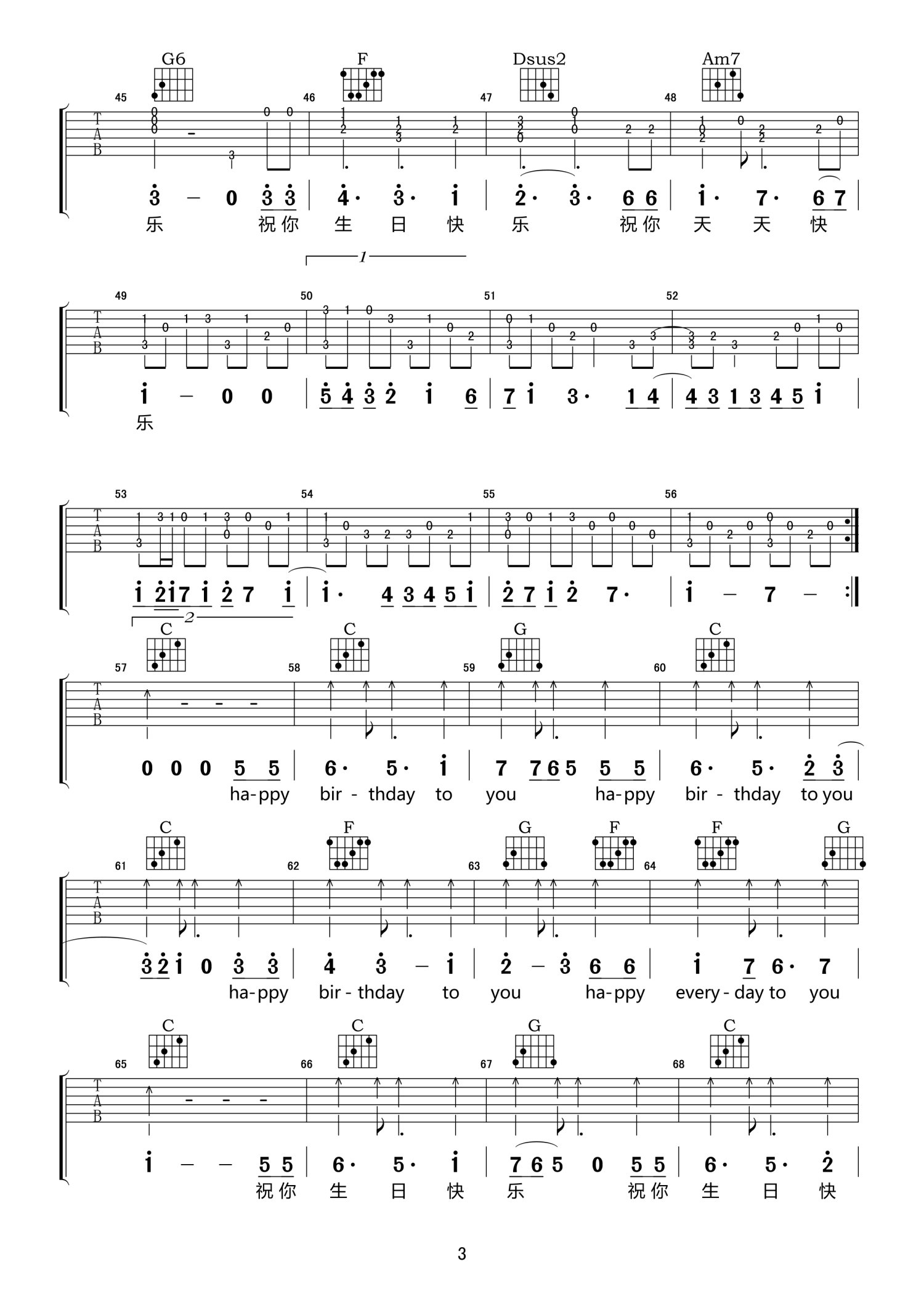 曲谱介绍: C调版《属于你的生日歌》吉他弹唱六线谱