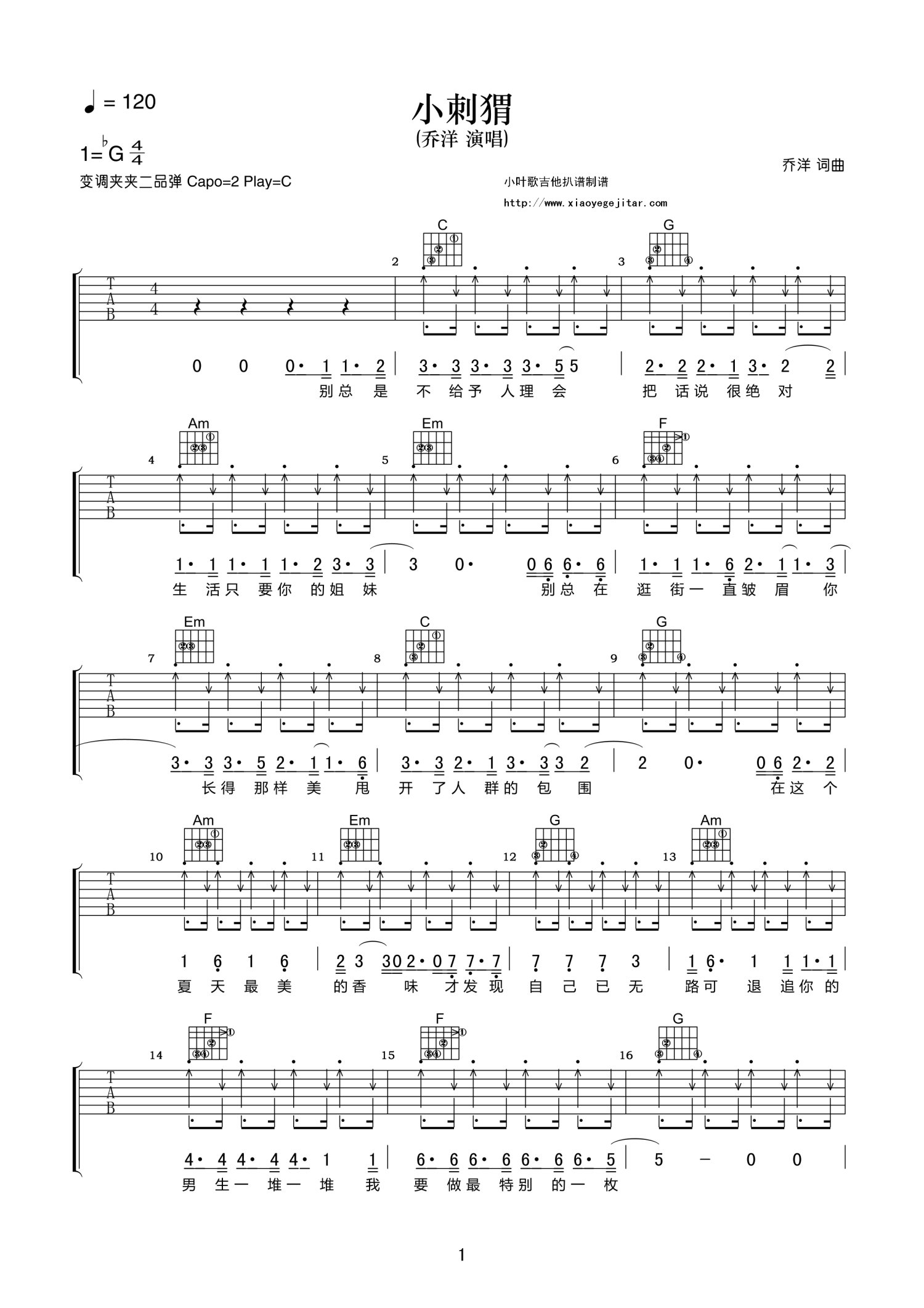 小刺猬吉他谱 - 乔洋 - C调吉他弹唱谱