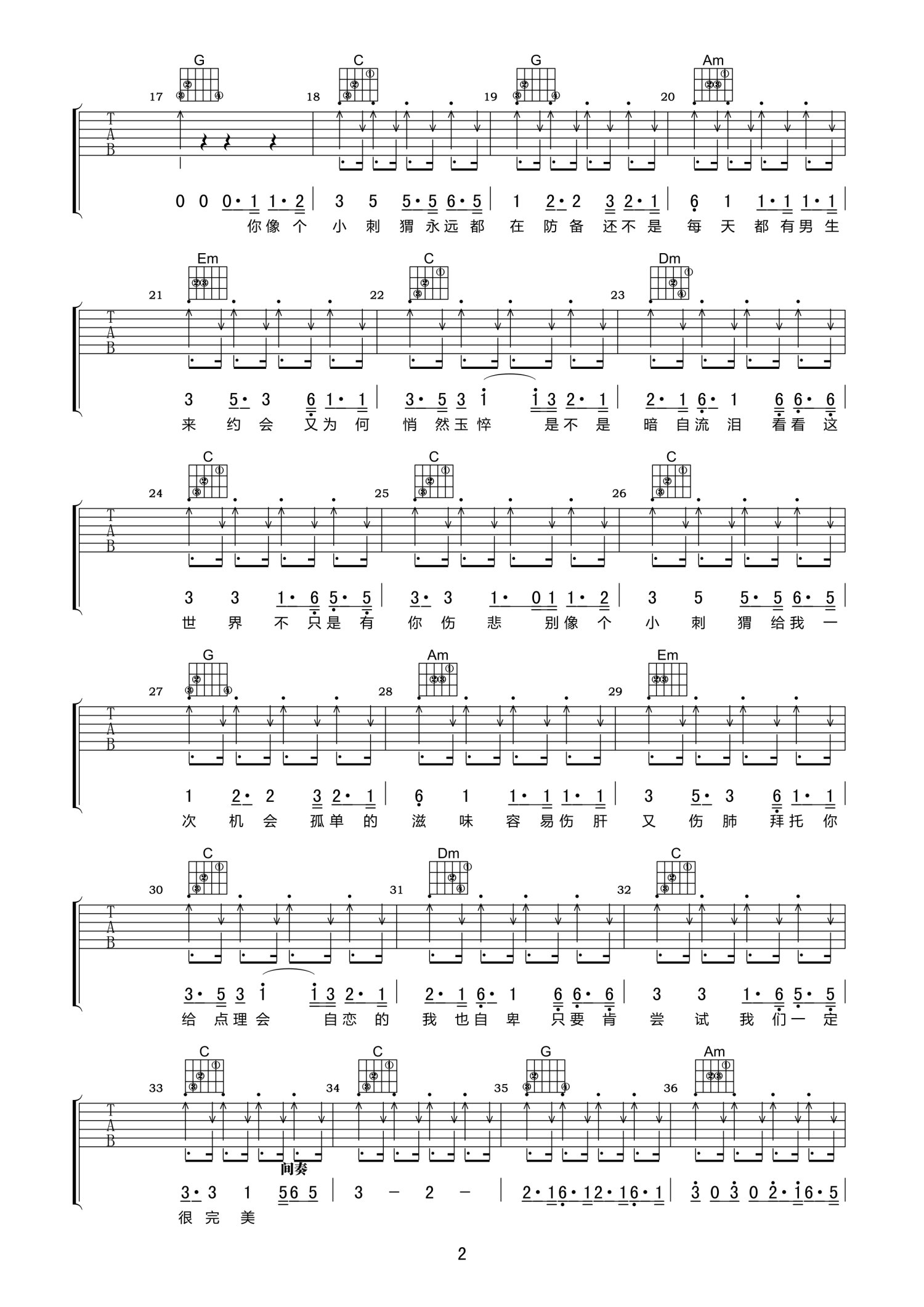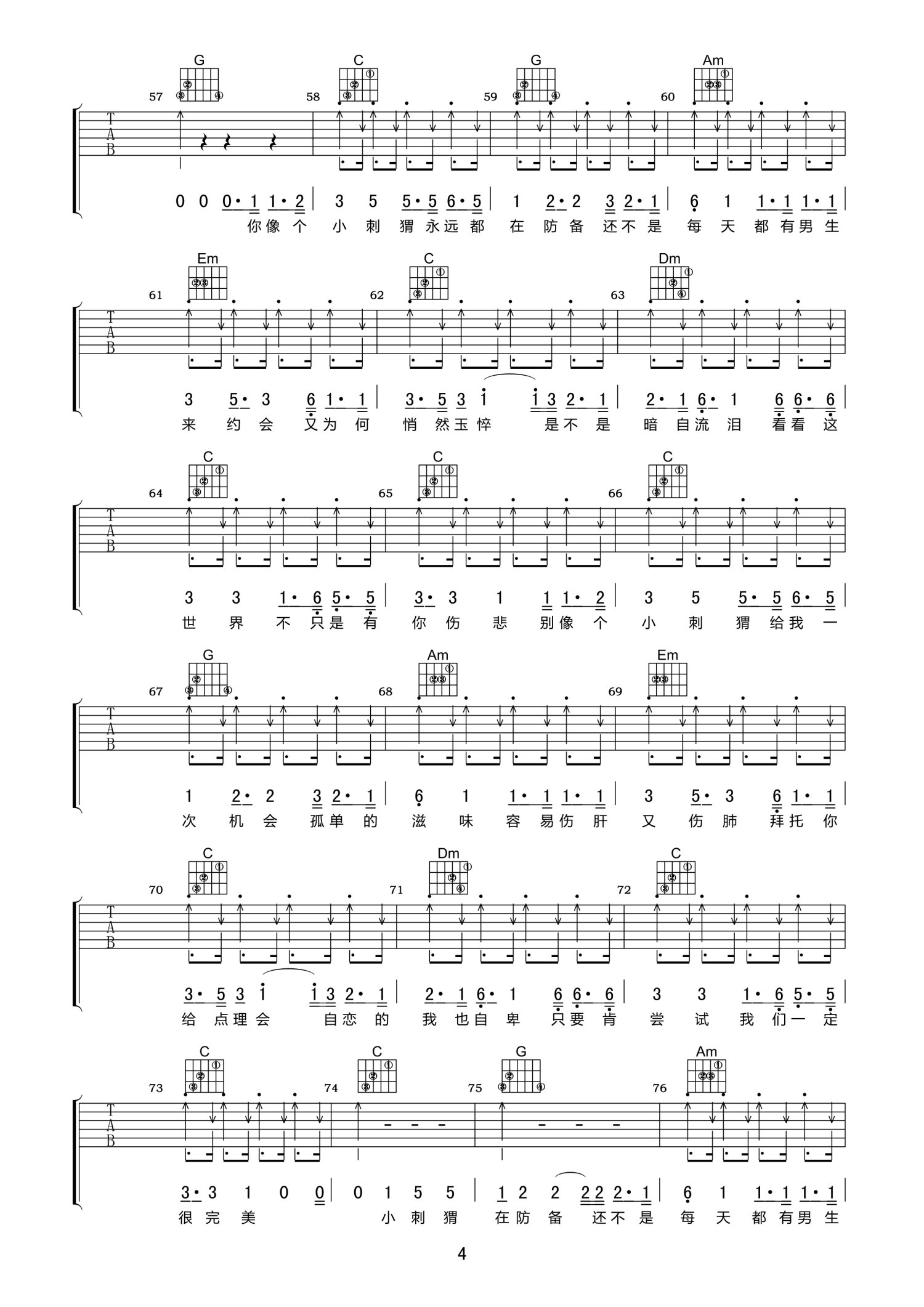 曲谱介绍: C调版《小刺猬》吉他弹唱六线谱