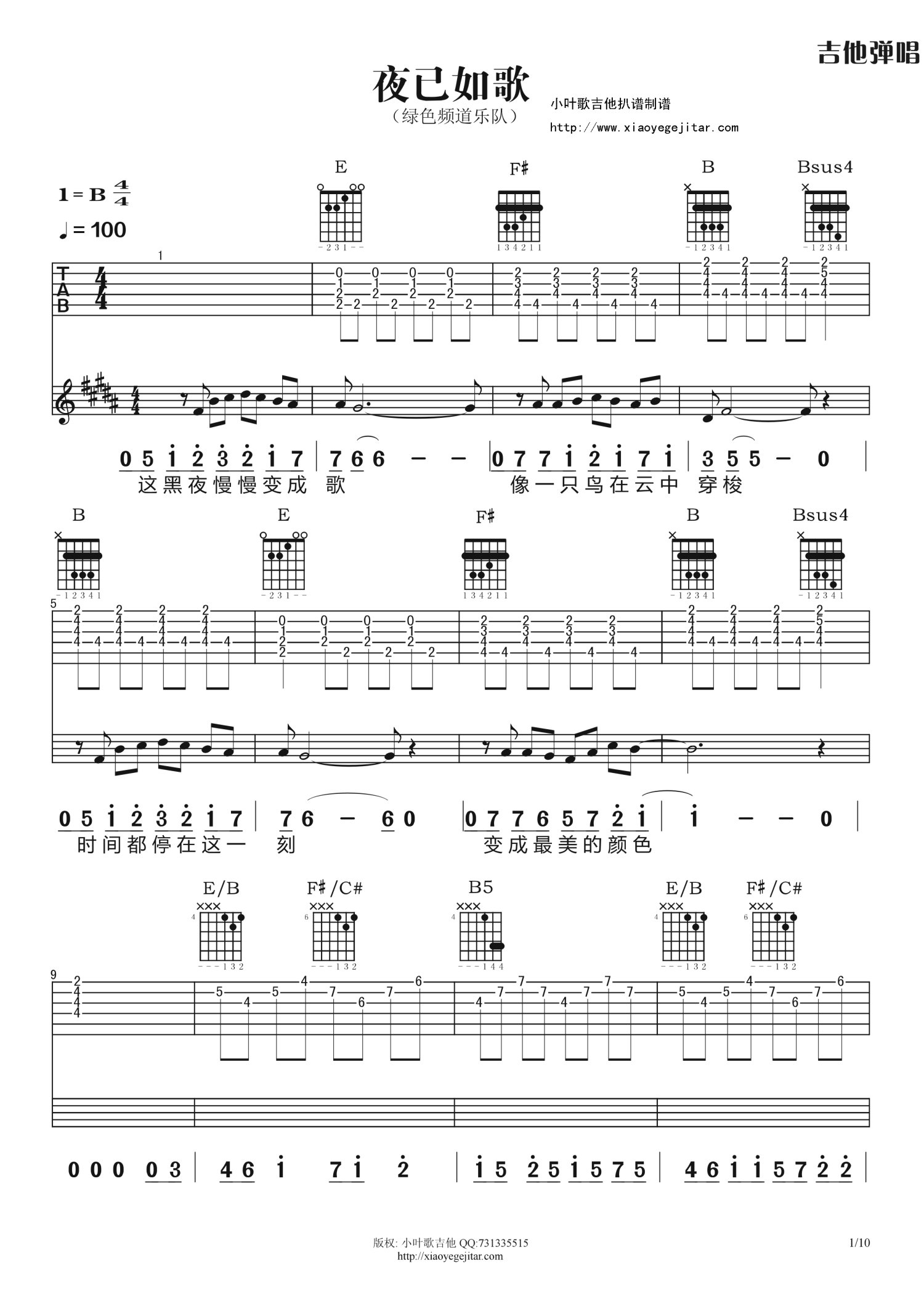 夜已如歌吉他谱 - 绿色频道 - B调吉他弹唱谱