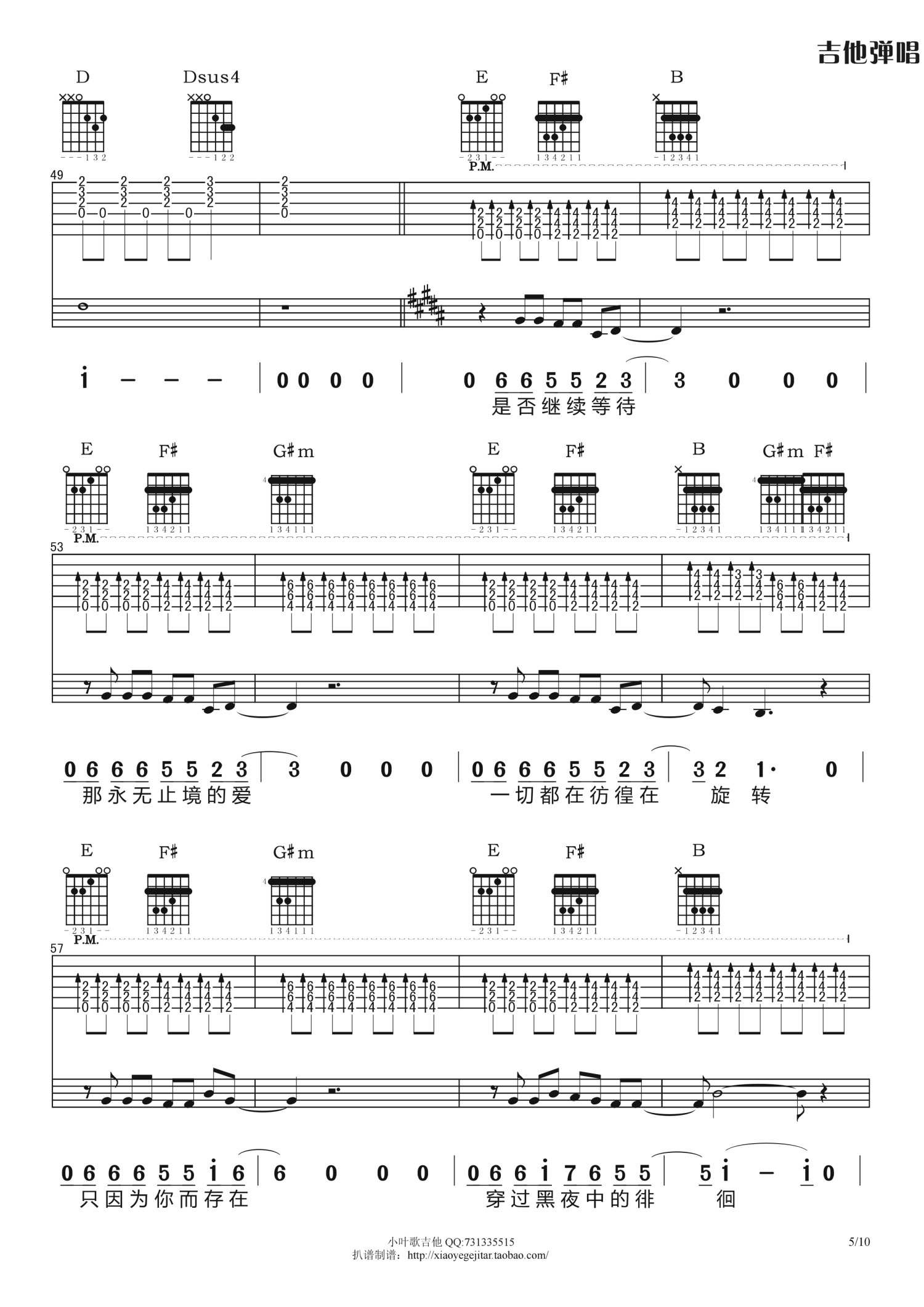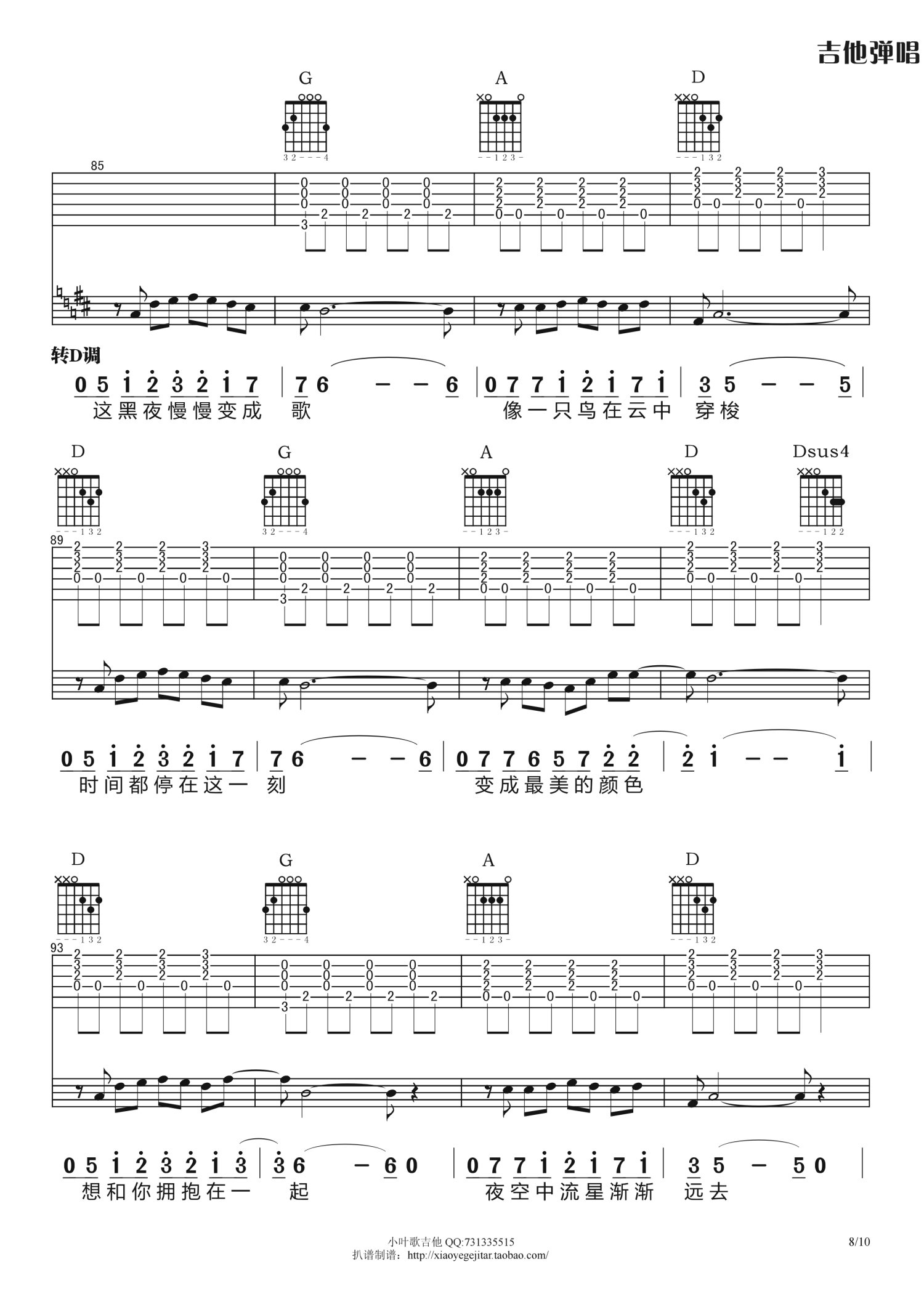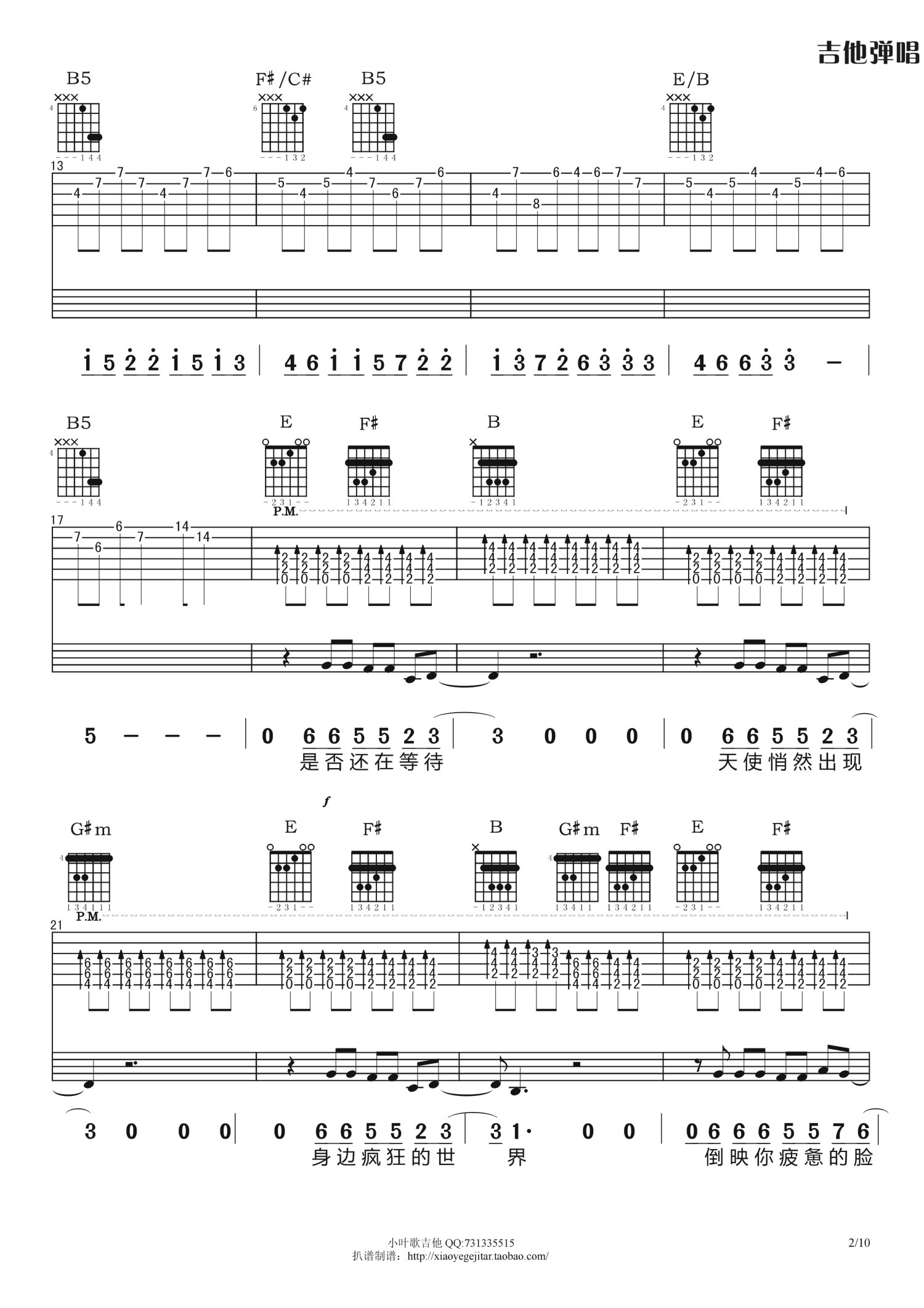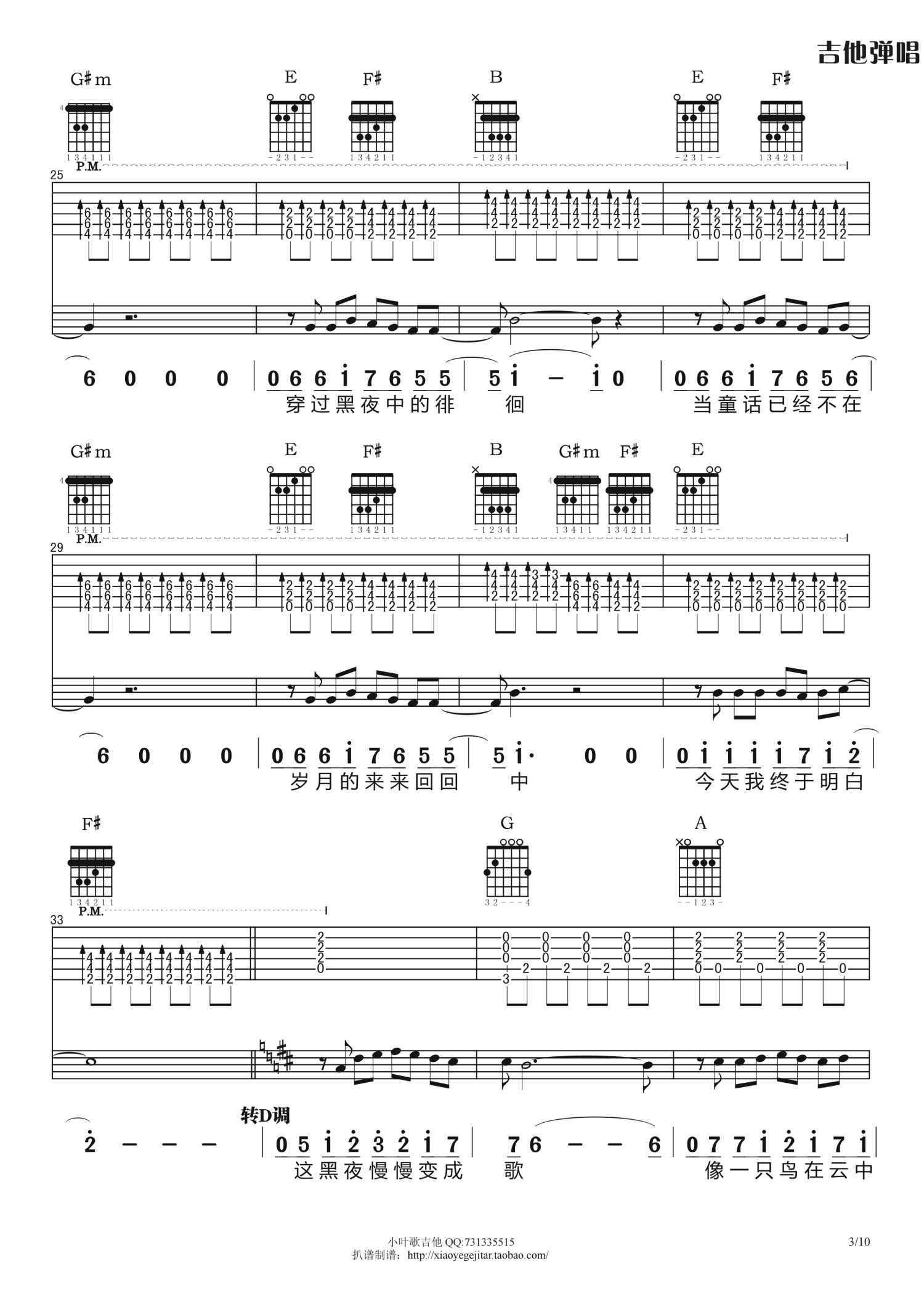 曲谱介绍: B调版《夜已如歌》吉他弹唱六线谱