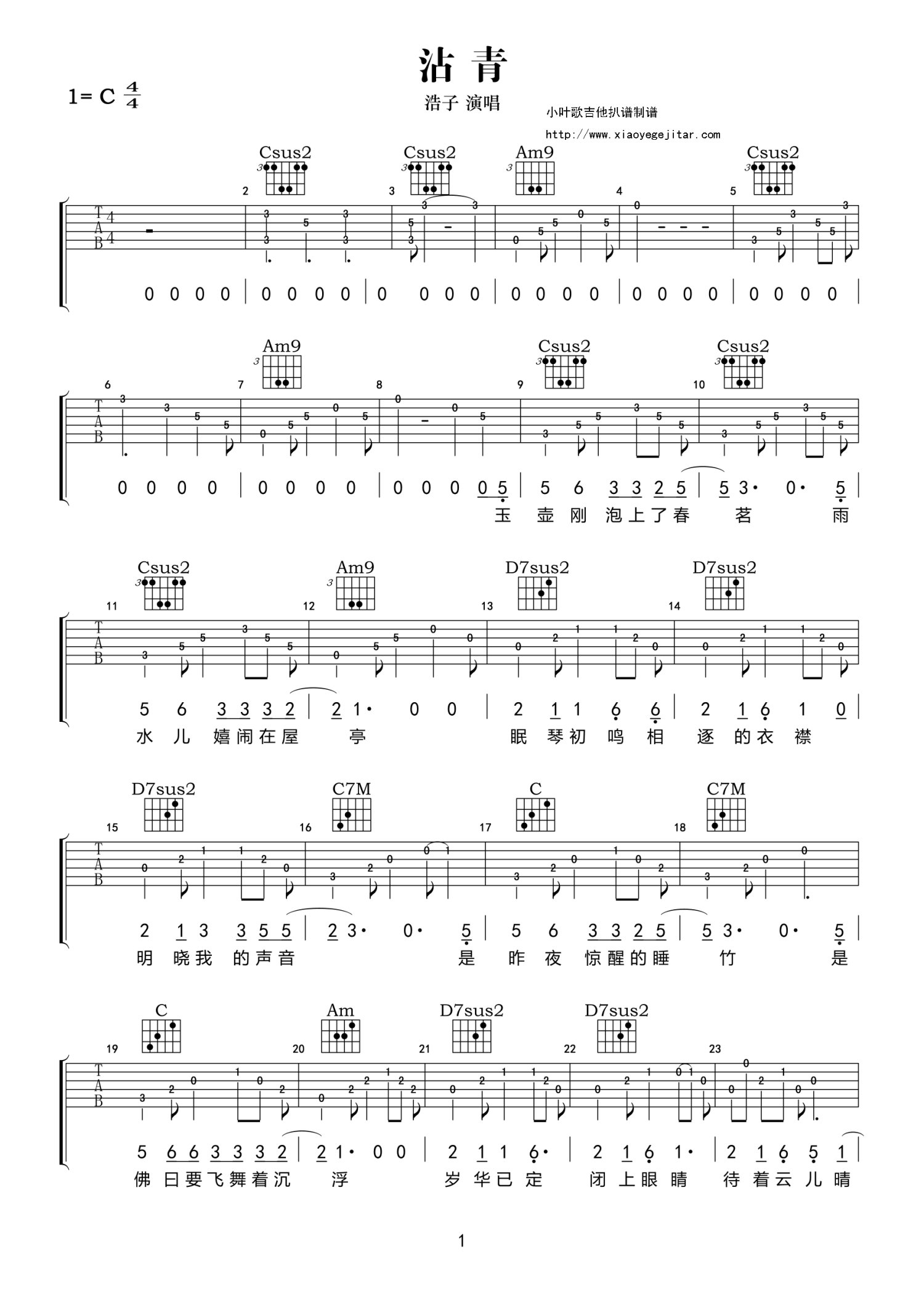 曲谱介绍: C调版《沾青》吉他弹唱六线谱