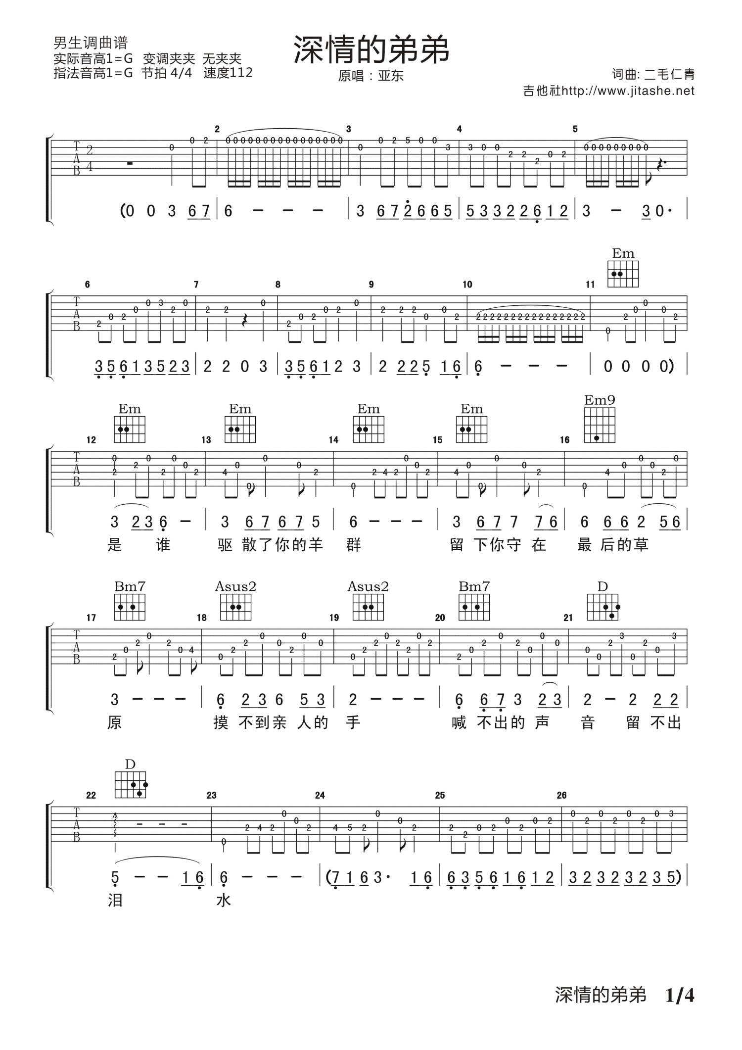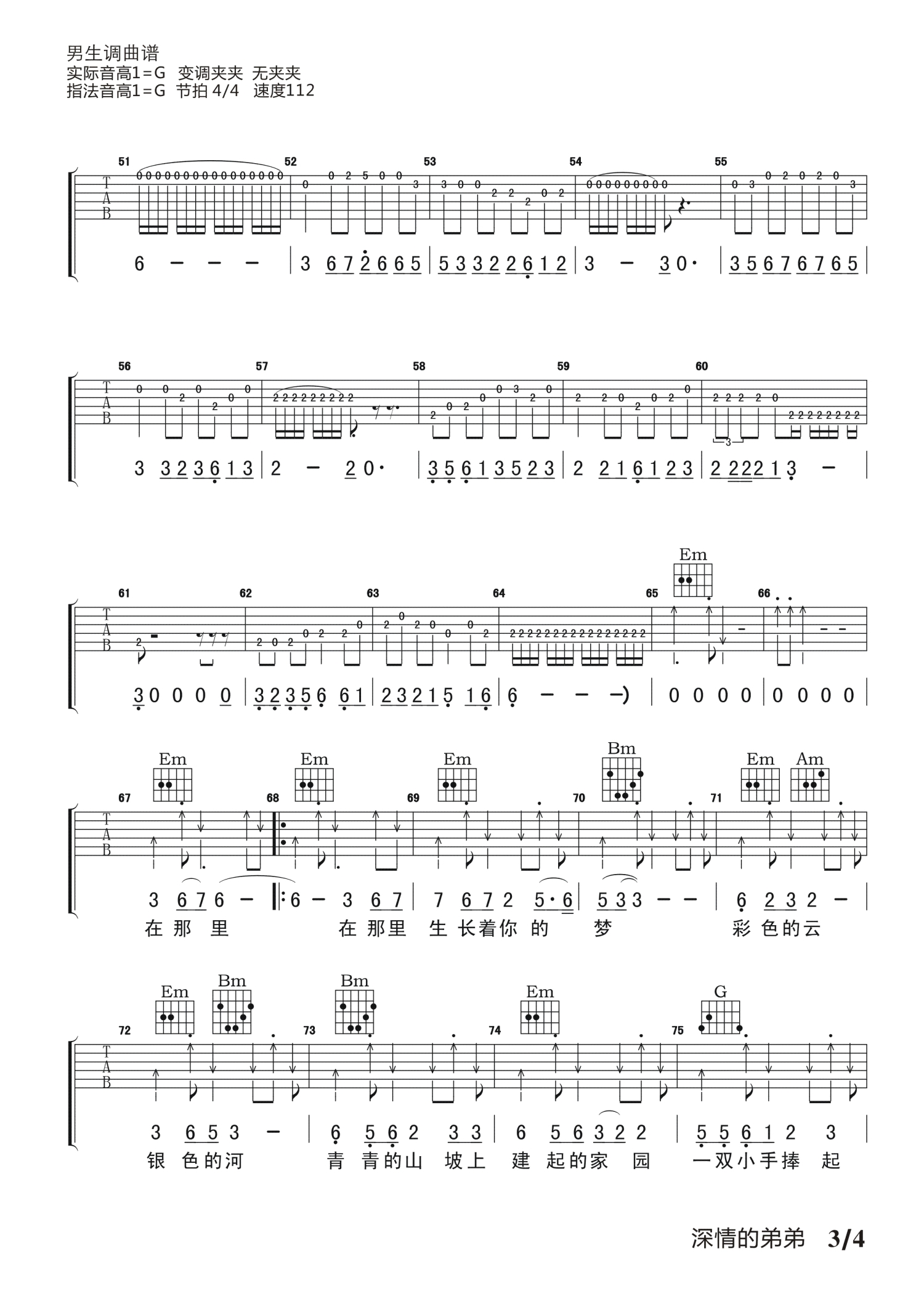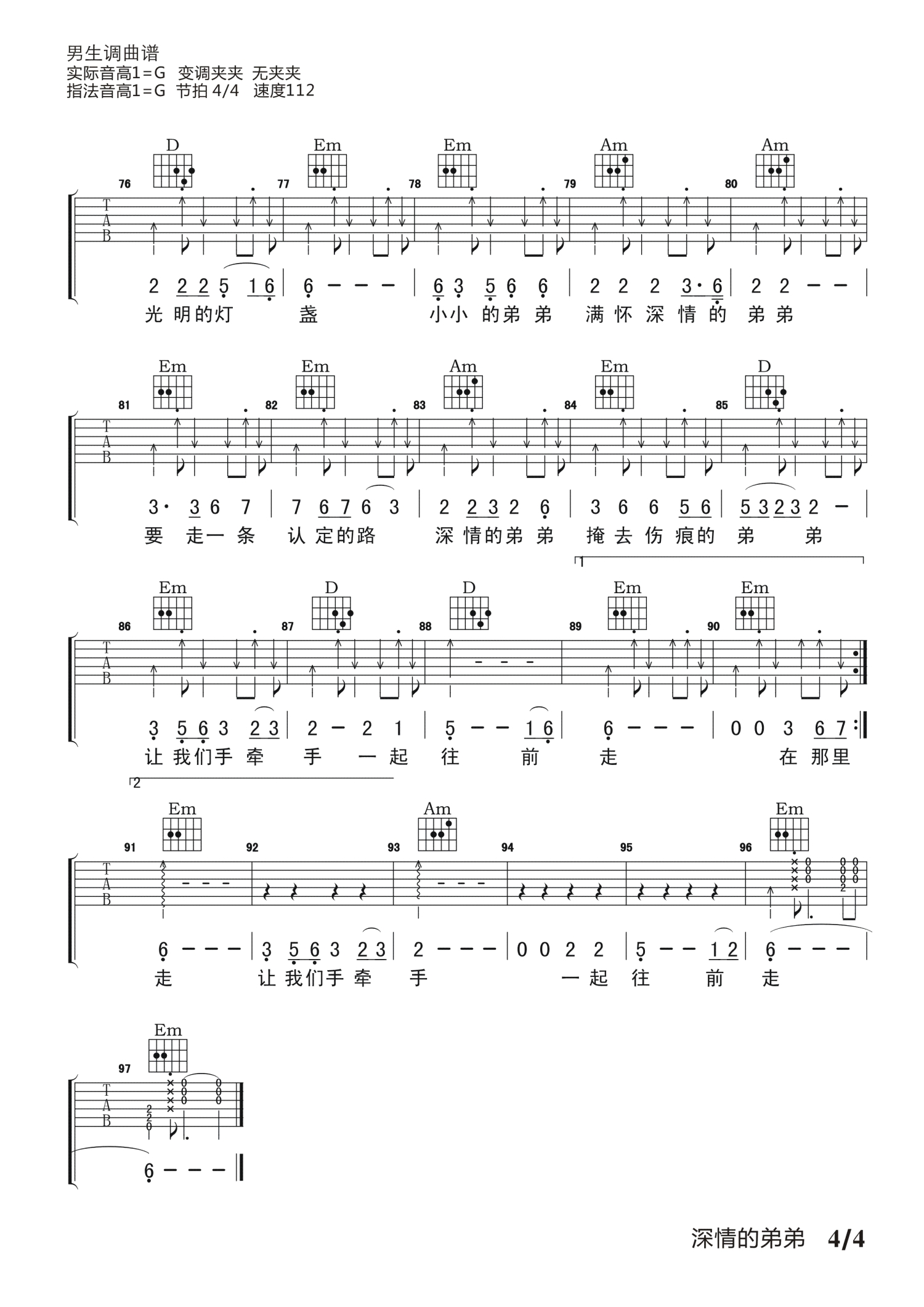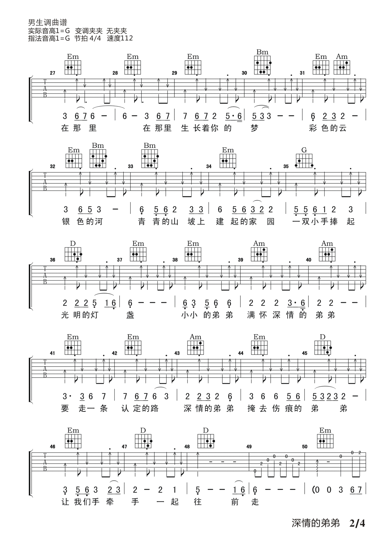 曲谱介绍: G调版《深情的弟弟》吉他弹唱六线谱