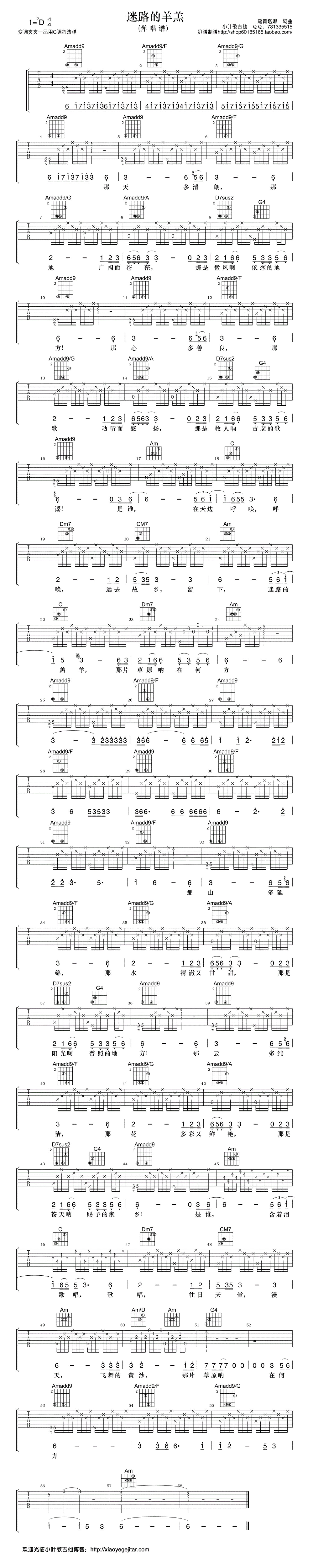 曲谱介绍: C调版《迷路的羊羔》吉他弹唱六线谱