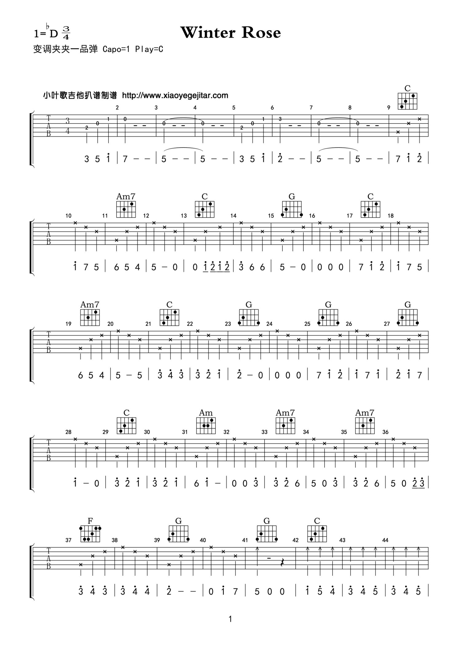 曲谱介绍: C调版《WinterRose》吉他弹唱六线谱