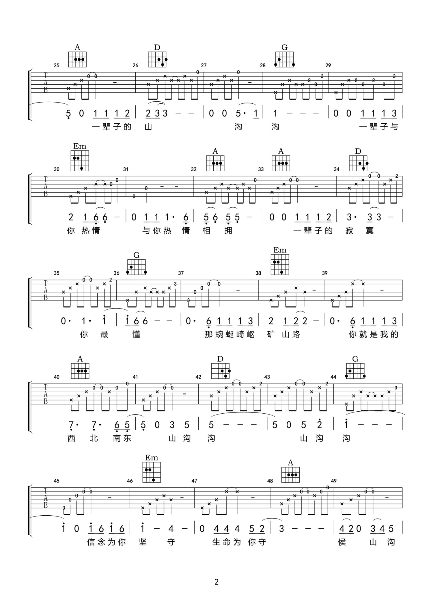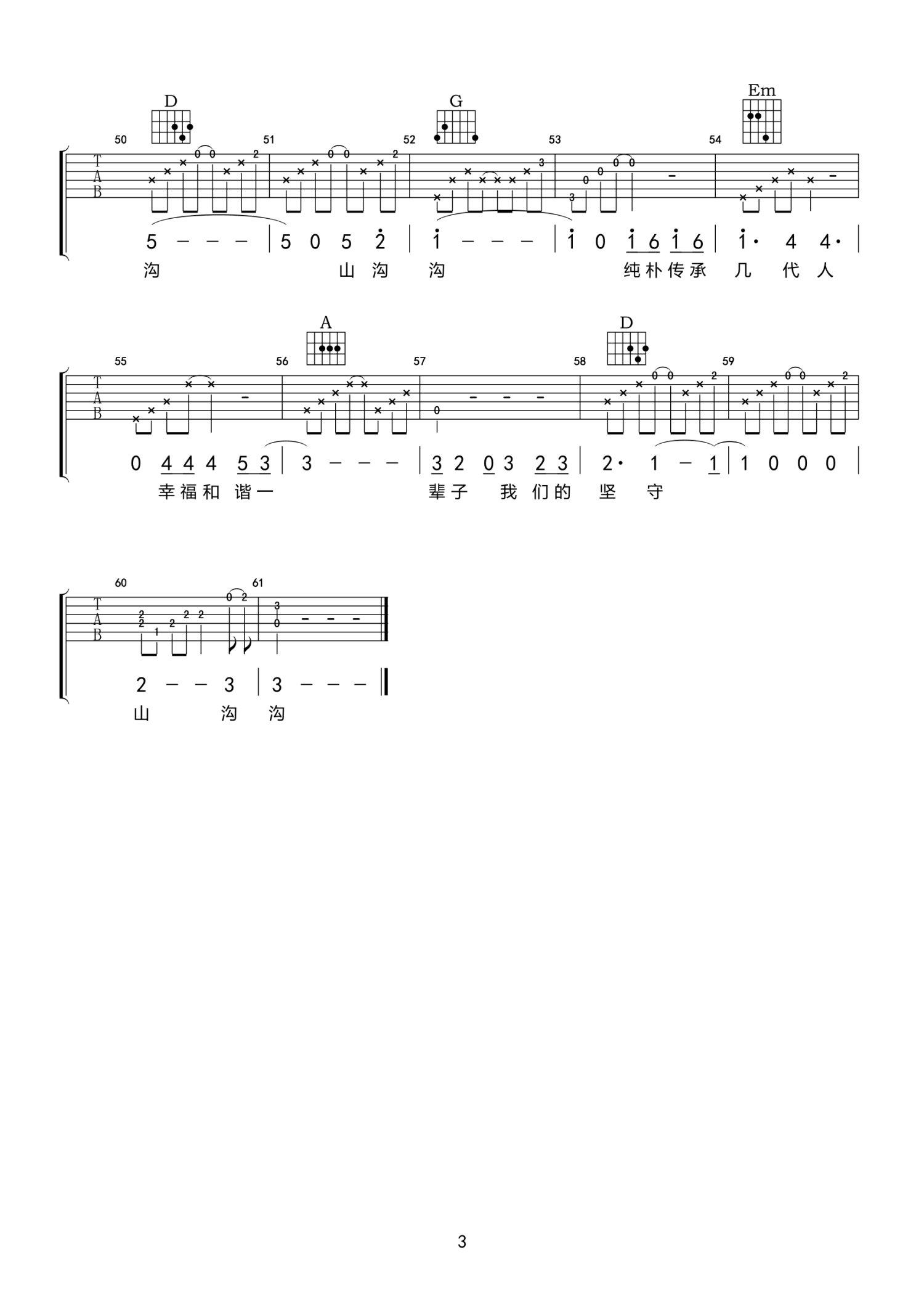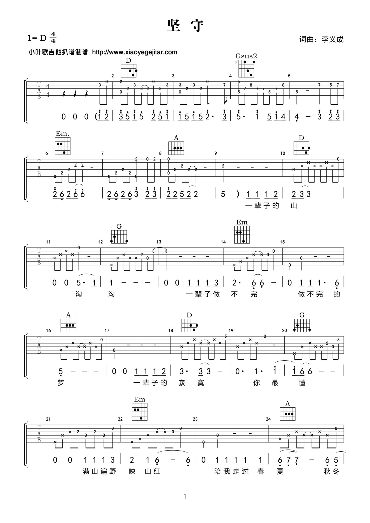 曲谱介绍: D调版《坚守》吉他弹唱六线谱