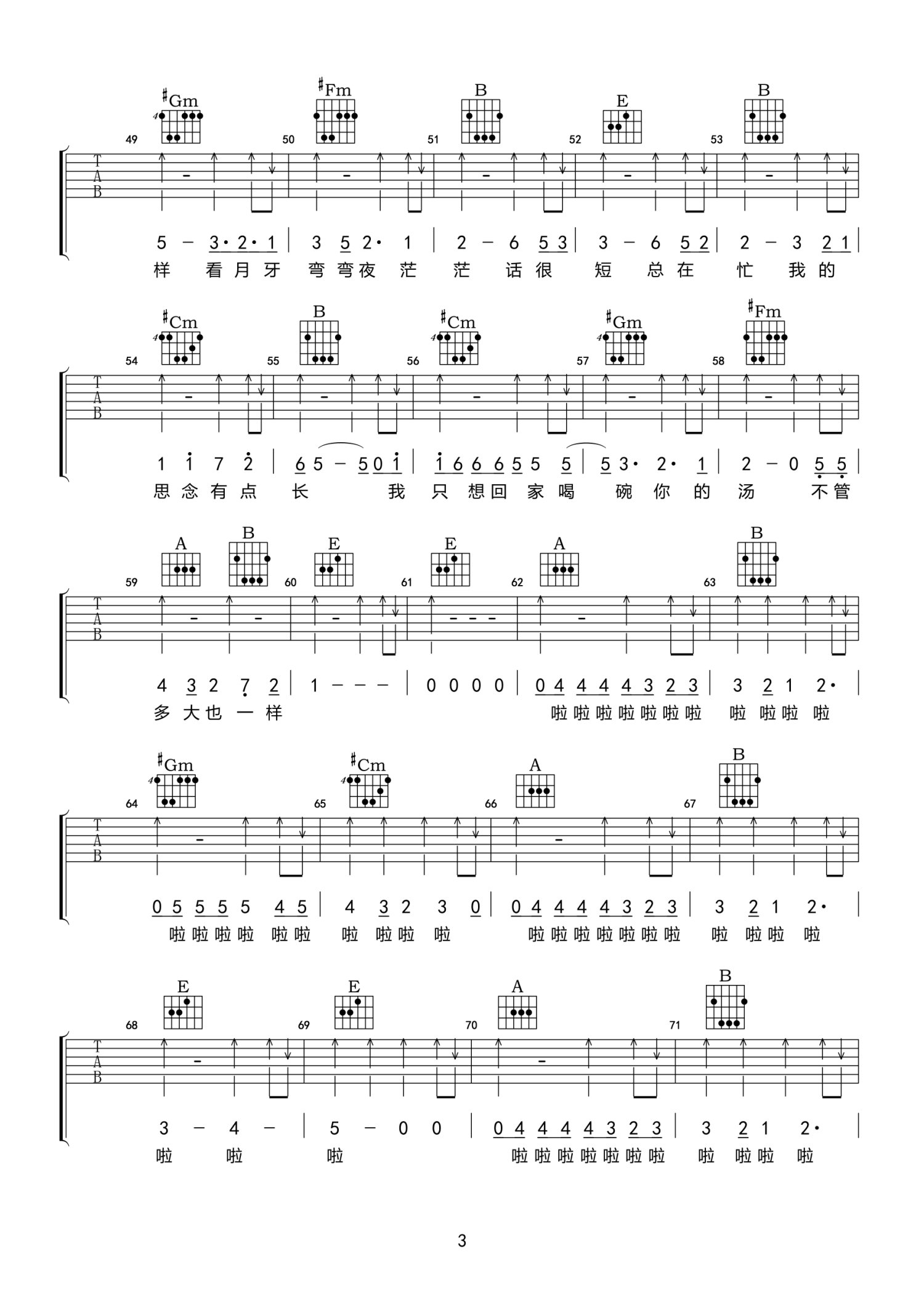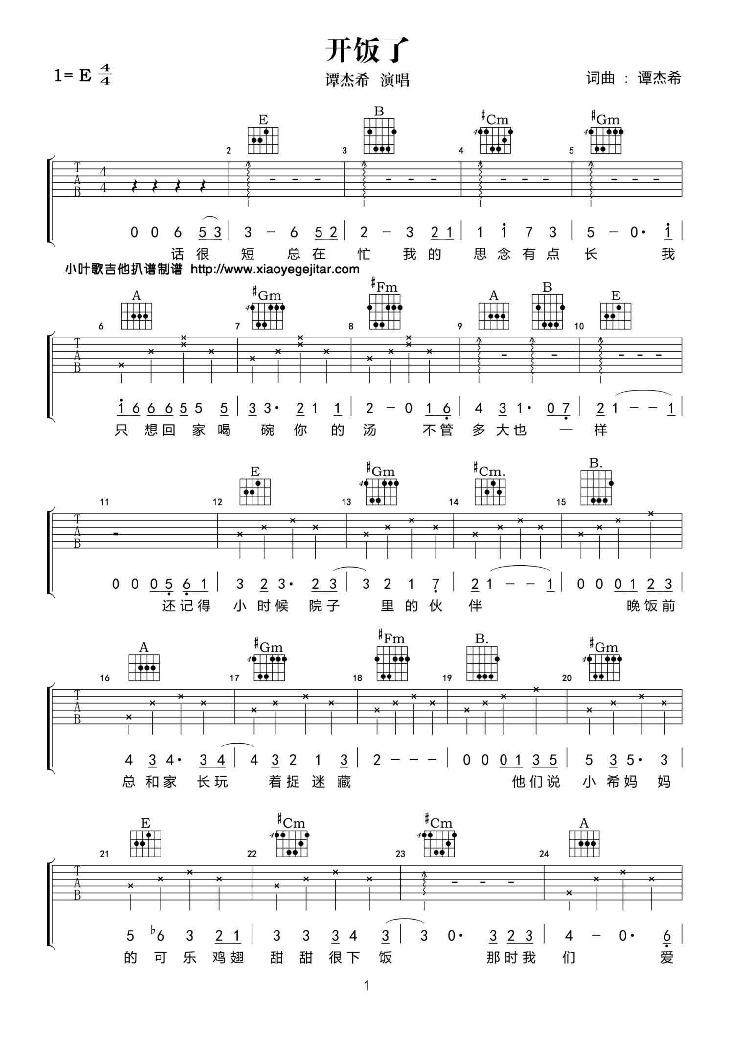 曲谱介绍: E调版《开饭了》吉他弹唱六线谱
