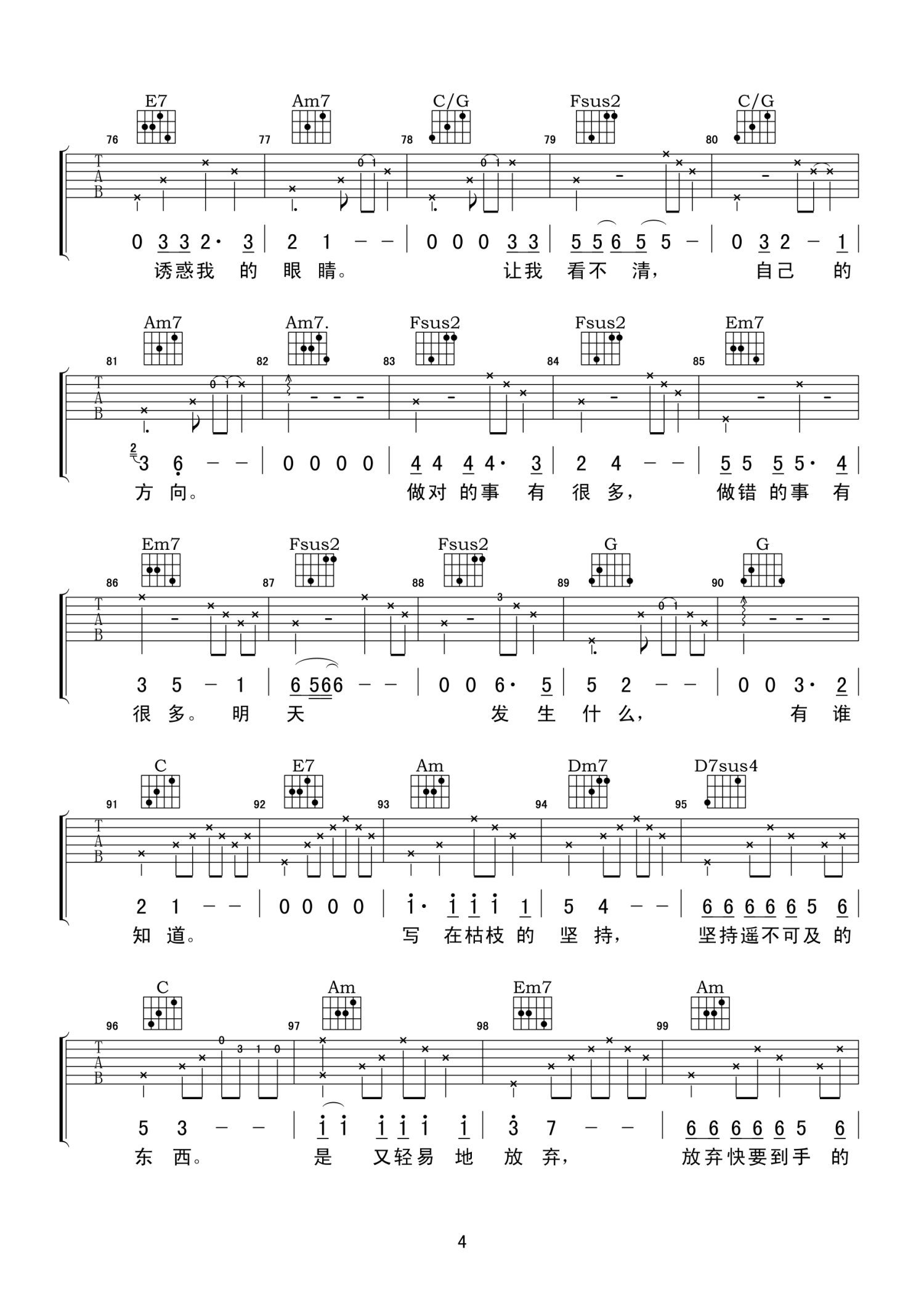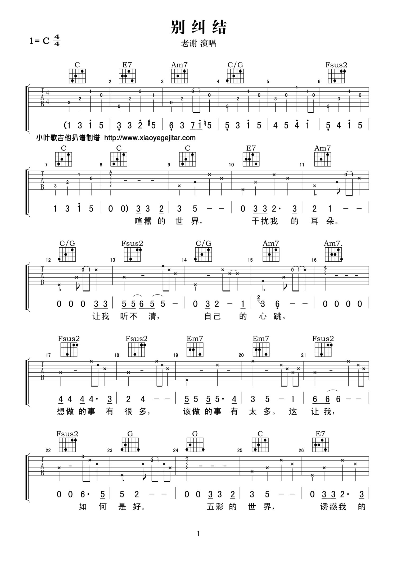 曲谱介绍: C调版《别纠结》吉他弹唱六线谱