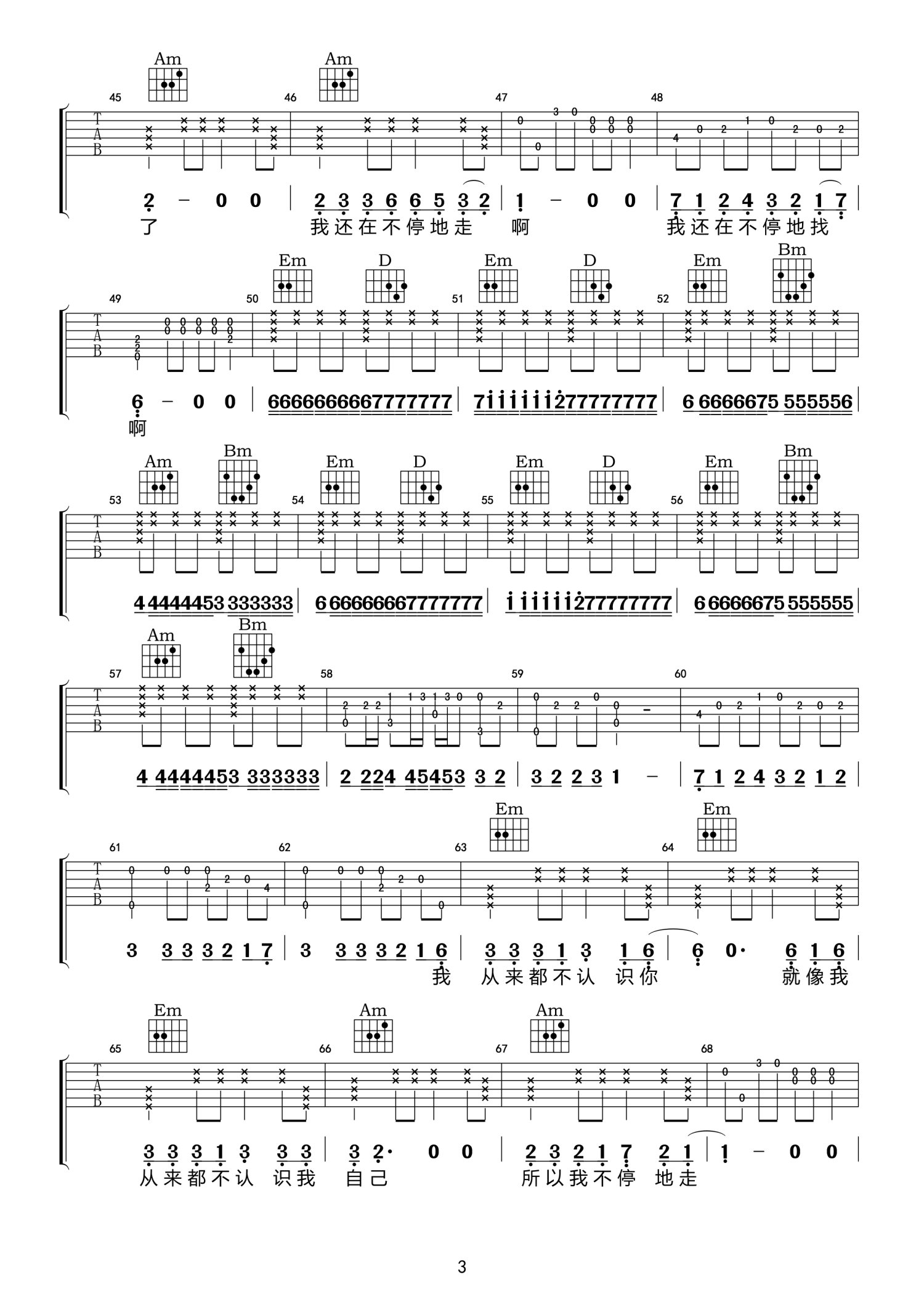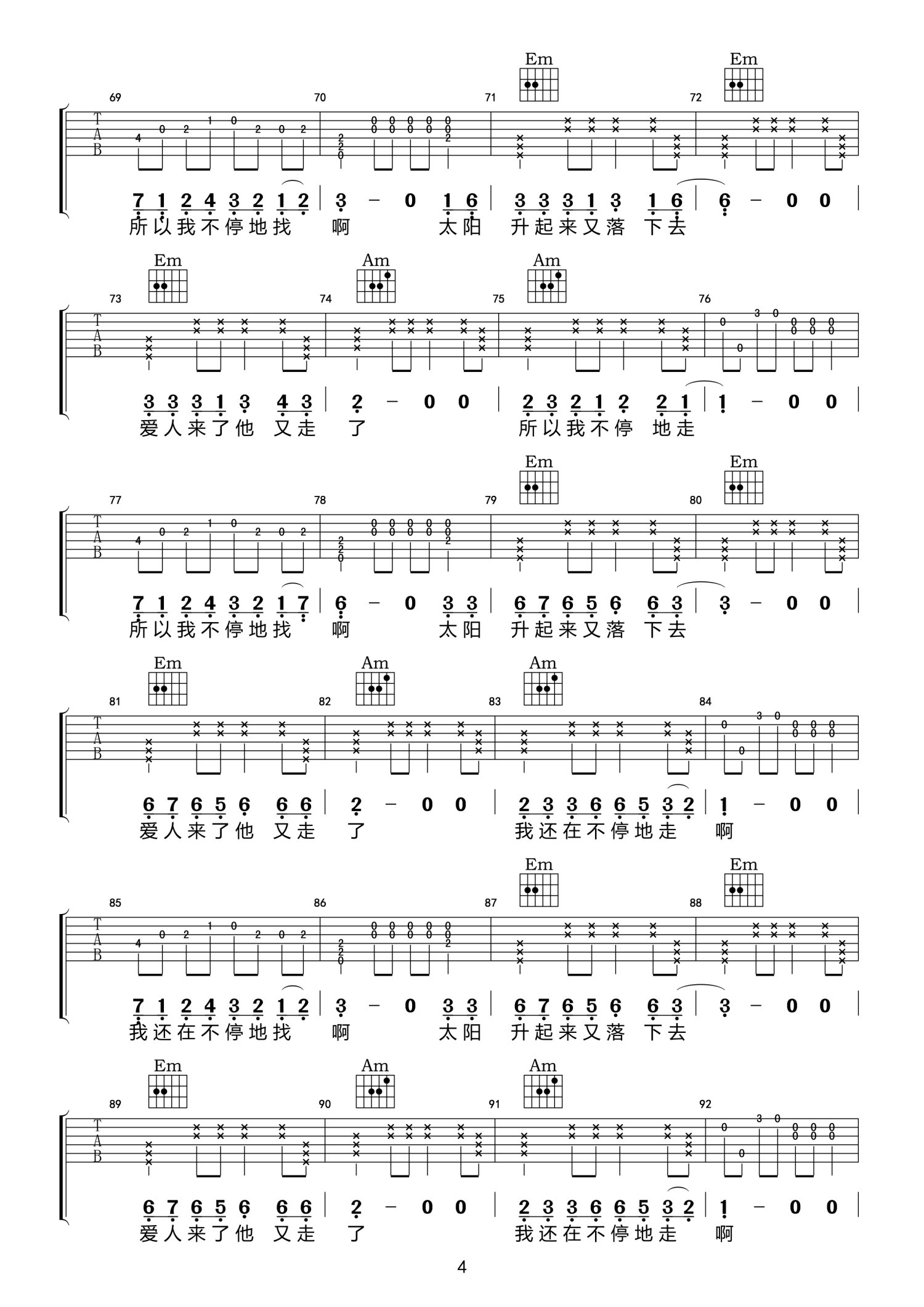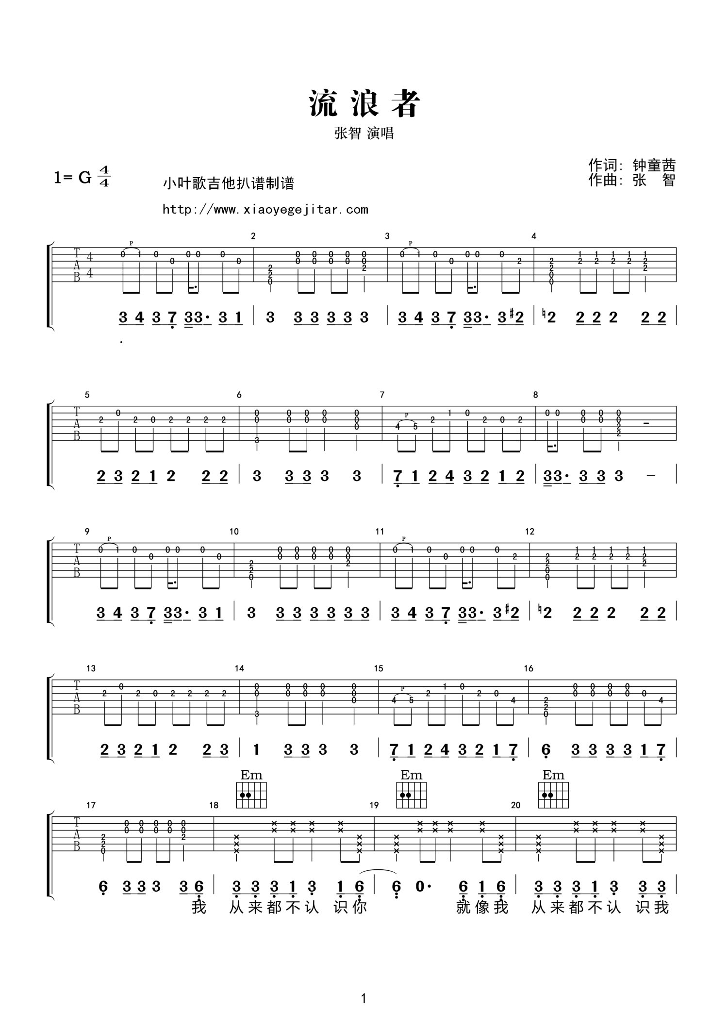 曲谱介绍: G调版《流浪者》吉他弹唱六线谱