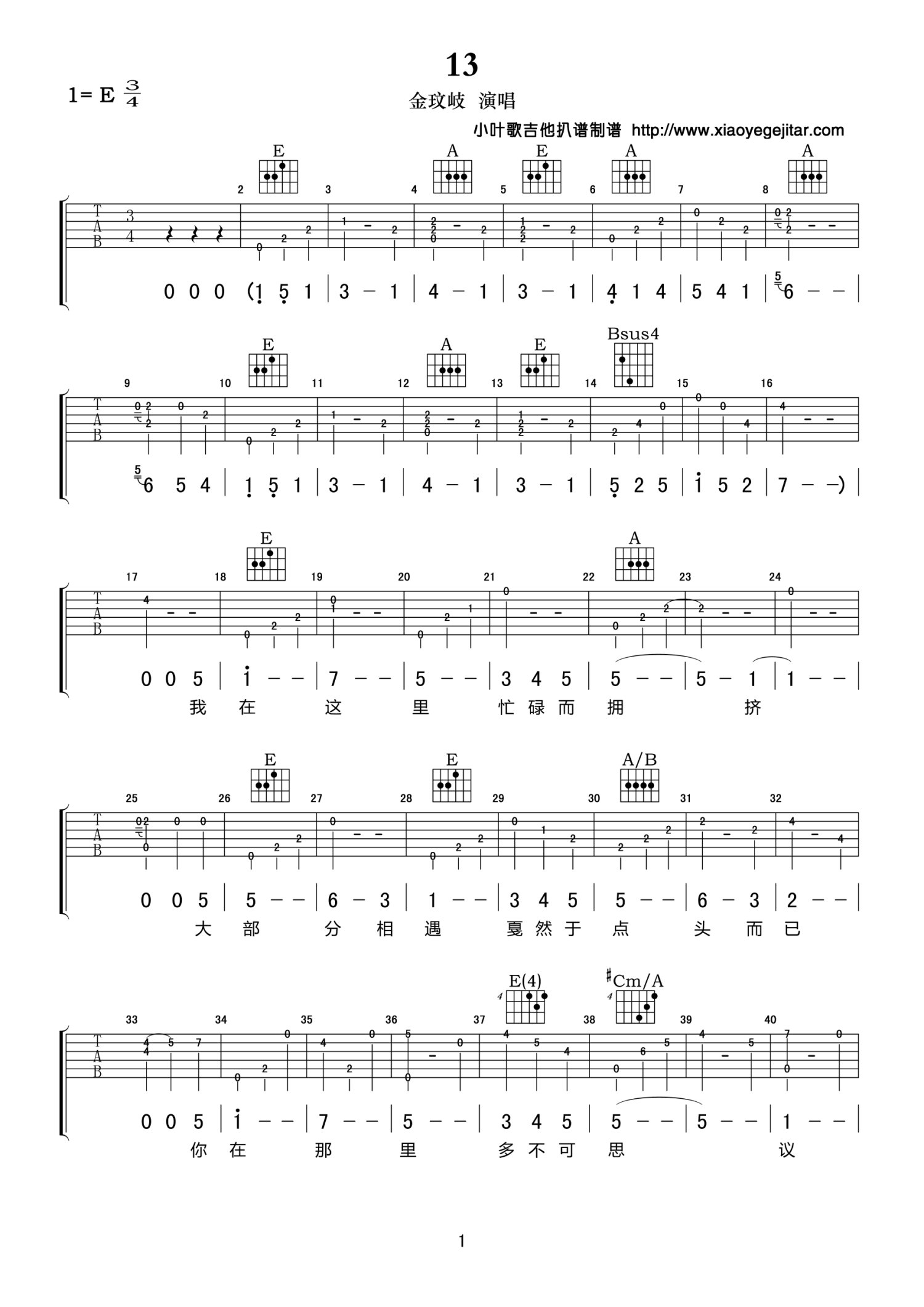 13吉他谱 - 金玟岐 - E调吉他弹唱谱