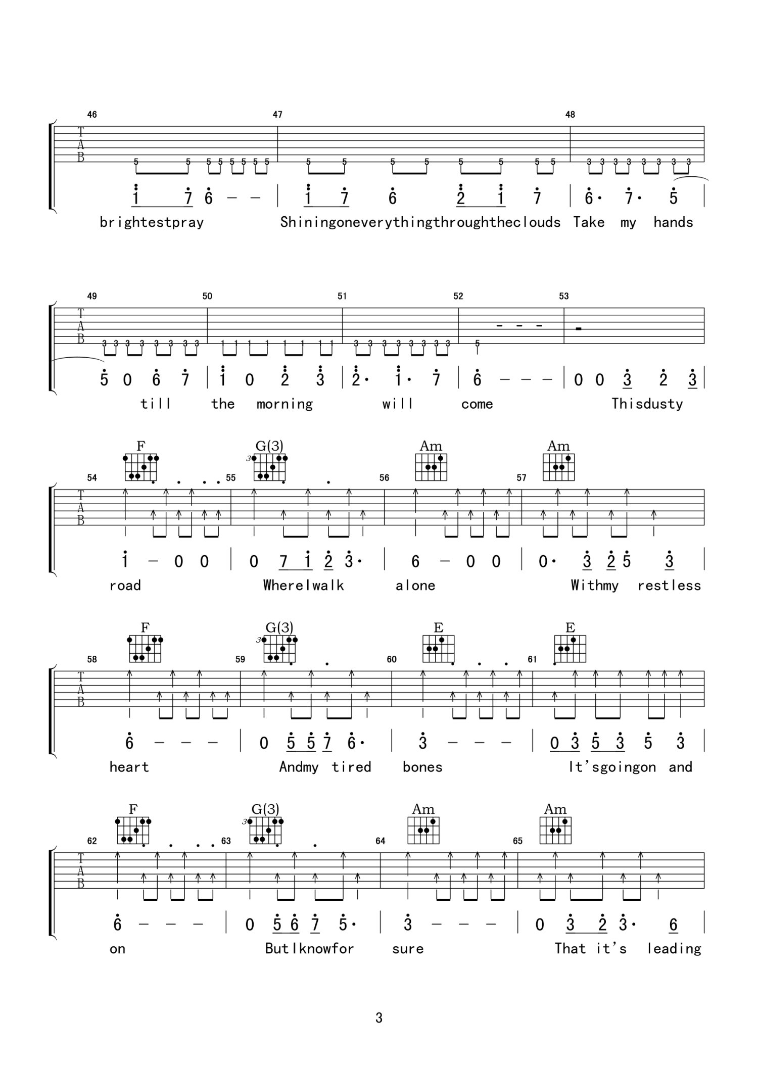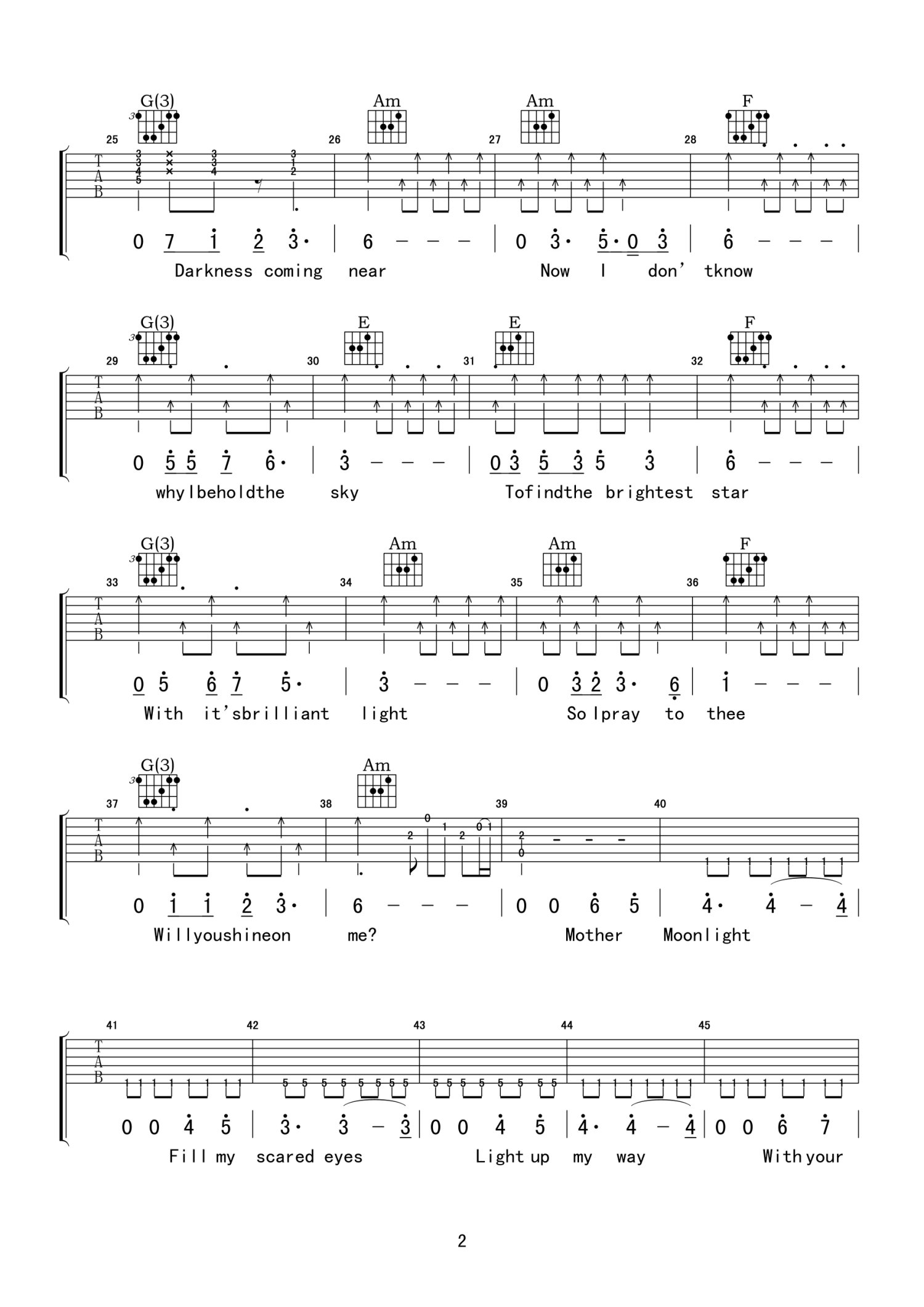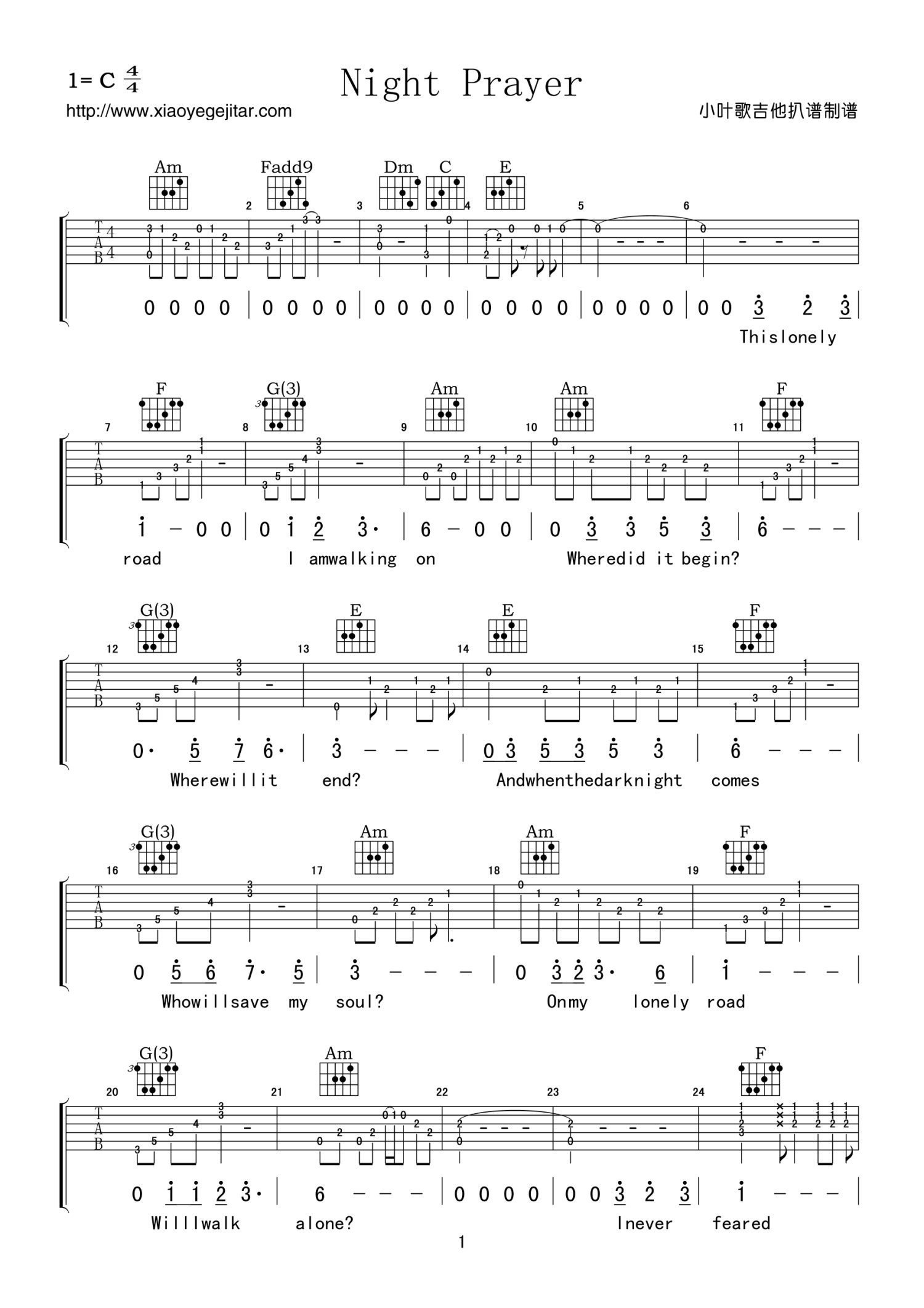曲谱介绍: C调版《NightPrayer》吉他弹唱六线谱