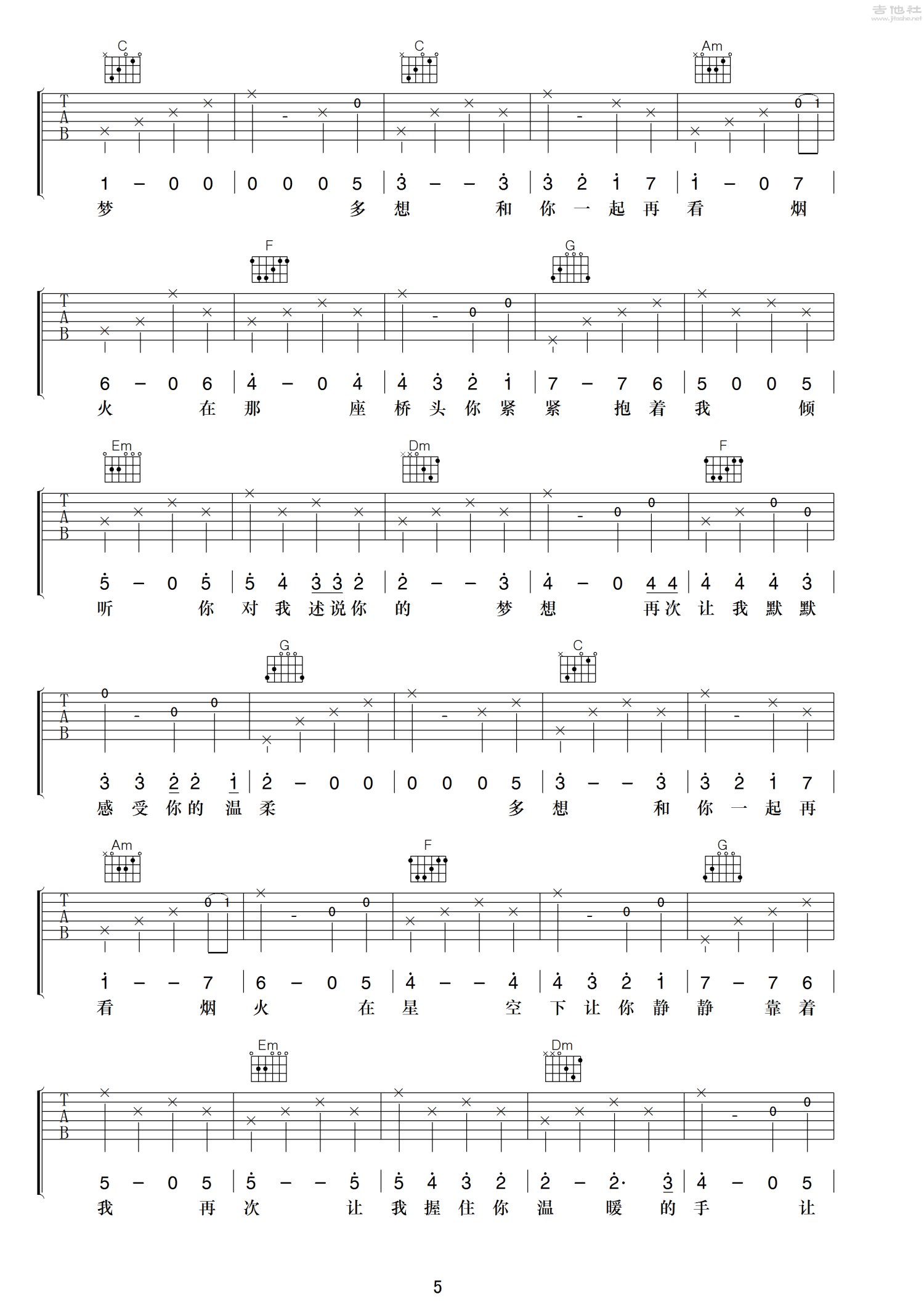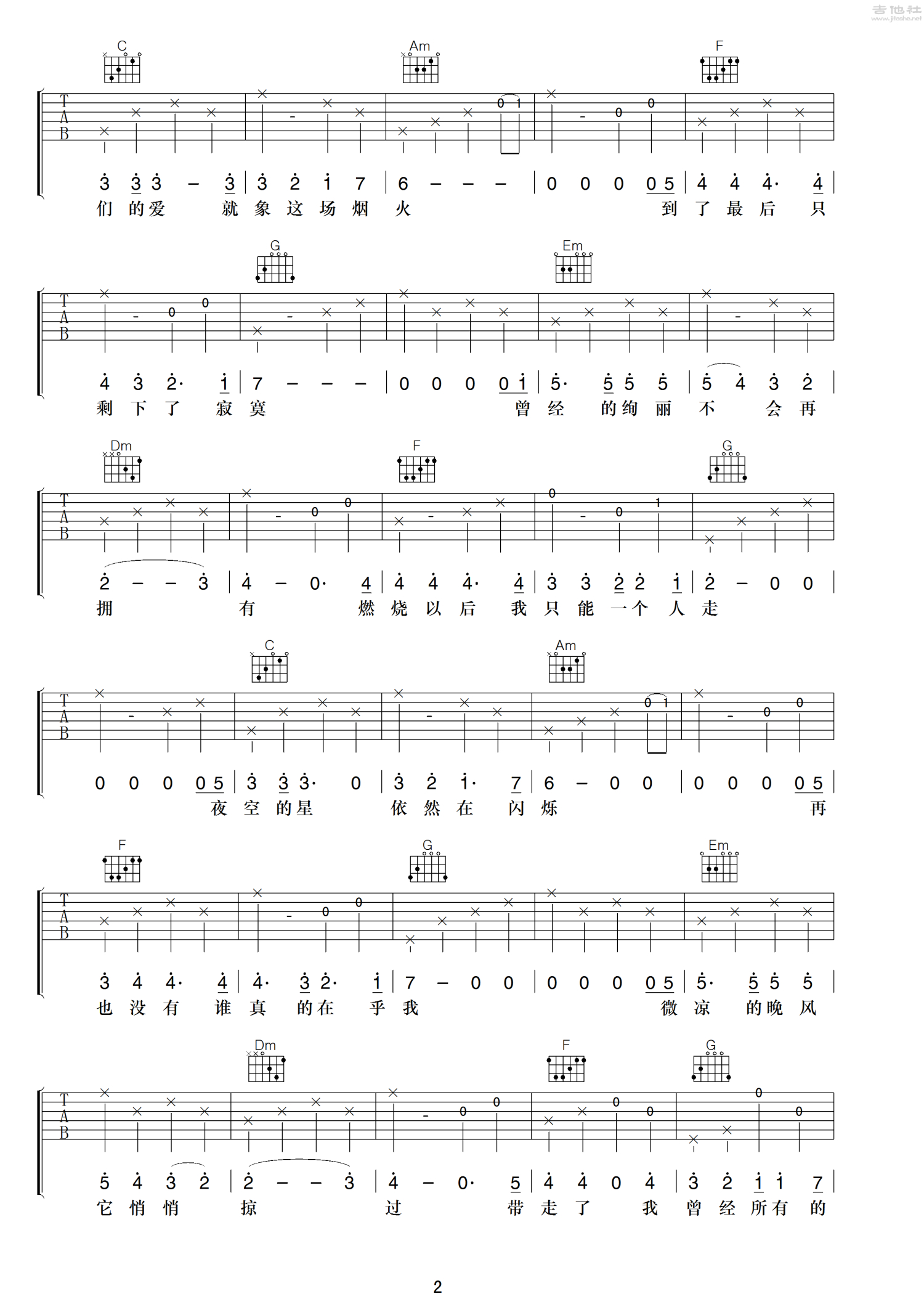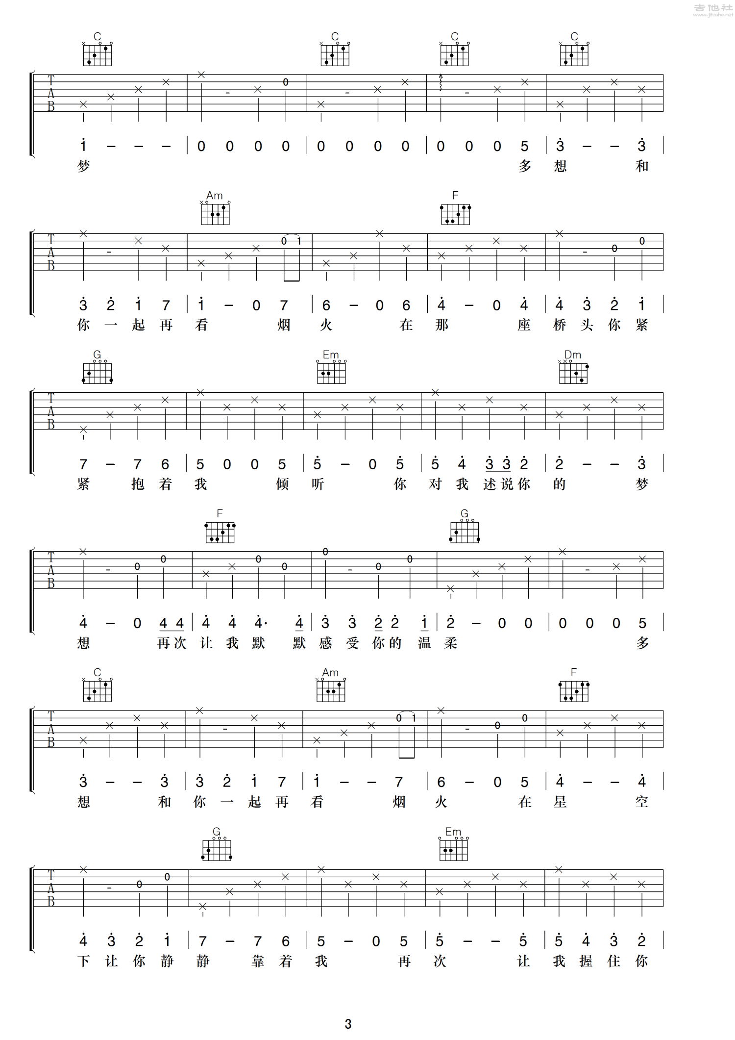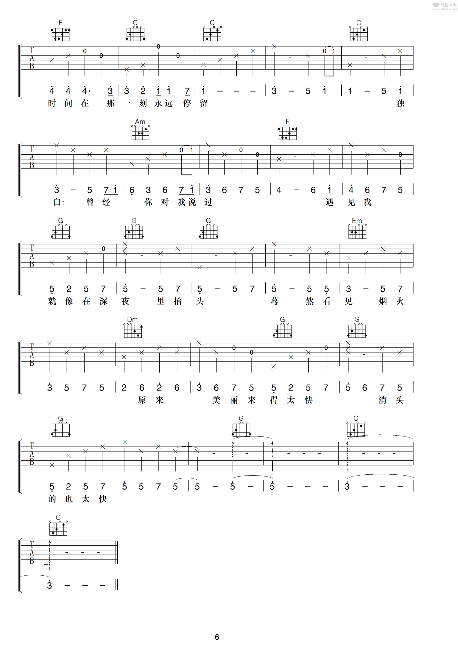 曲谱介绍: 版多想和你再看一次烟火》吉他六线谱