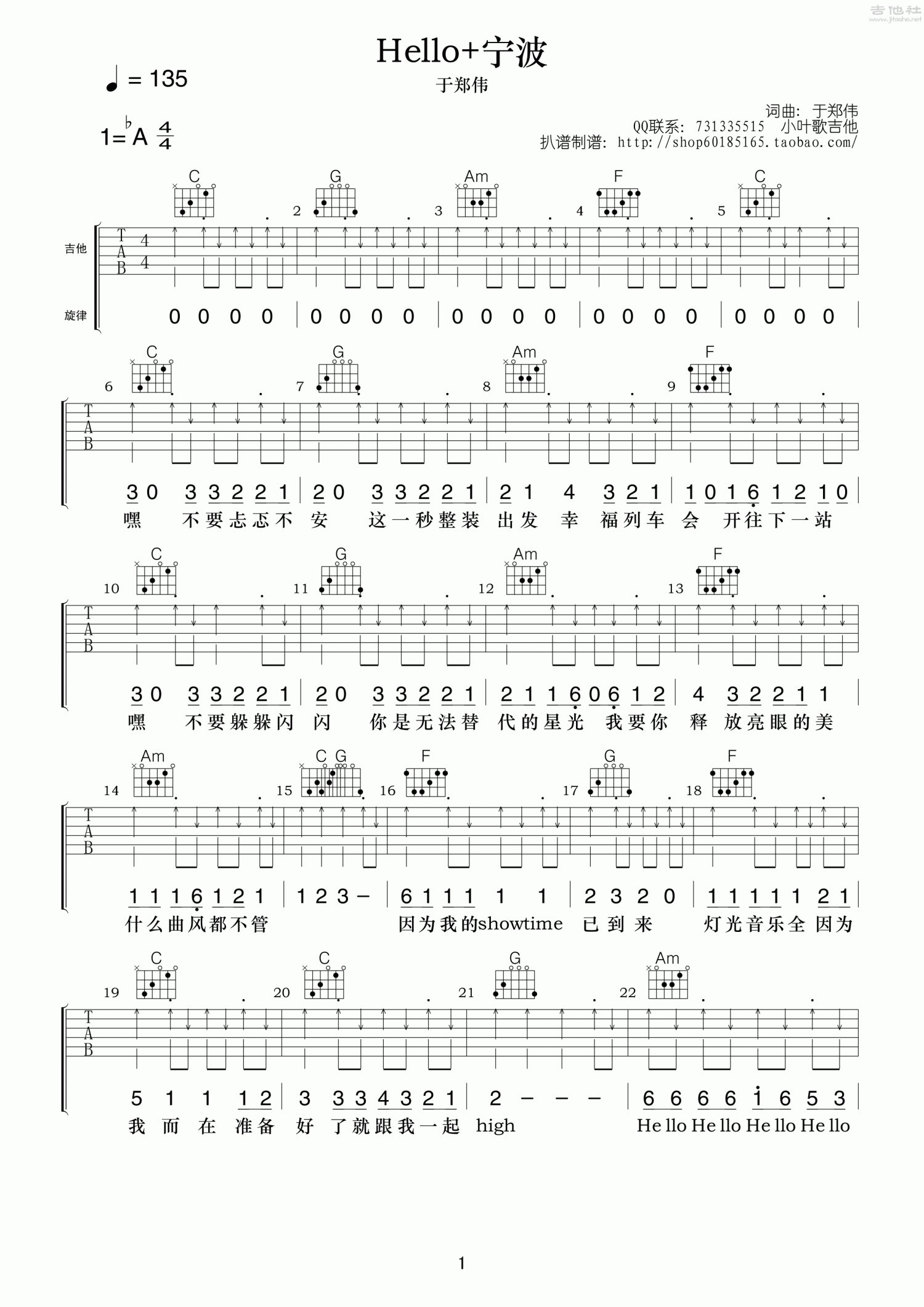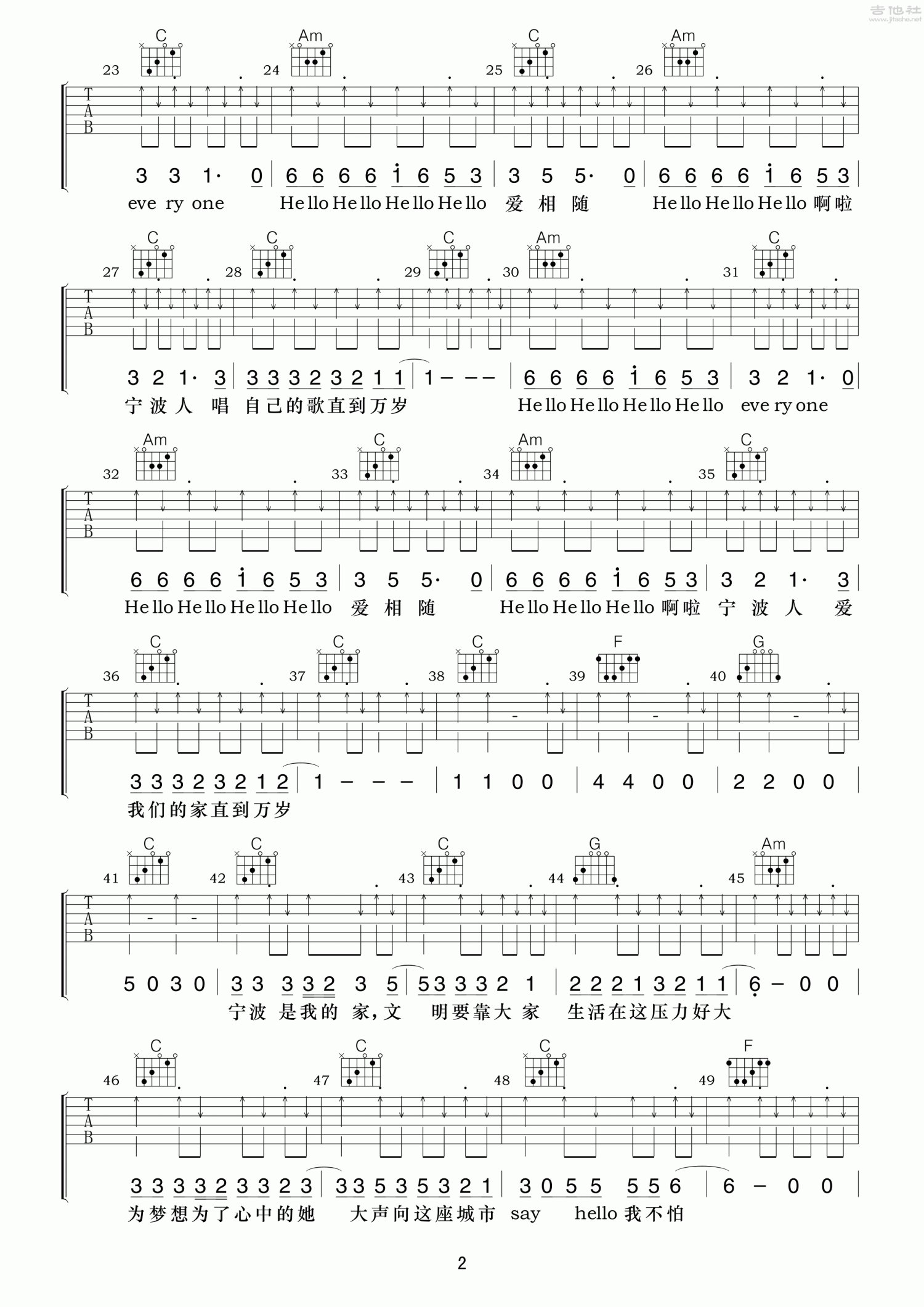 曲谱介绍: G调版《Hello宁波》吉他弹唱六线谱