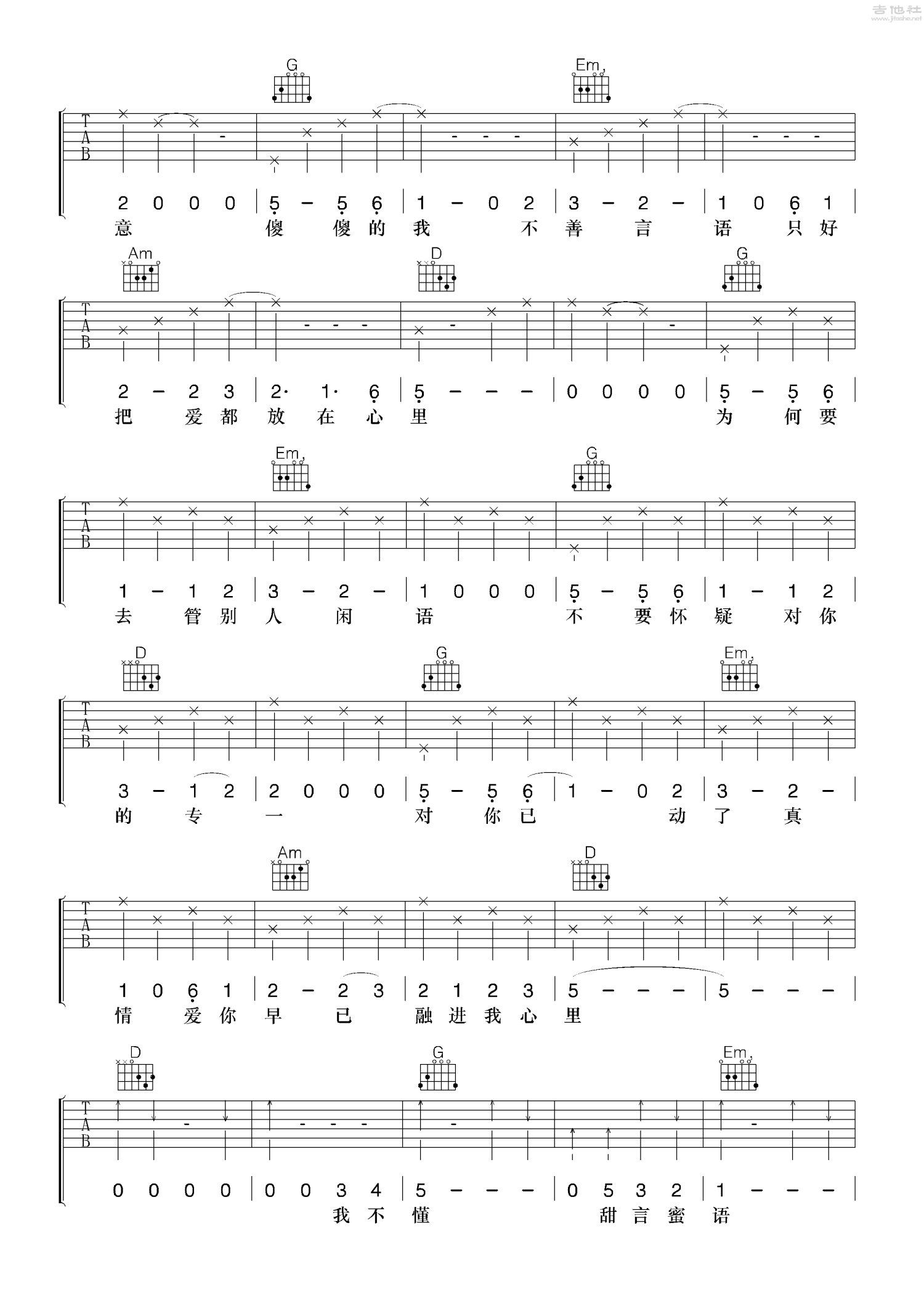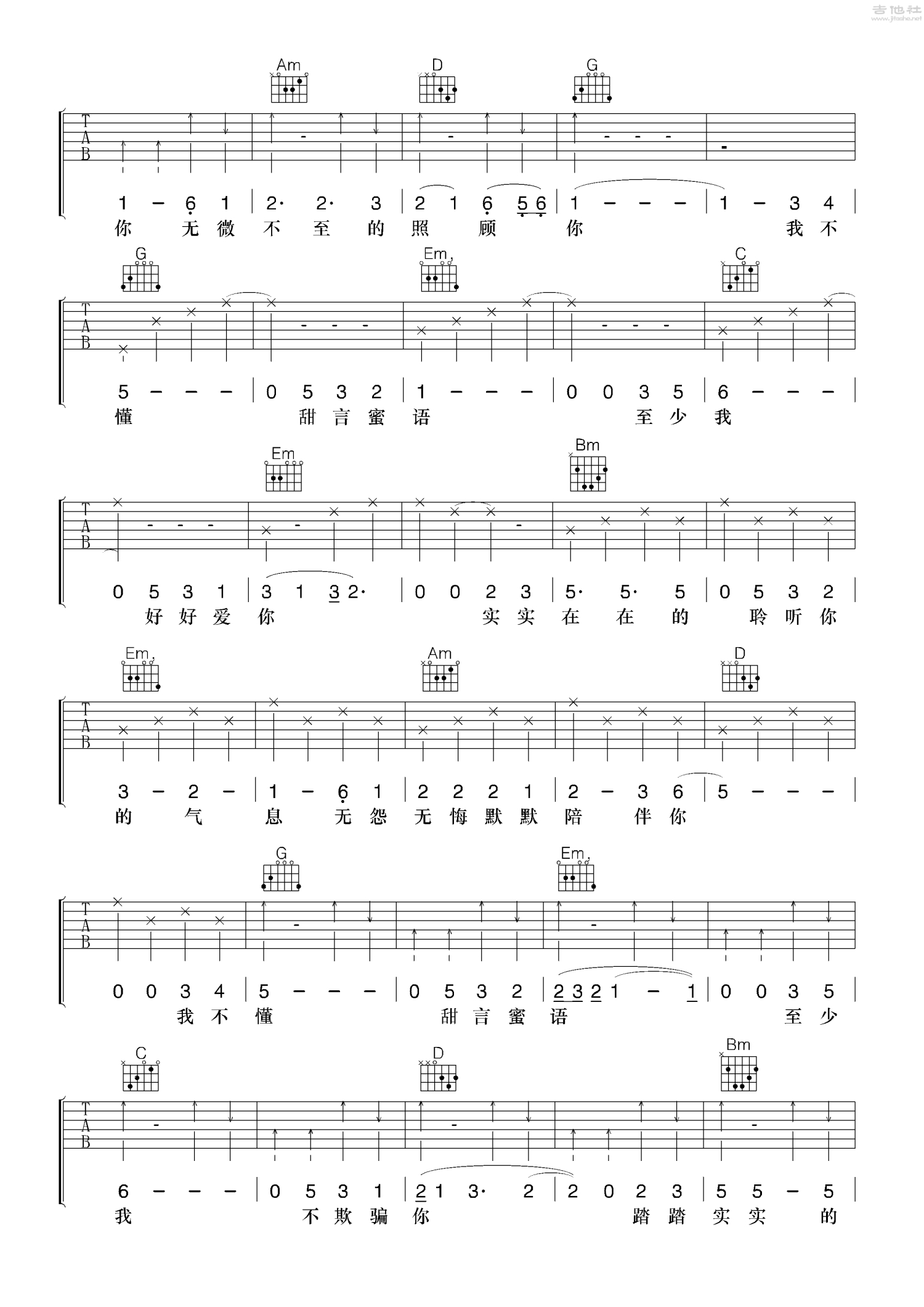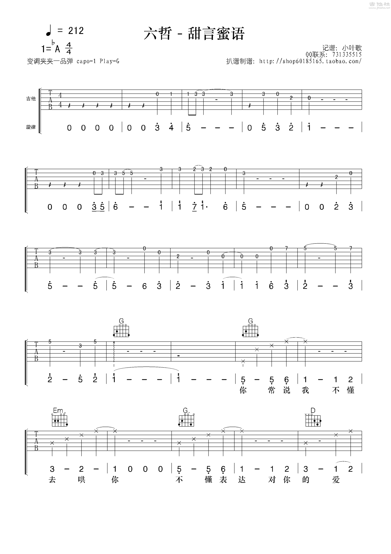 曲谱介绍: G调版《甜言蜜语》吉他弹唱六线谱
