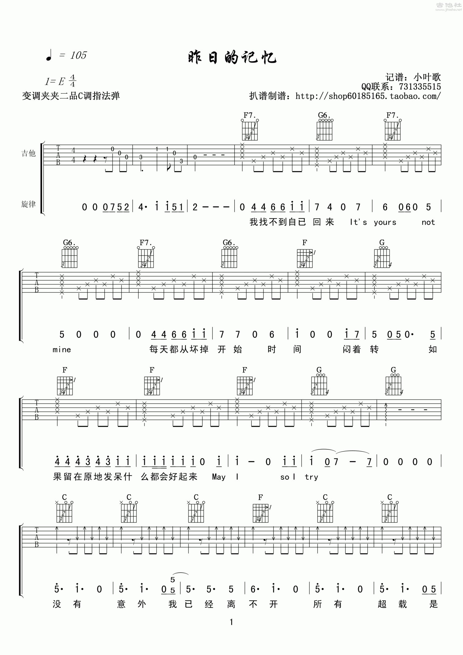 曲谱介绍: C调版《昨日的记忆》吉他弹唱六线谱