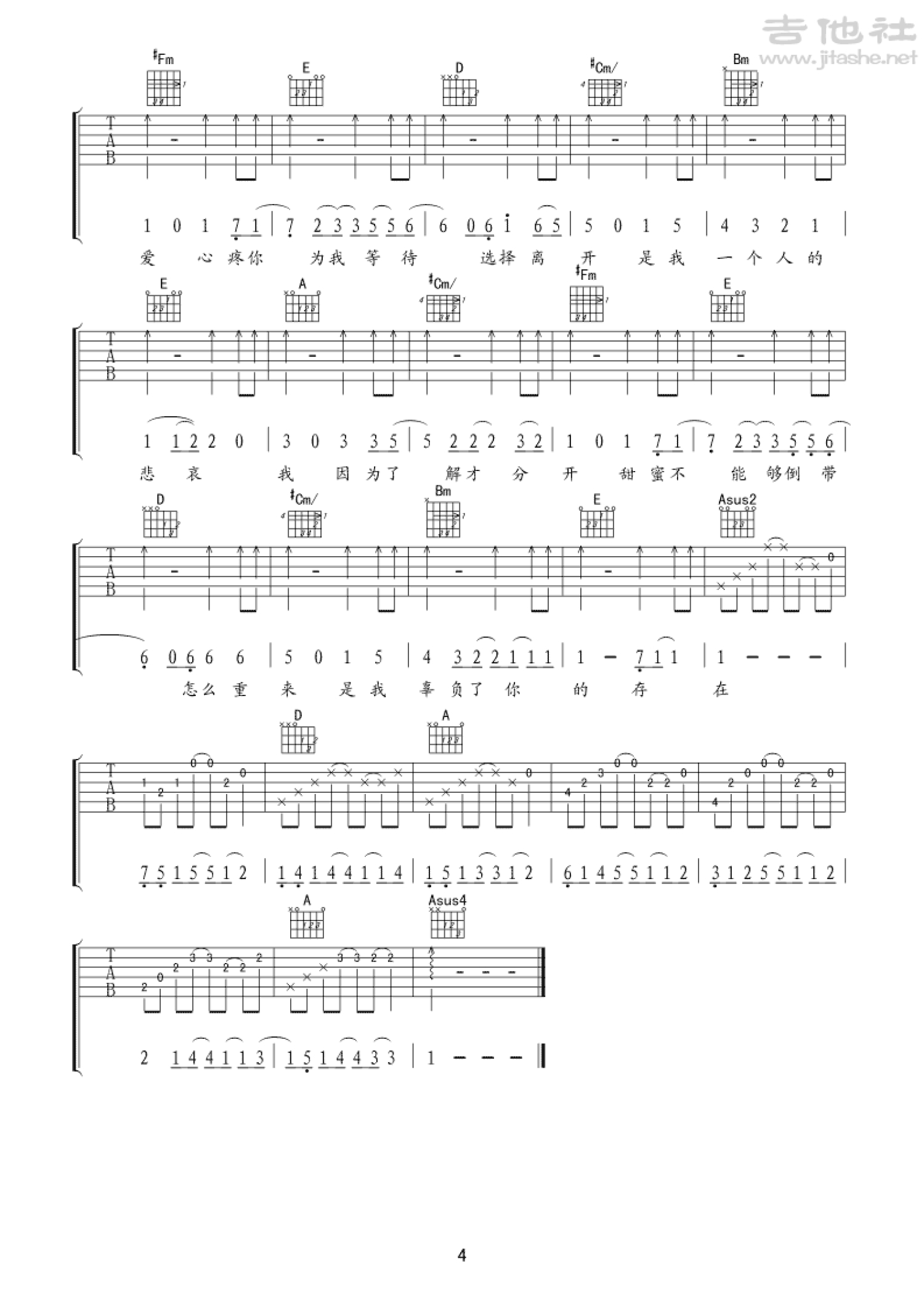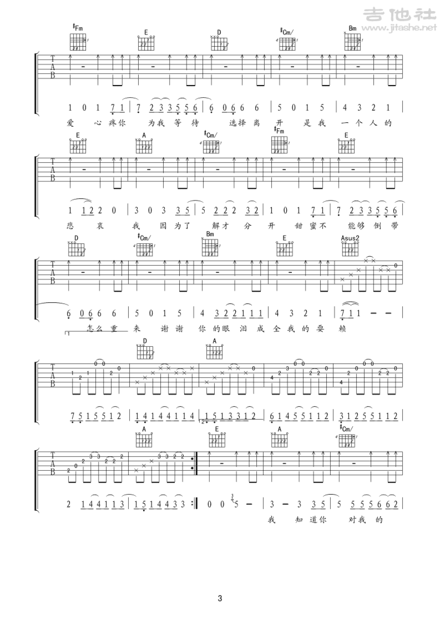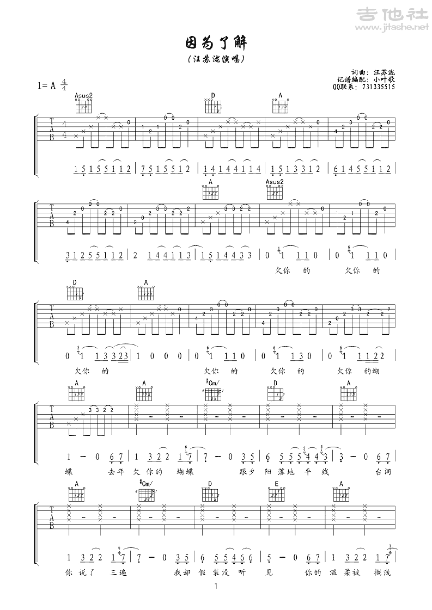 曲谱介绍: A调版《因为了解》吉他弹唱六线谱