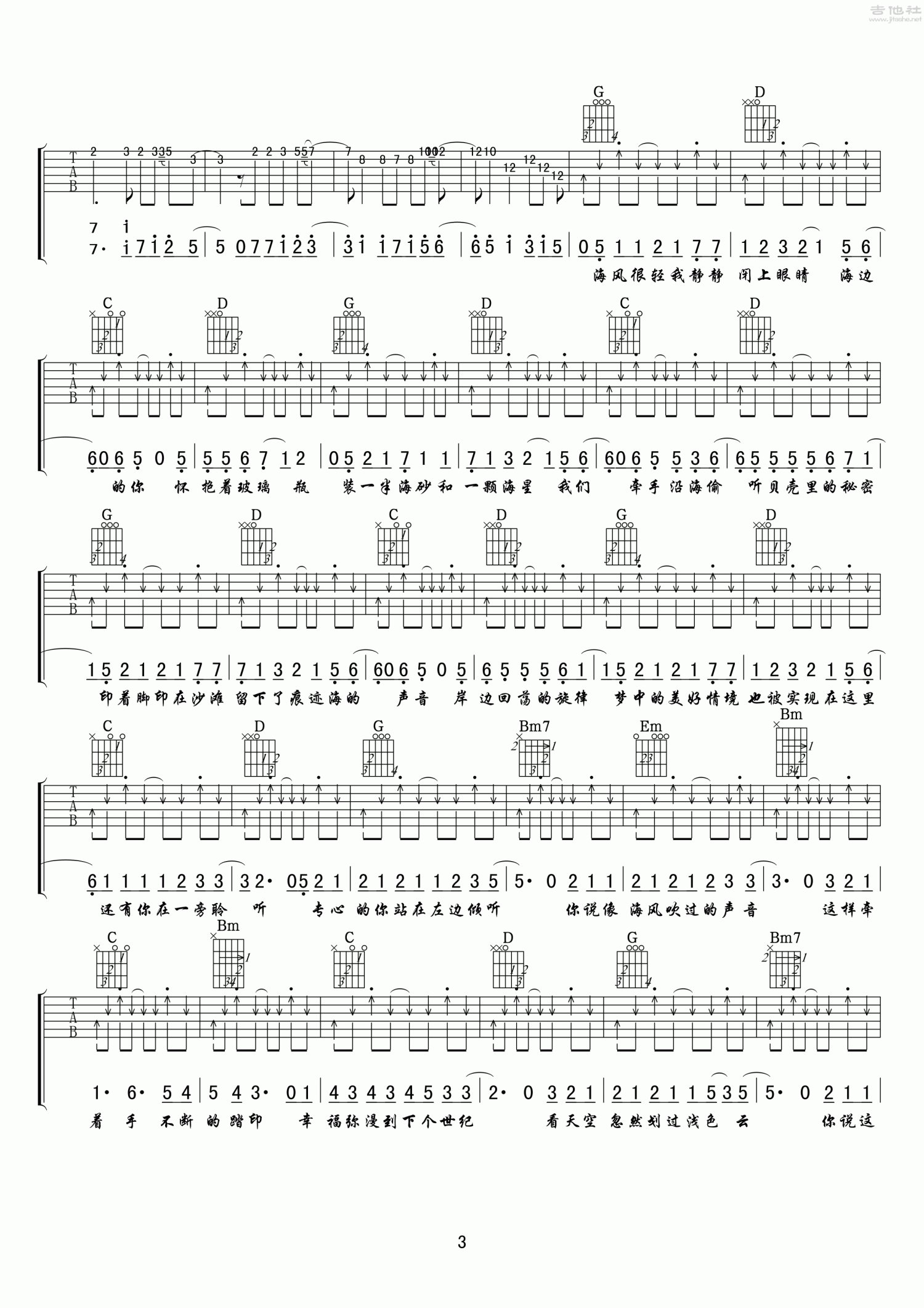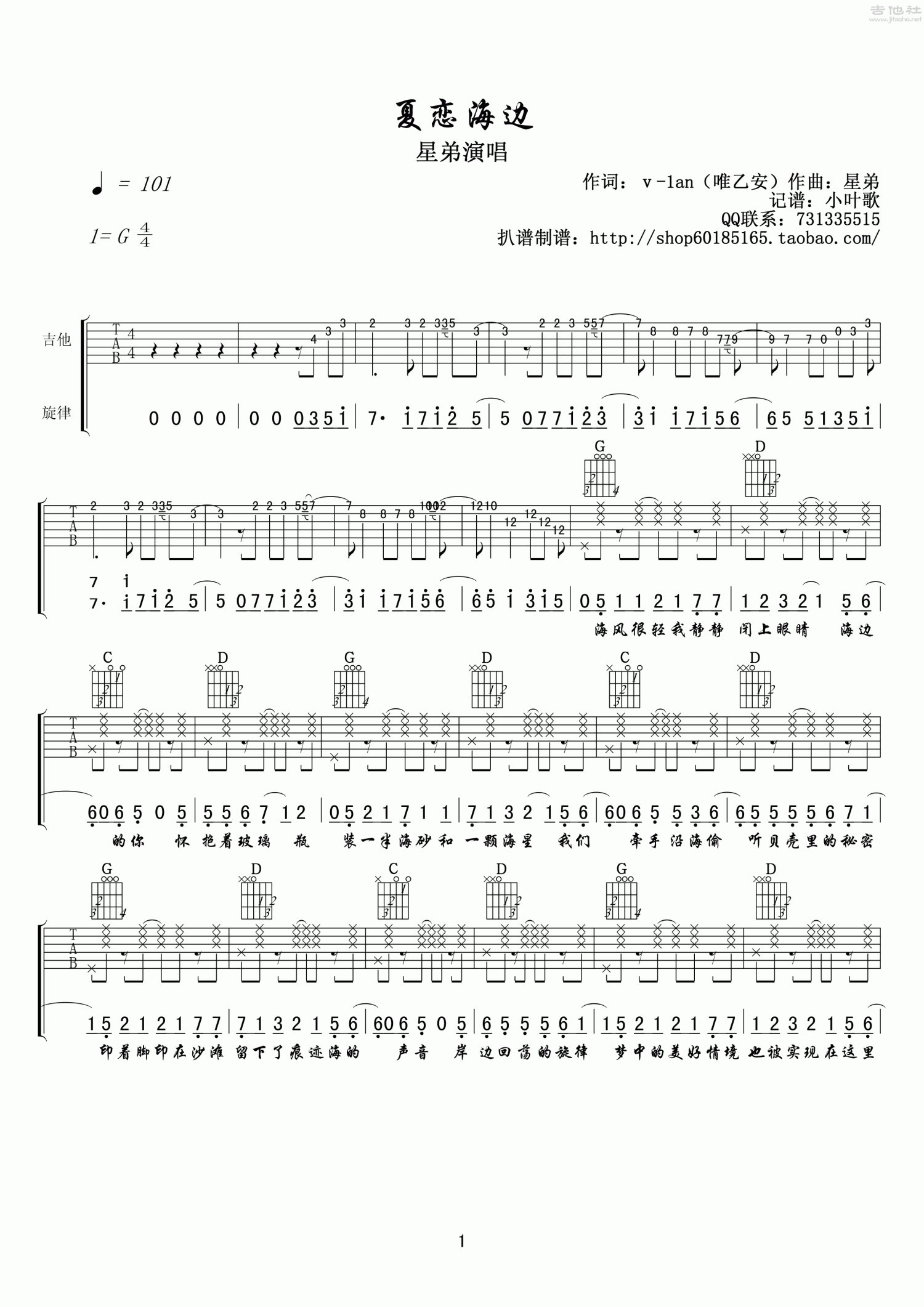 曲谱介绍: G调版《夏恋海边》吉他弹唱六线谱