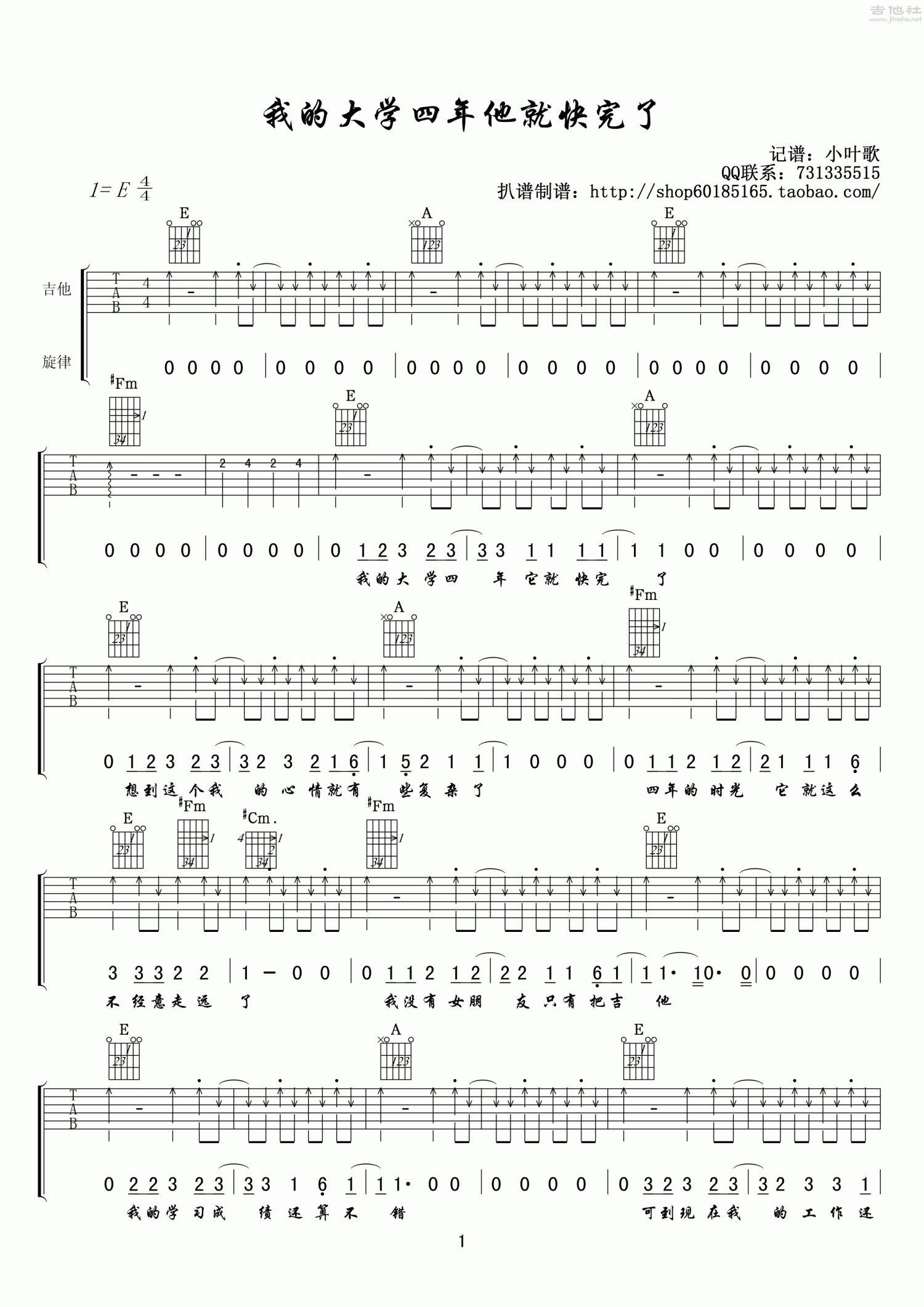 曲谱介绍: 版《我的大学四年他就快完了》吉他弹唱六线谱