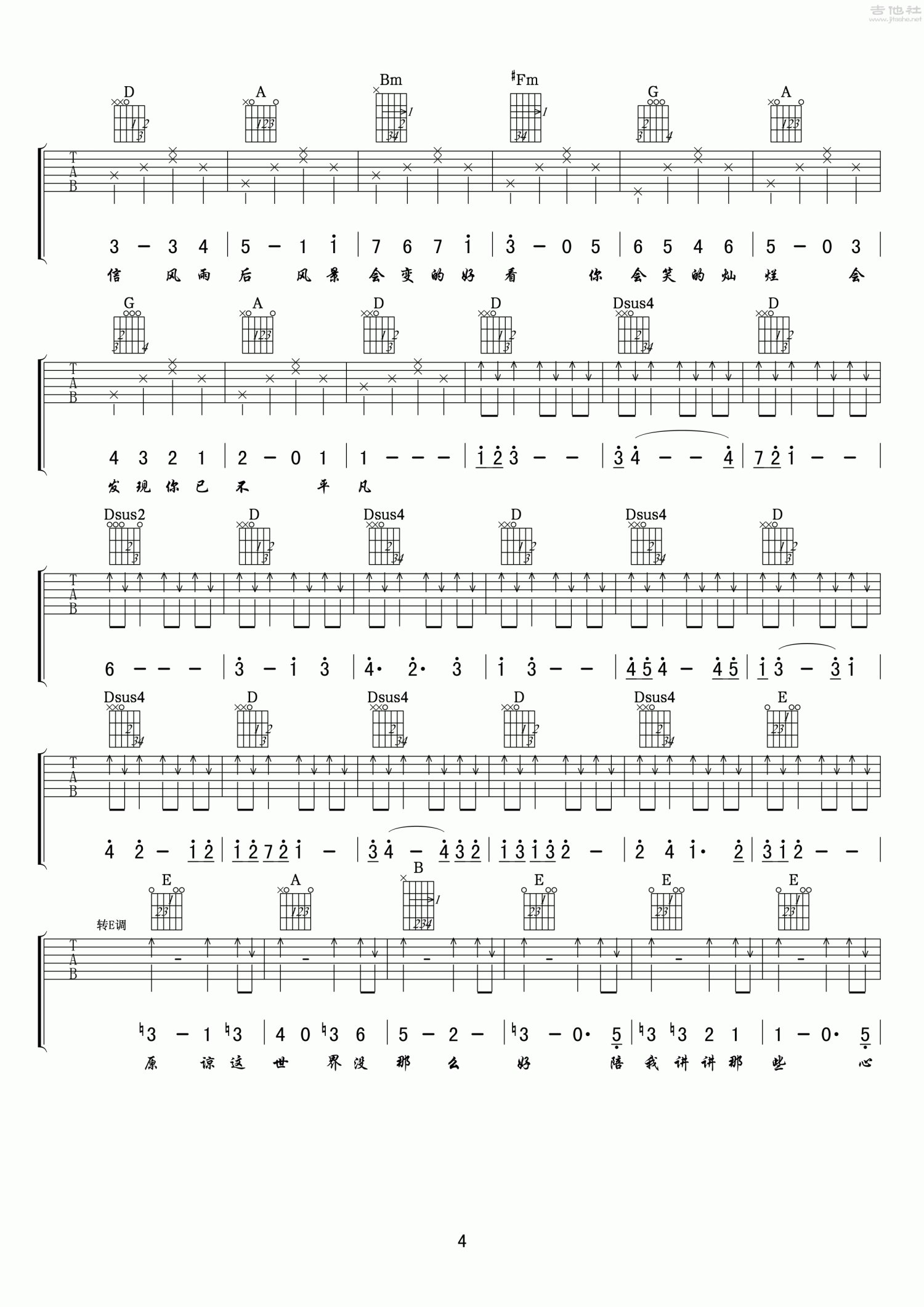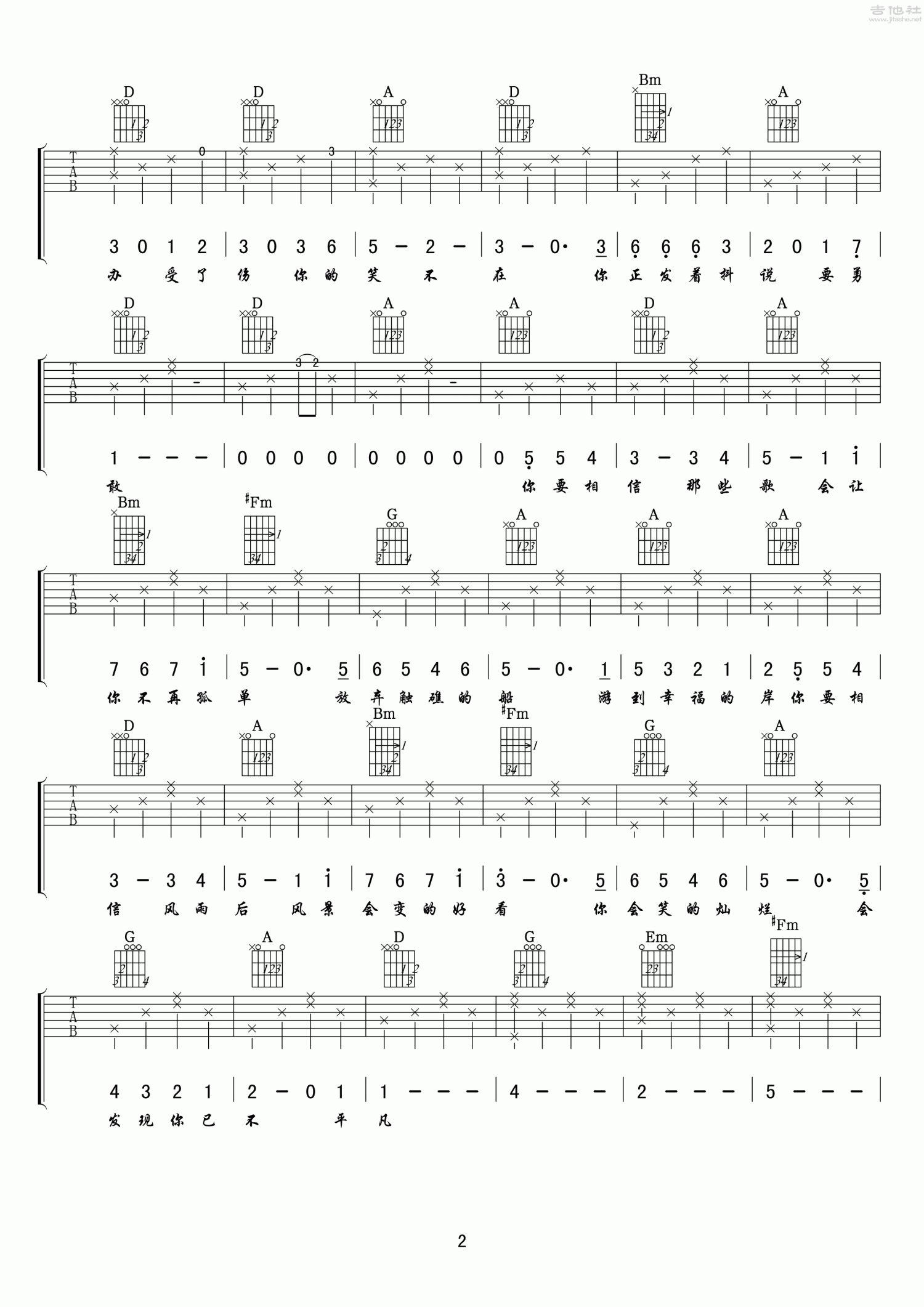 曲谱介绍: D调版《原谅这世界没那么好》吉他弹唱六线谱
