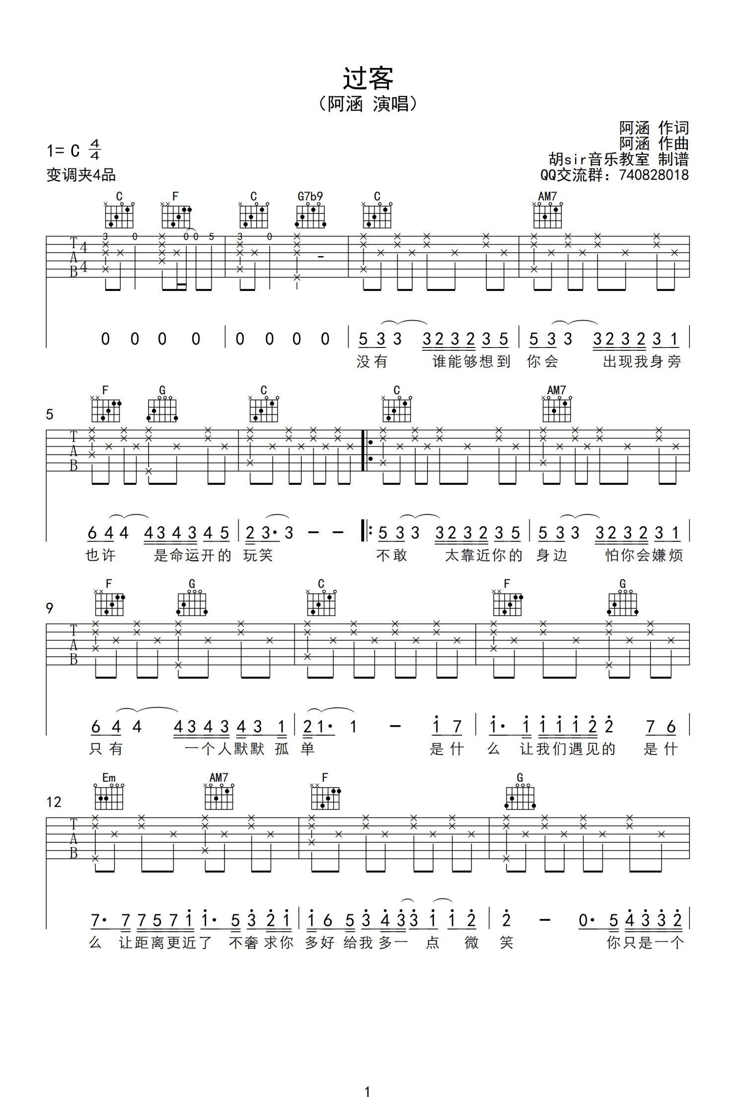 曲谱介绍: 阿涵《过客》吉他谱,C调弹唱谱,变调夹夹第四品。每一个人的出现,都是命中注定,只是,有些人教会你如何去爱了,却成为你生命中的过客。
