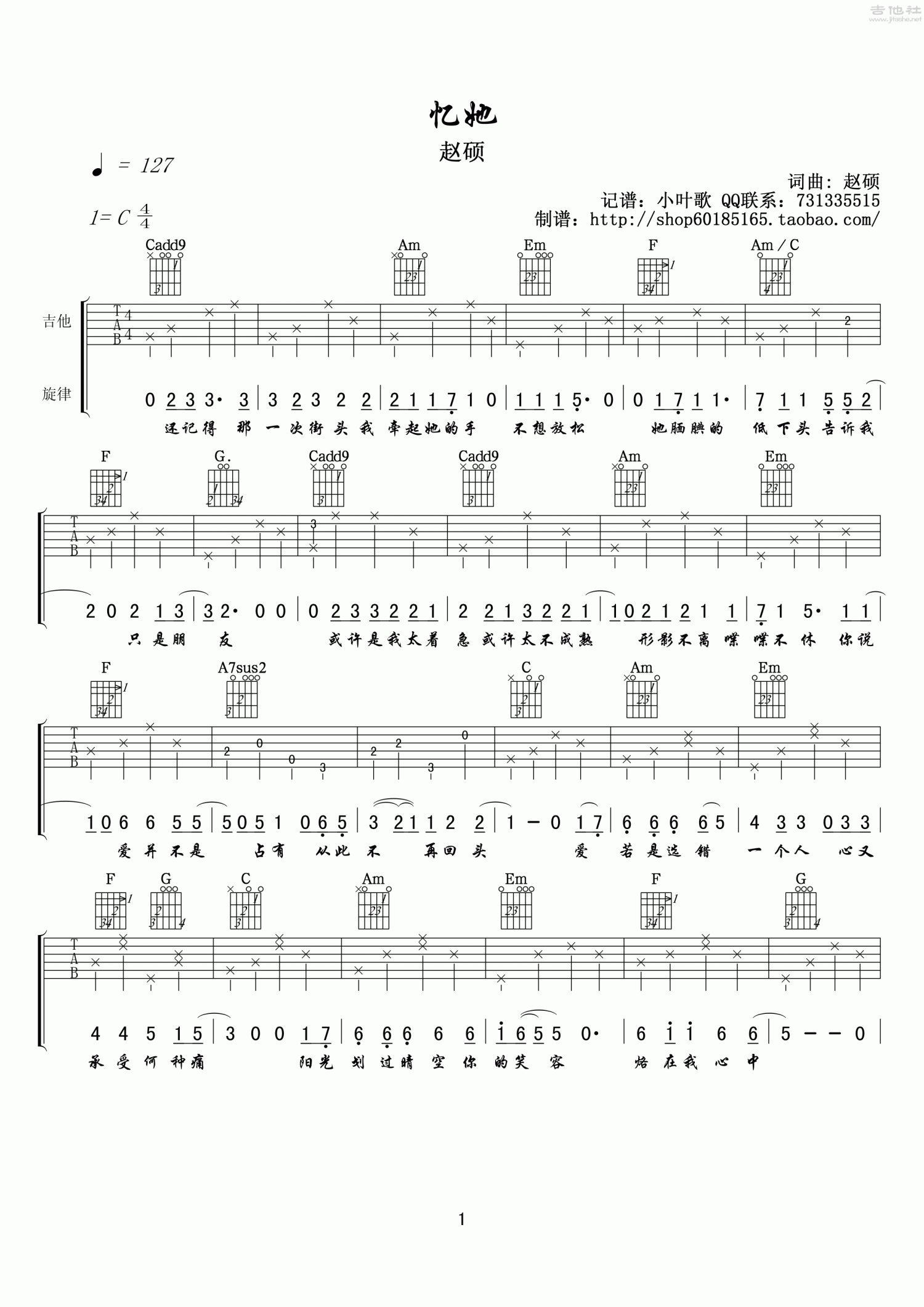 曲谱介绍: C调版《忆她》吉他弹唱六线谱