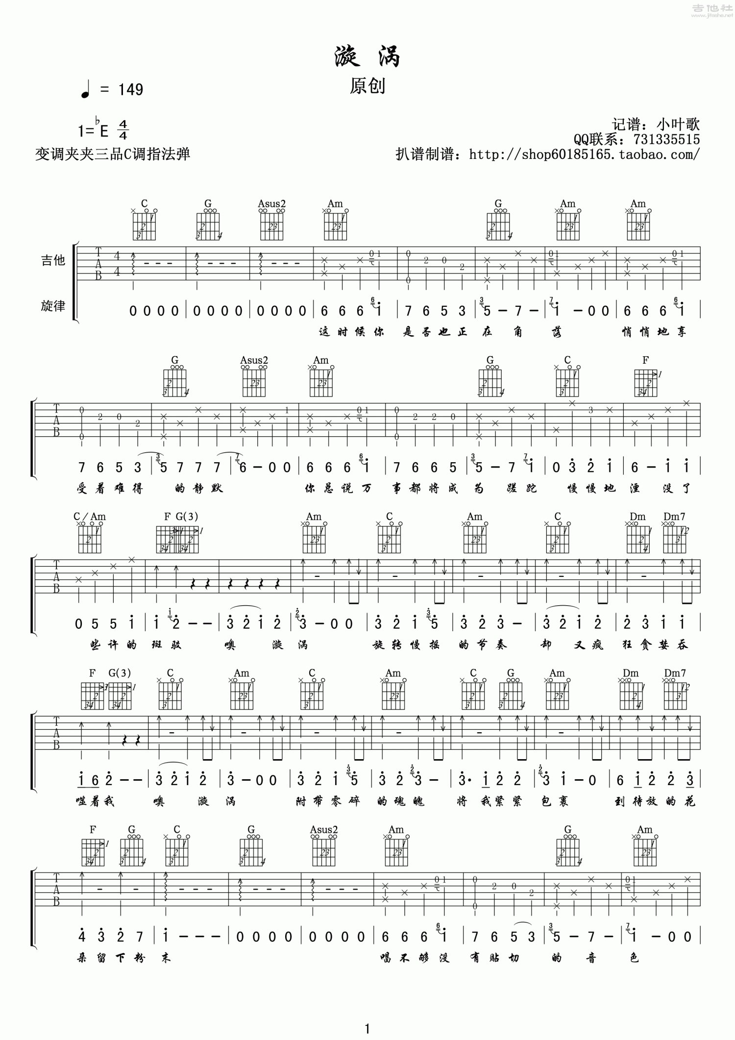 曲谱介绍: C调版原创歌曲《漩涡》吉他弹唱六线谱
