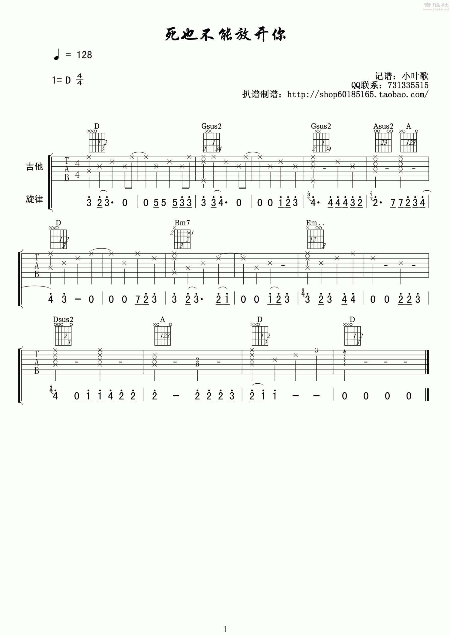 曲谱介绍: D调版《死也不能放开你》吉他弹唱六线谱