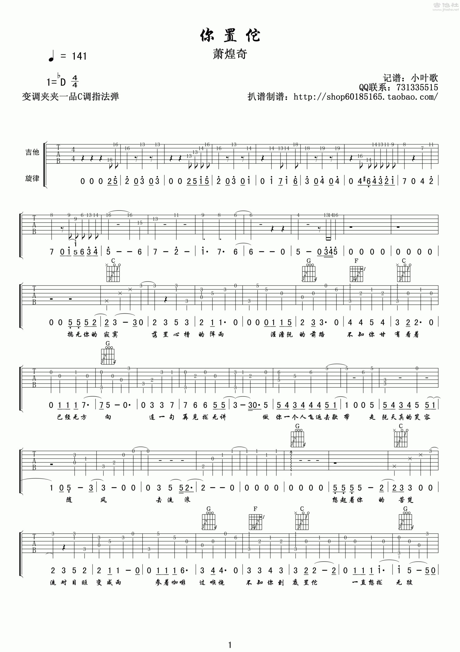 曲谱介绍: C调版《你置佗》吉他弹唱六线谱