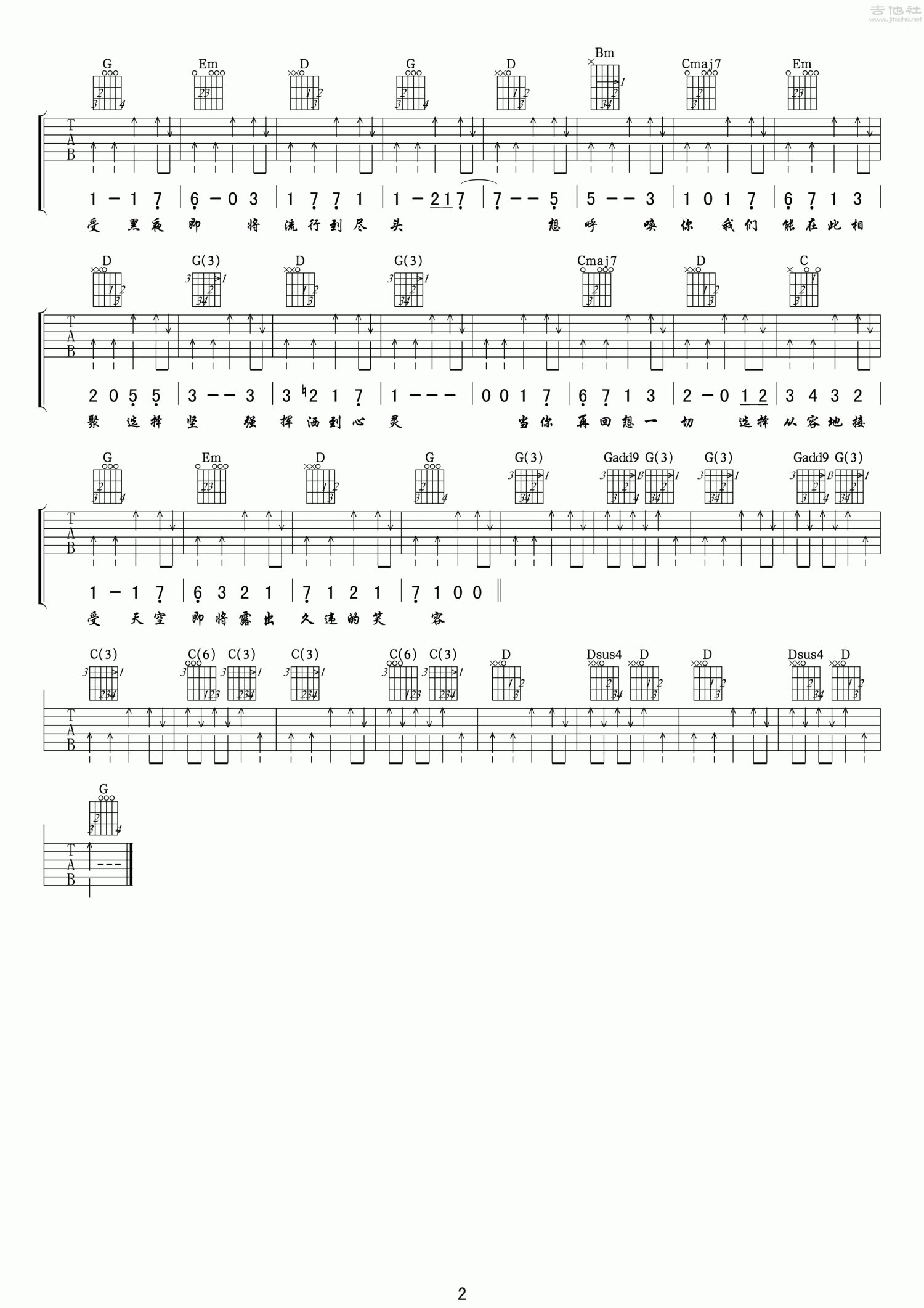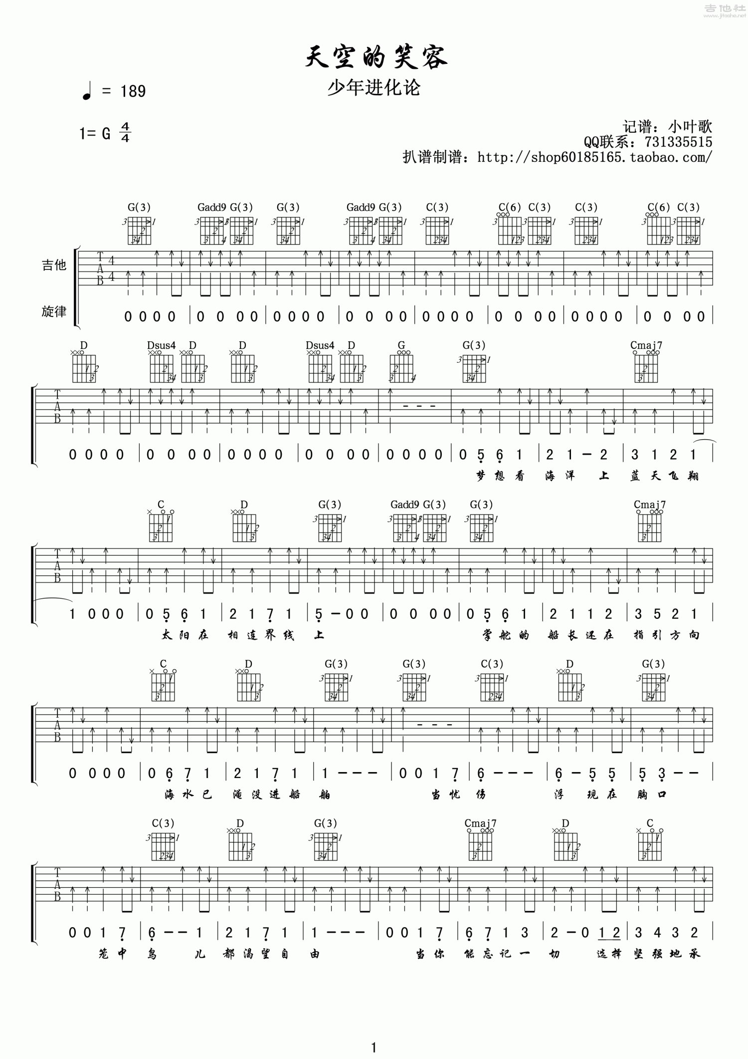 曲谱介绍: G调版《天空的笑容》吉他弹唱六线谱