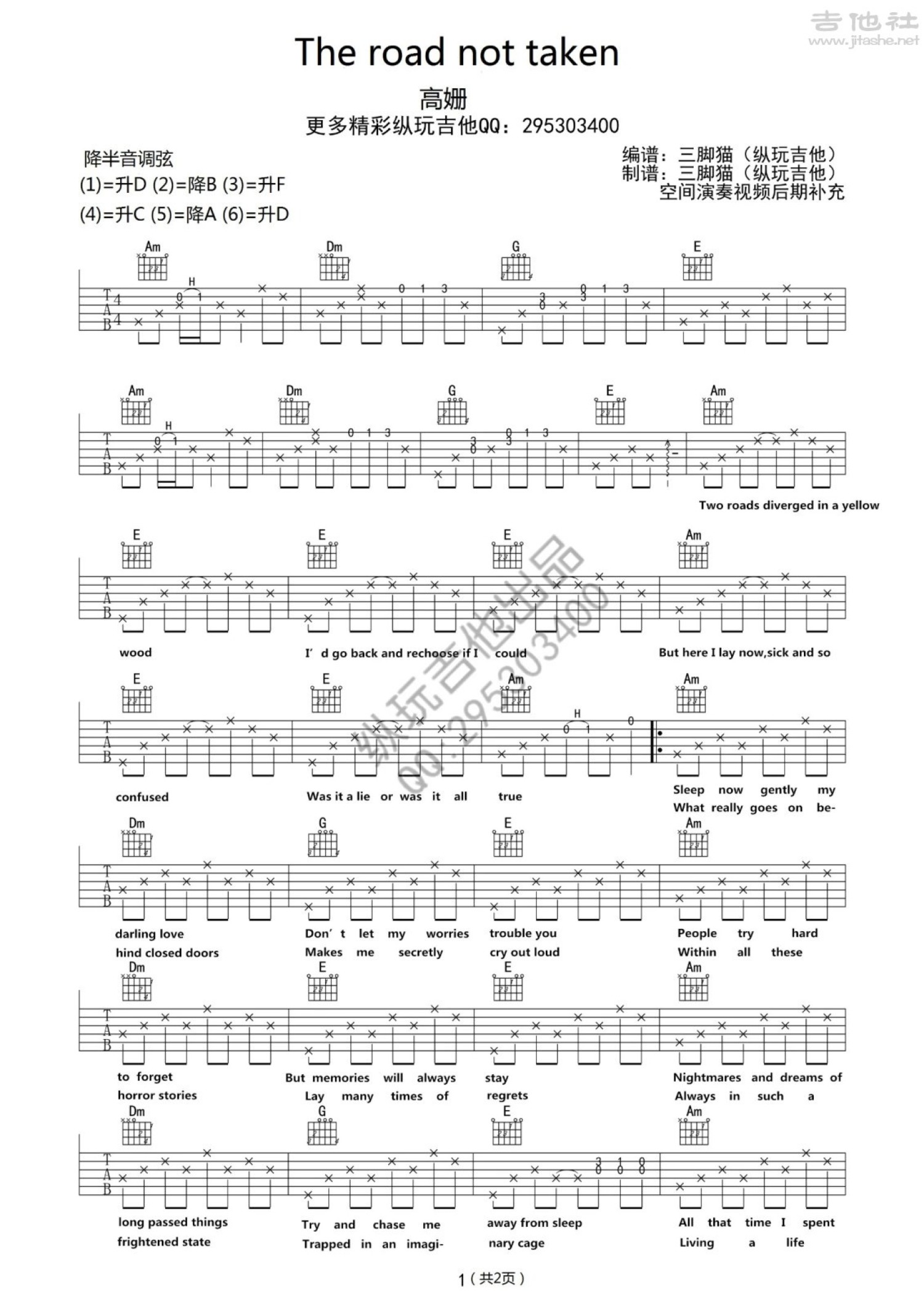 曲谱介绍: 版《TheRoadNotTaken》吉他弹唱六线谱