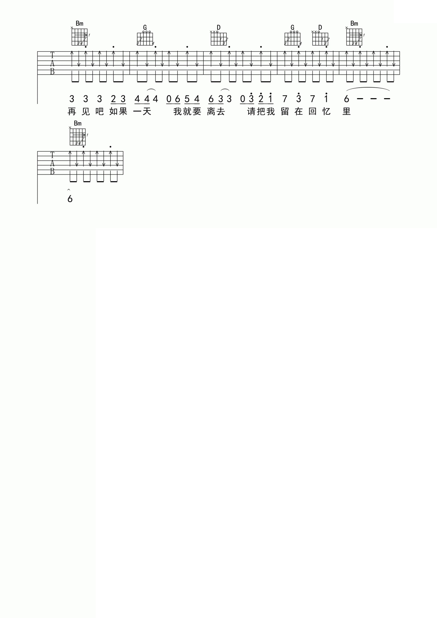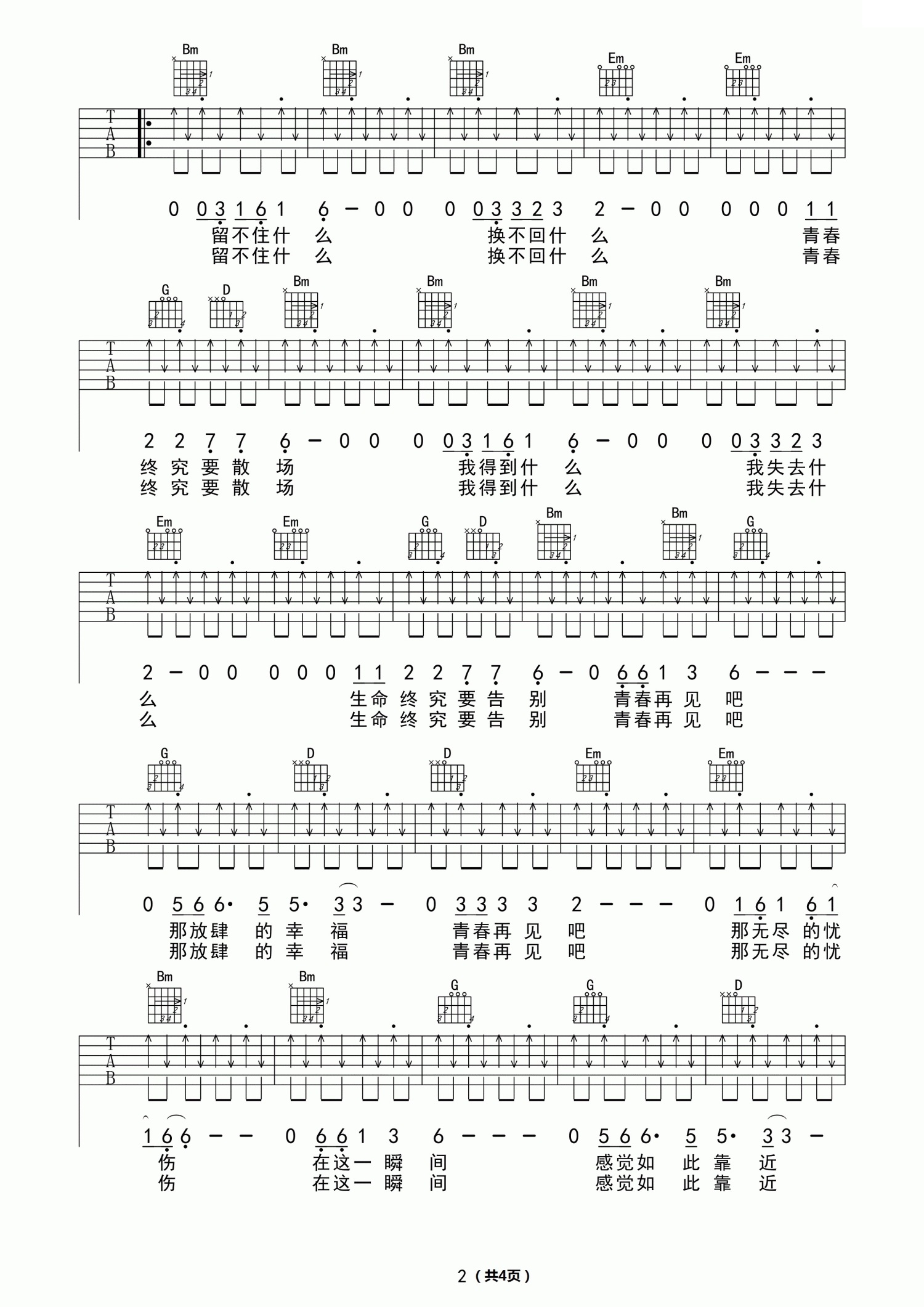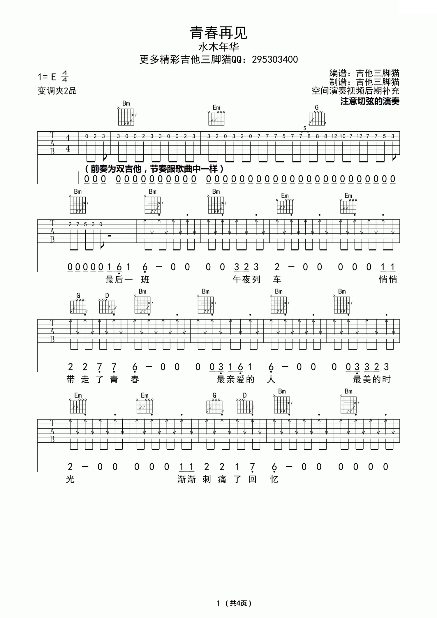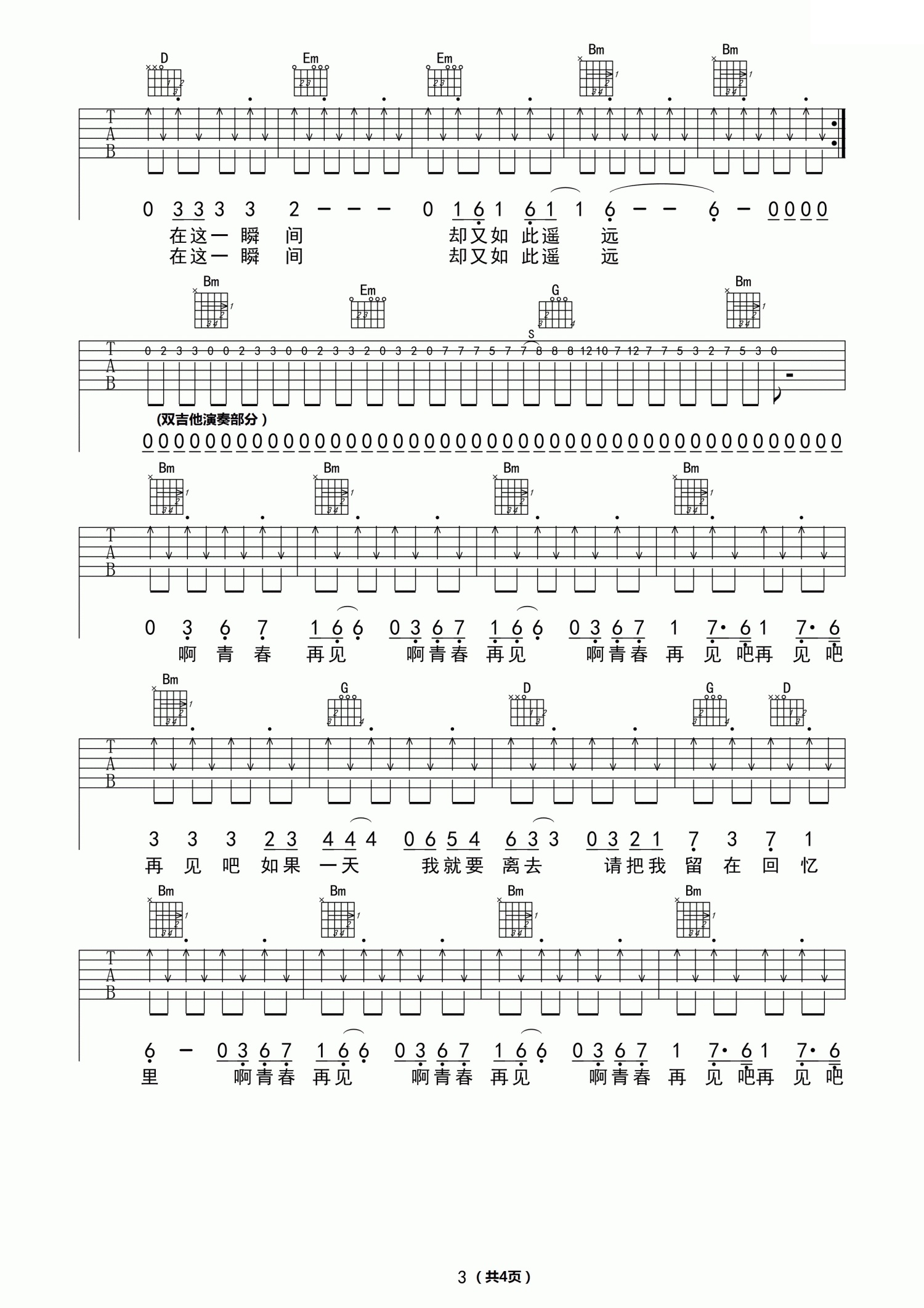 曲谱介绍: E调版《青春再见》吉他弹唱六线谱
