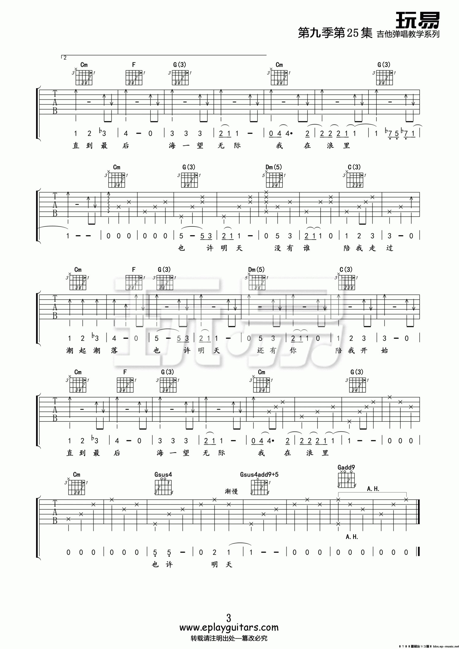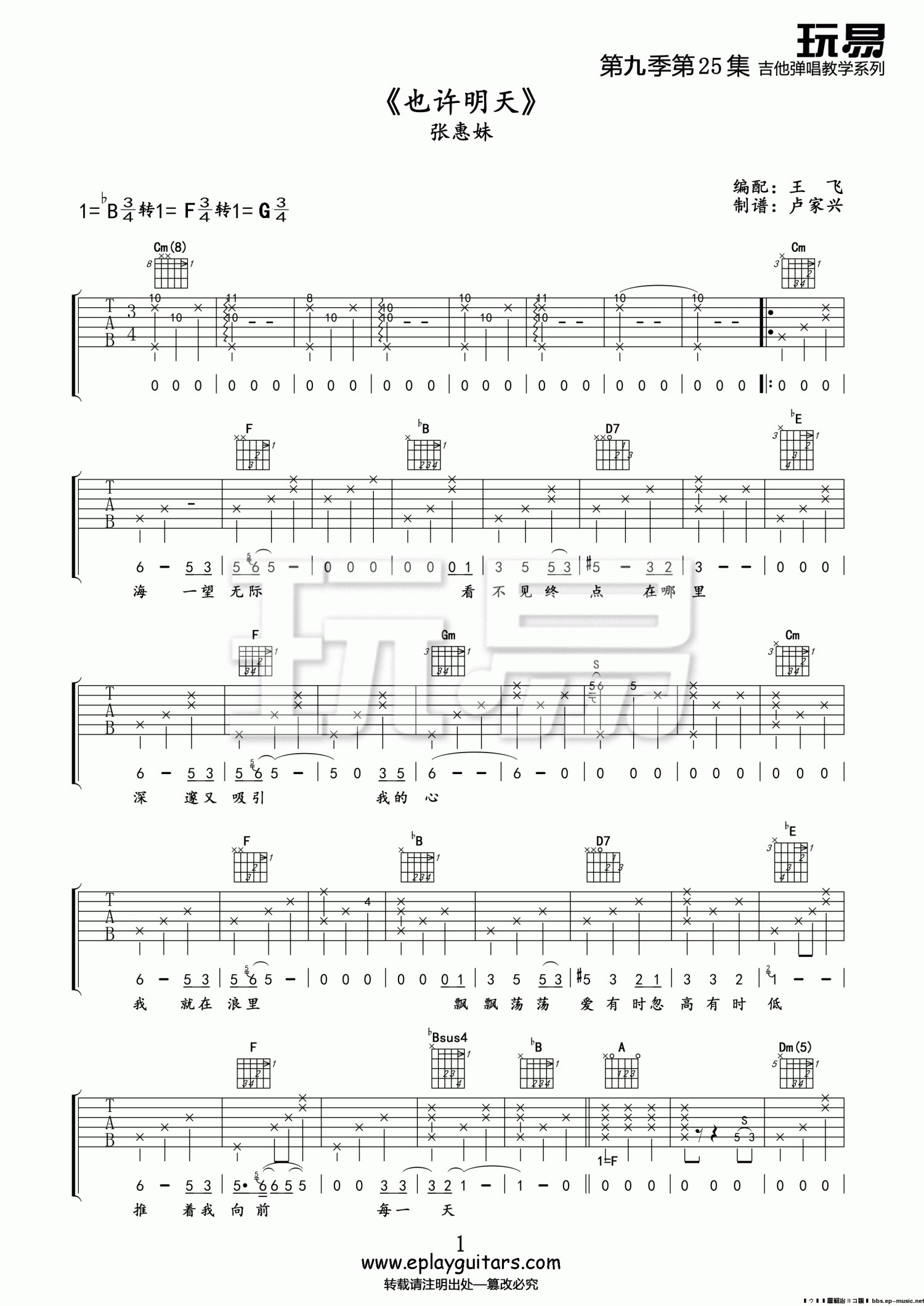 曲谱介绍: bB调版《也许明天》吉他弹唱六线谱