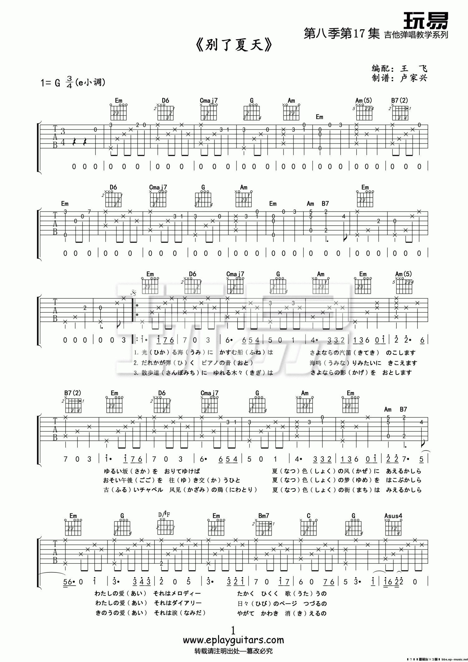 曲谱介绍: G调版《别了夏天》吉他弹唱六线谱