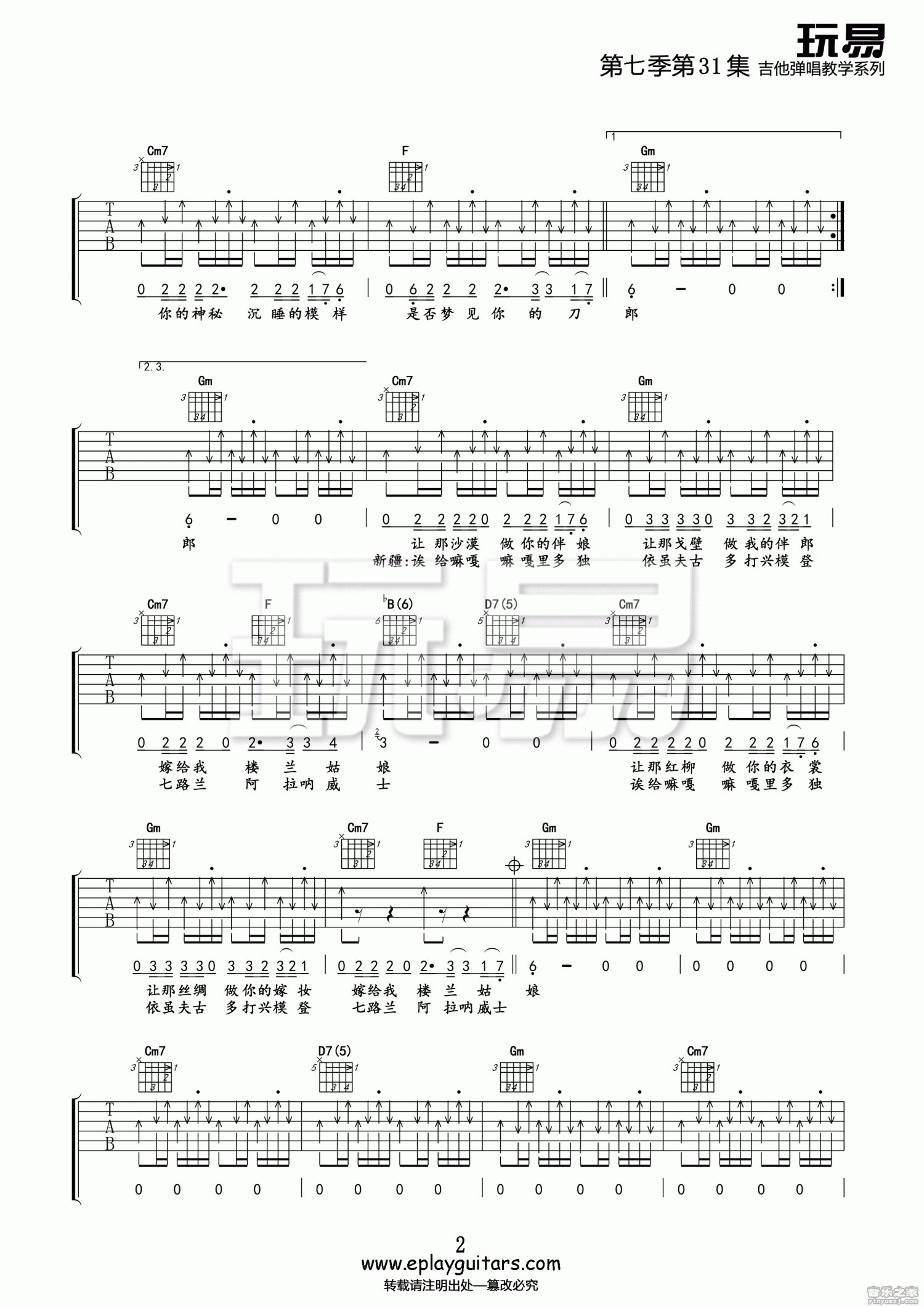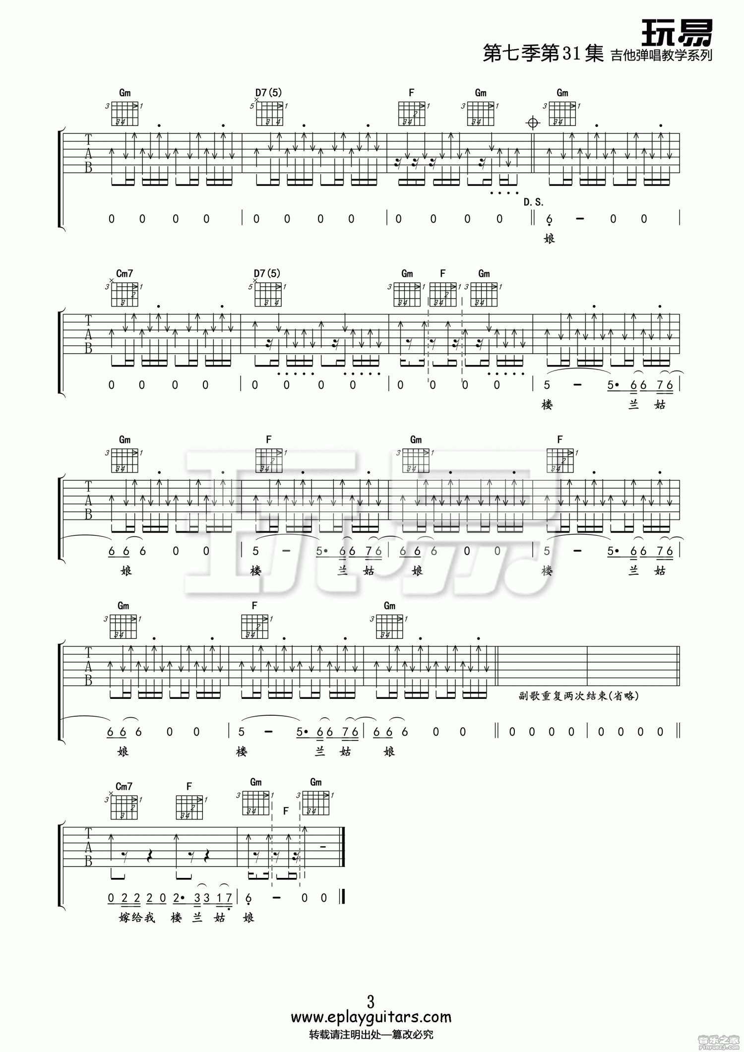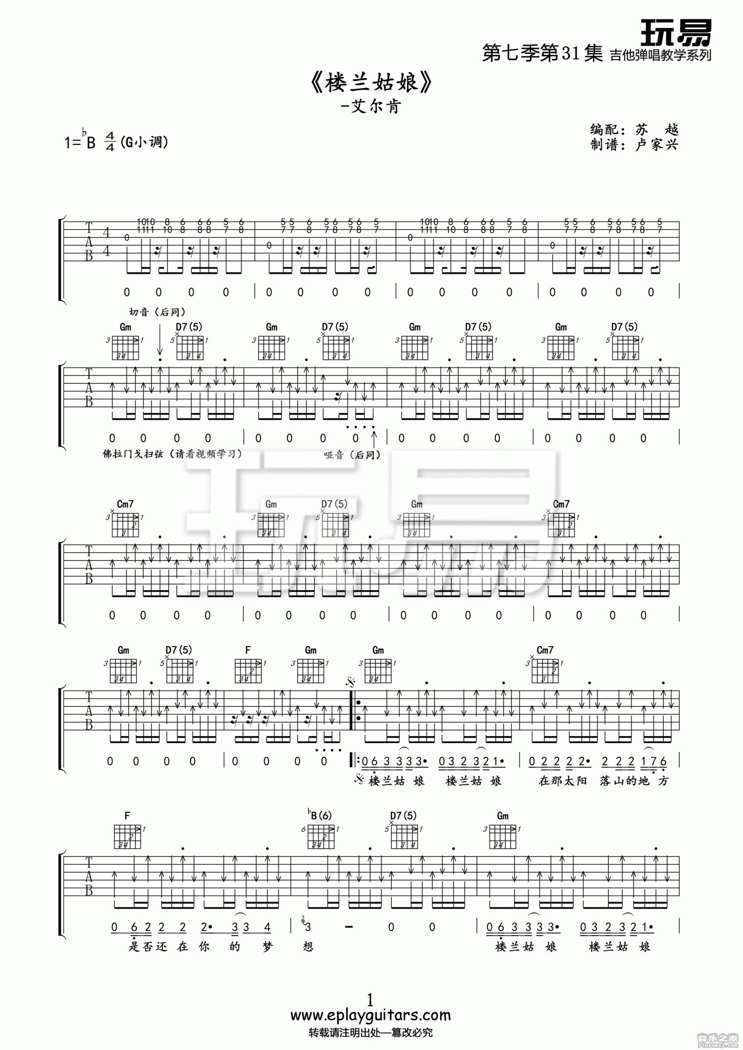 曲谱介绍: bB调原版《楼兰姑娘》吉他弹唱六线谱